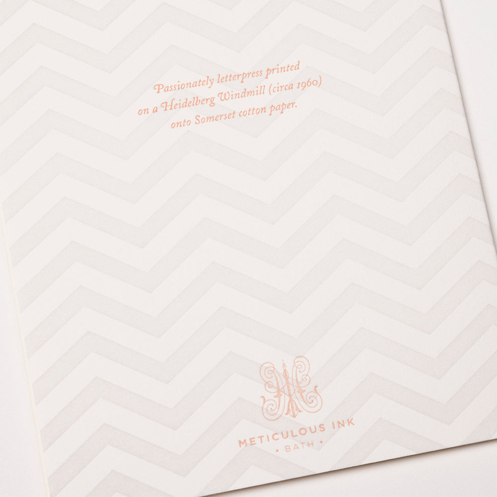 Each single card is letterpress printed in pale grey and mid pink ink onto our very own Walcot Wove 300gsm card with a pale grey, wallet flap, C6 envelope.