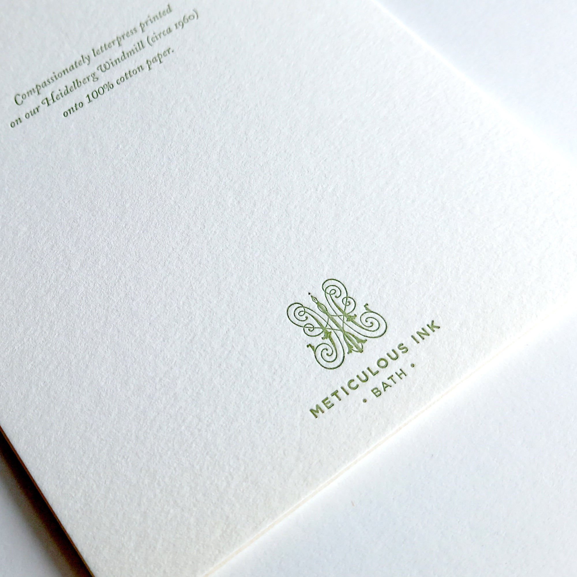 Each single card is letterpress printed onto our very own Walcot Wove 300gsm, 100% cotton card and comes with a Mid Green wallet flap envelope.