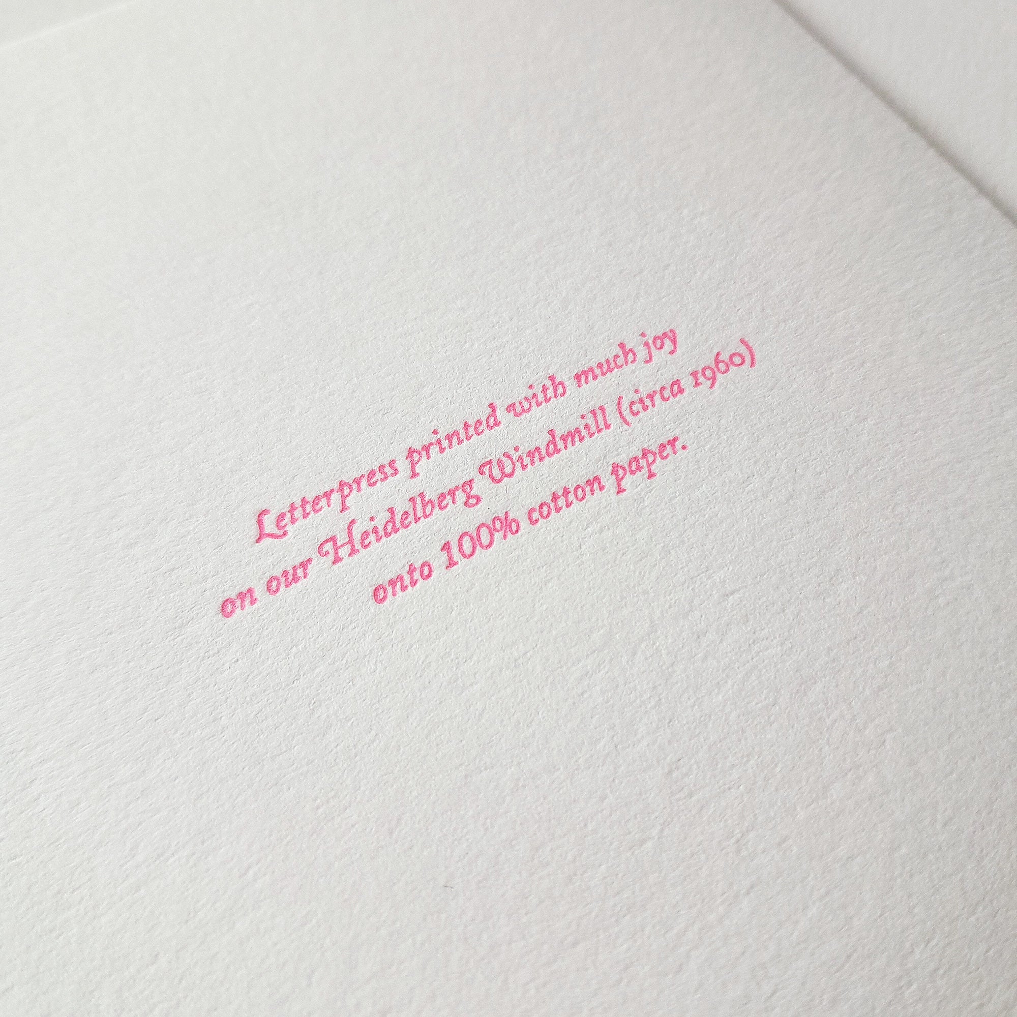 Each single card is letterpress printed onto our very own Walcot Wove 300gsm card with a tissue lined, C6 envelope.