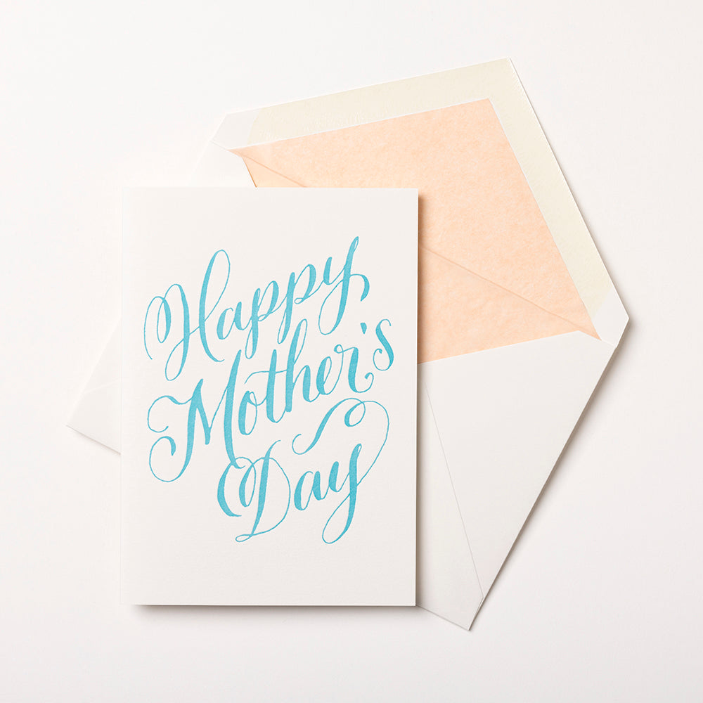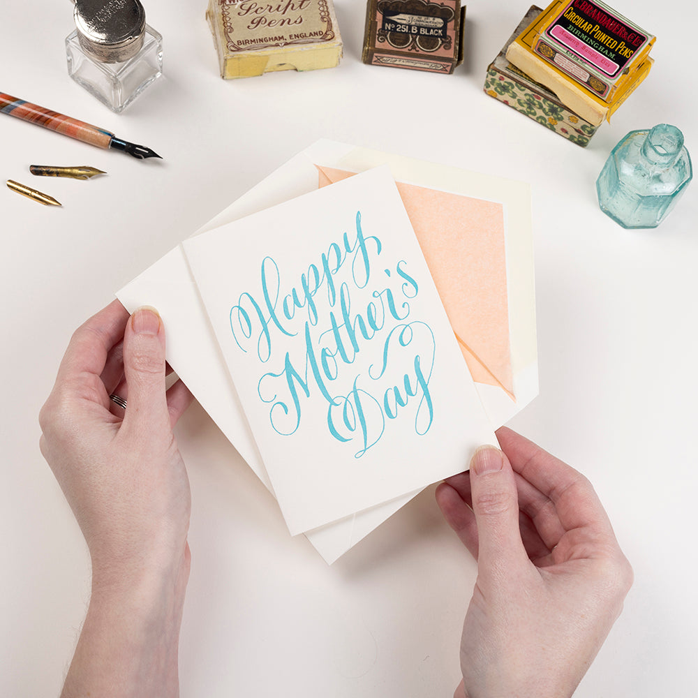 Each single card is letterpress printed in tuquoise blue onto our very own Walcot Wove 300gsm card with a peach tissue lined, C6 envelope.