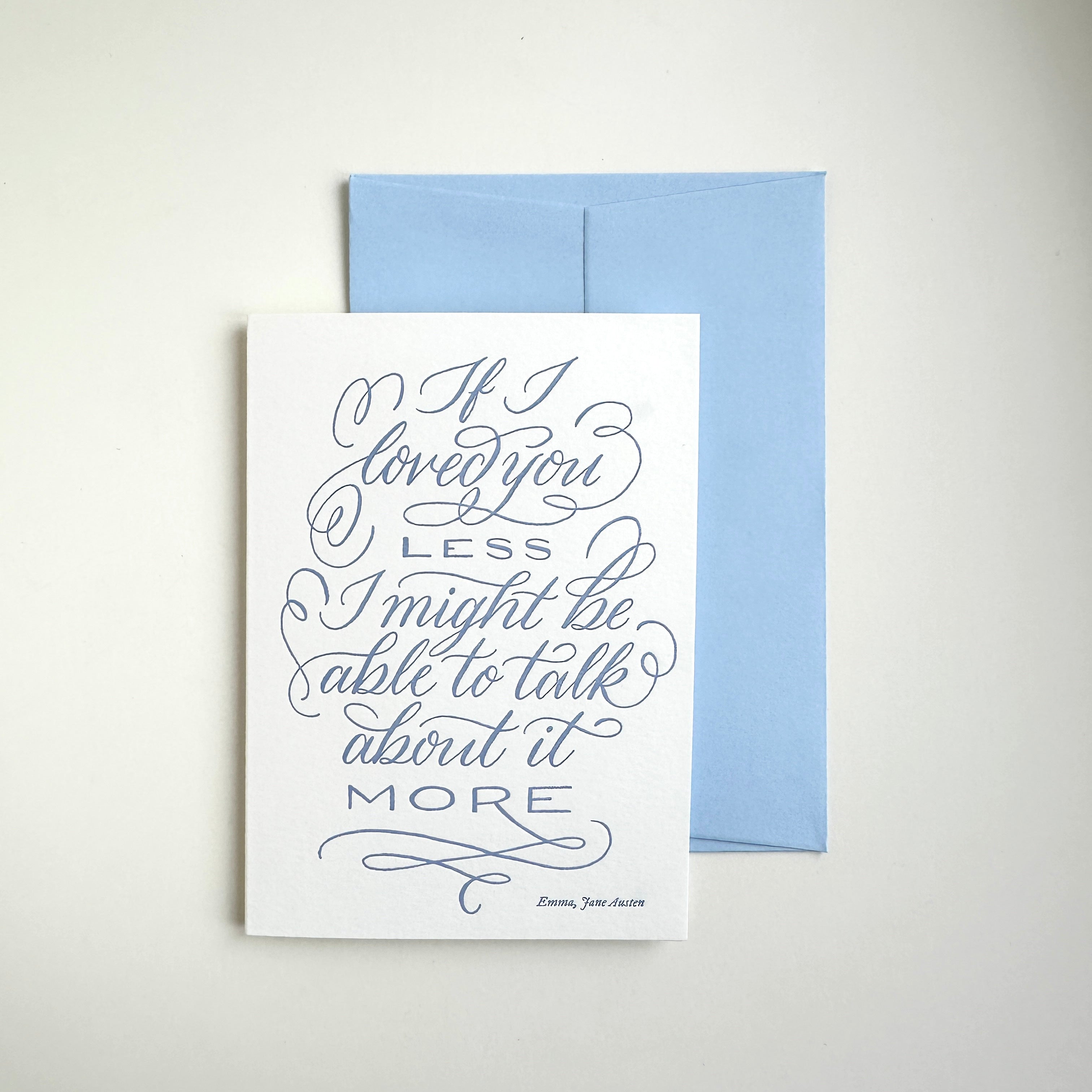 Each single card is letterpress printed with soft blue ink onto our delightful 300gsm card. Supplied with an azure blue, C6 envelope.