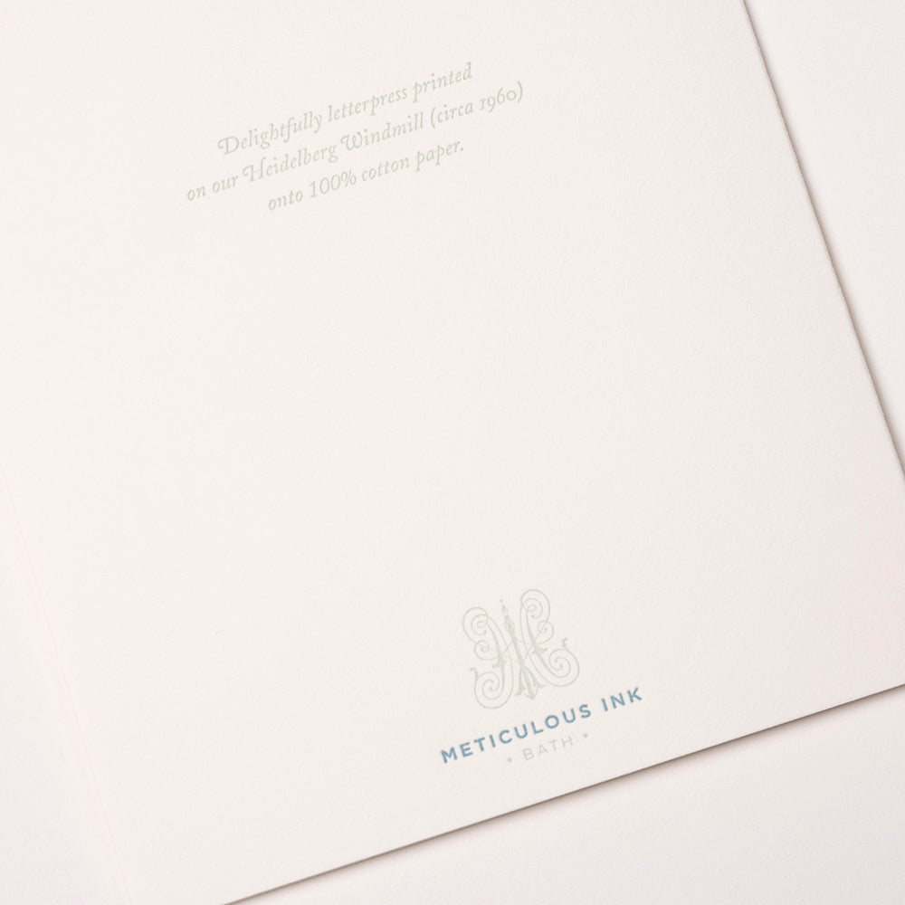 Each single card is letterpress printed in two colours onto 300gsm, 100% cotton card. With a willow tissue lined, C6 envelope.