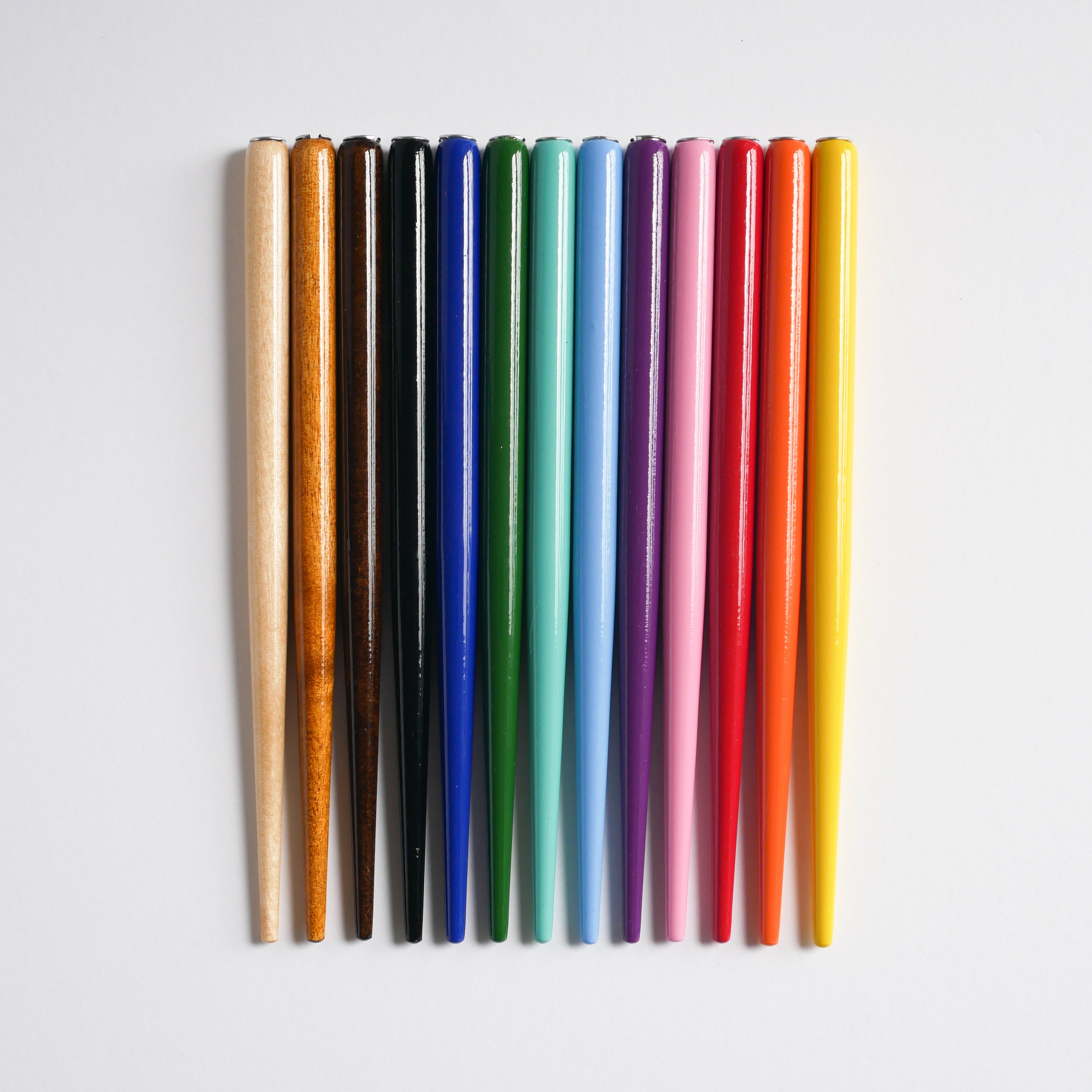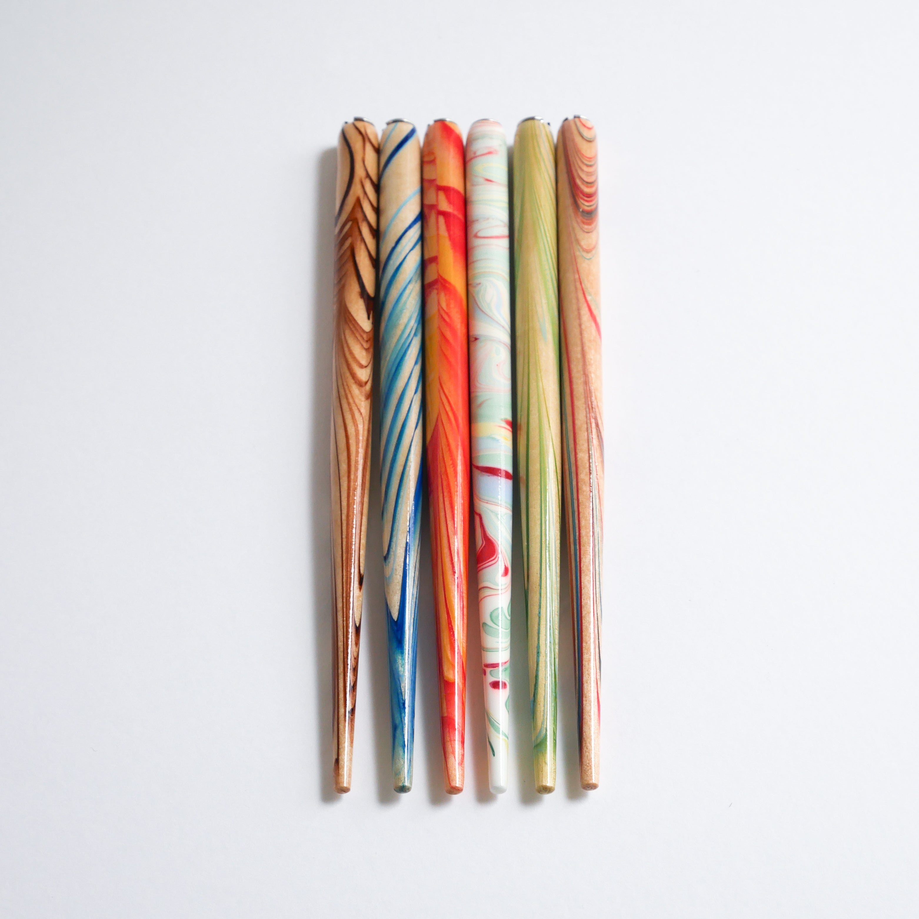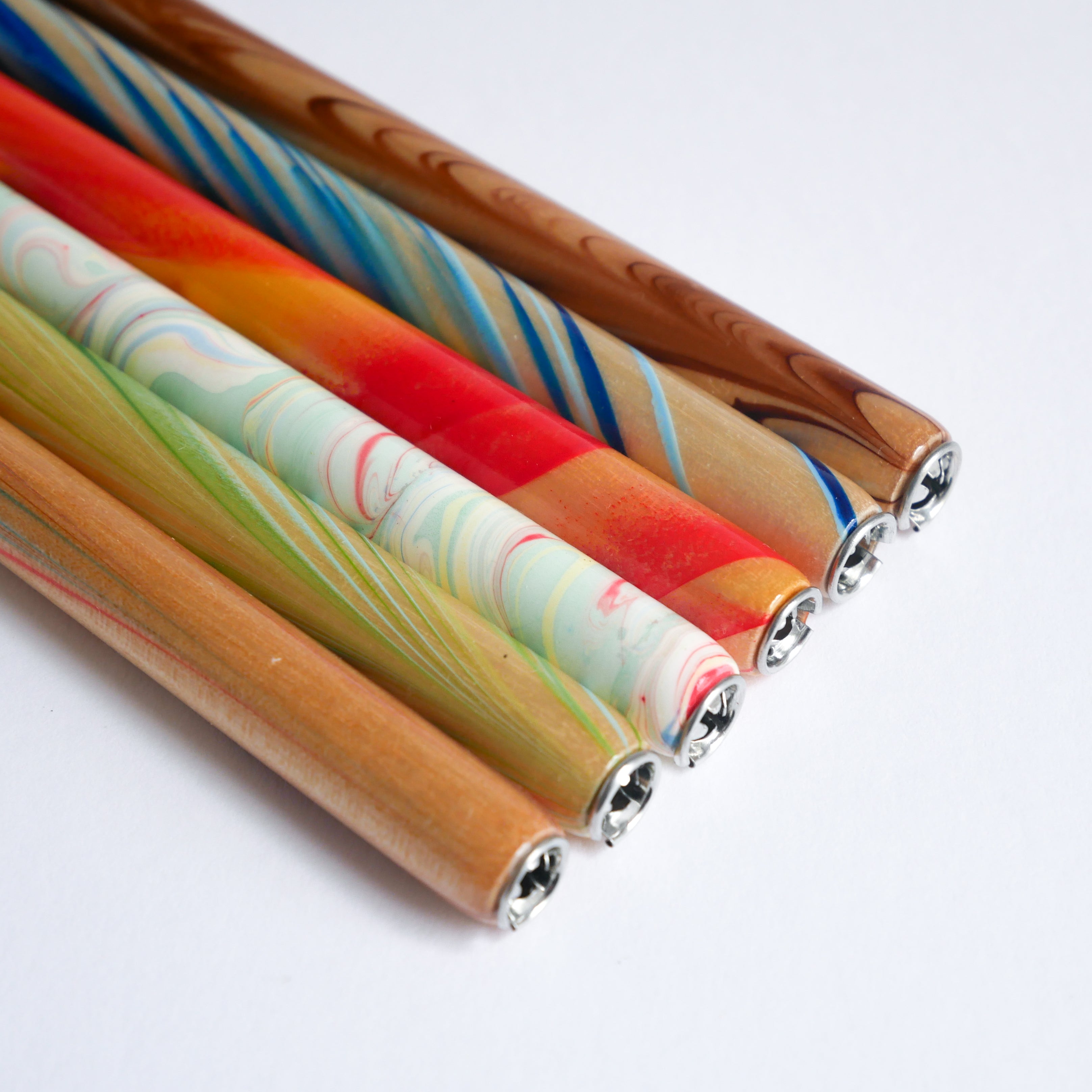 These straight wooden nib holders are great for beginners and for creating modern and upright calligraphy. Available in natural wood, lots of beautiful solid colours, plus unique marbled patterns, all of these are varnished for longevity.
