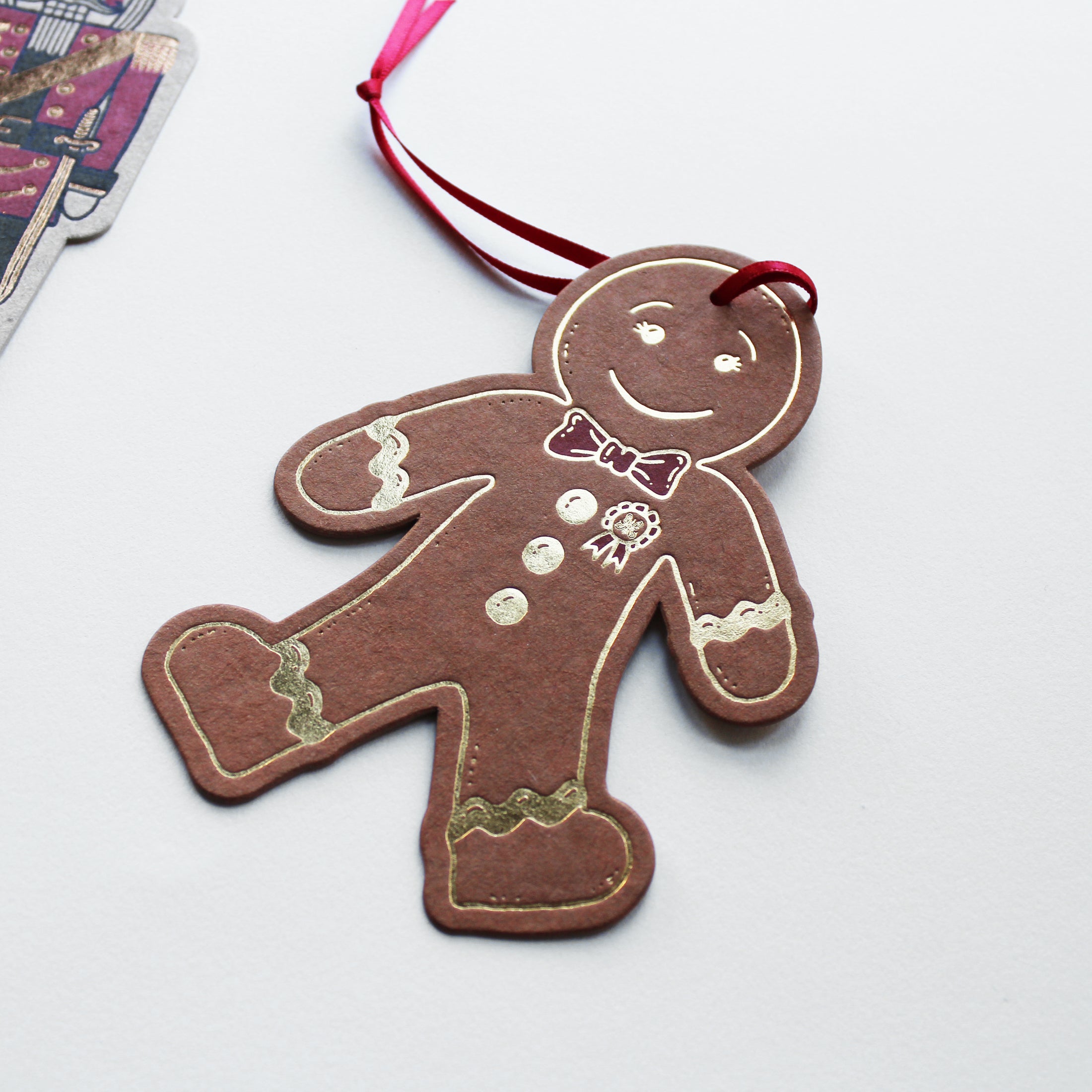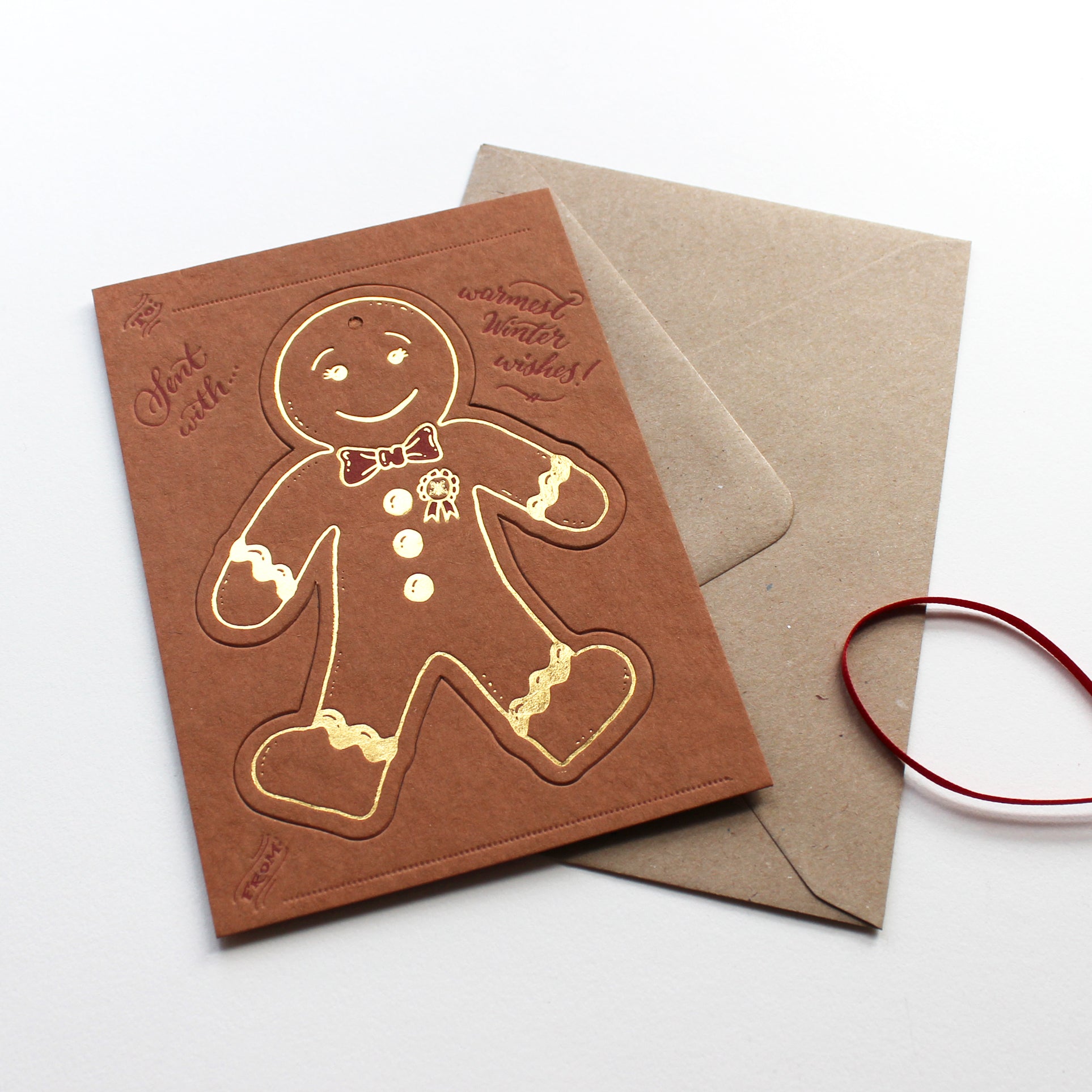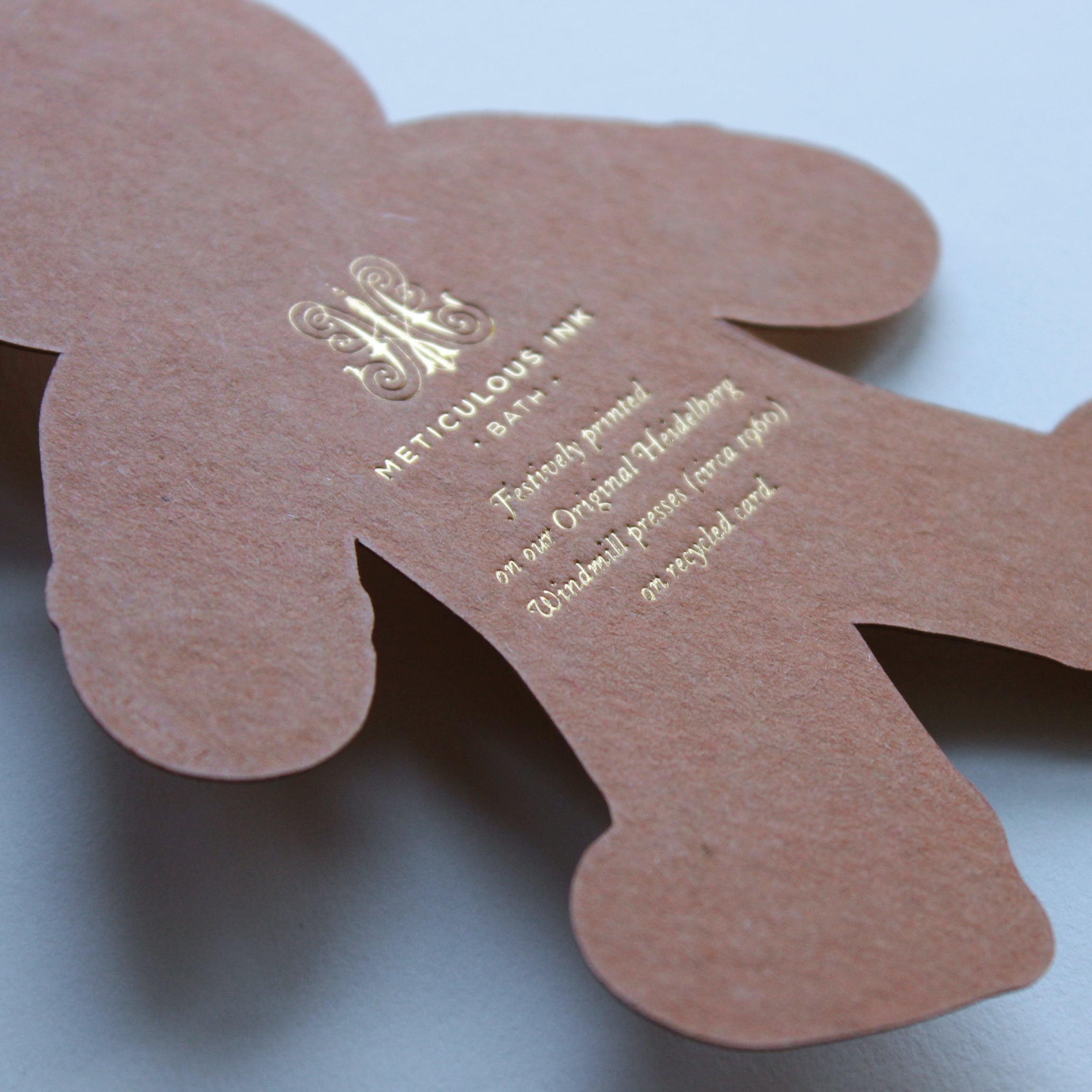 This gingerbread person is letterpress printed, then foiled, before being die-cut, all at our printworks in Bath.