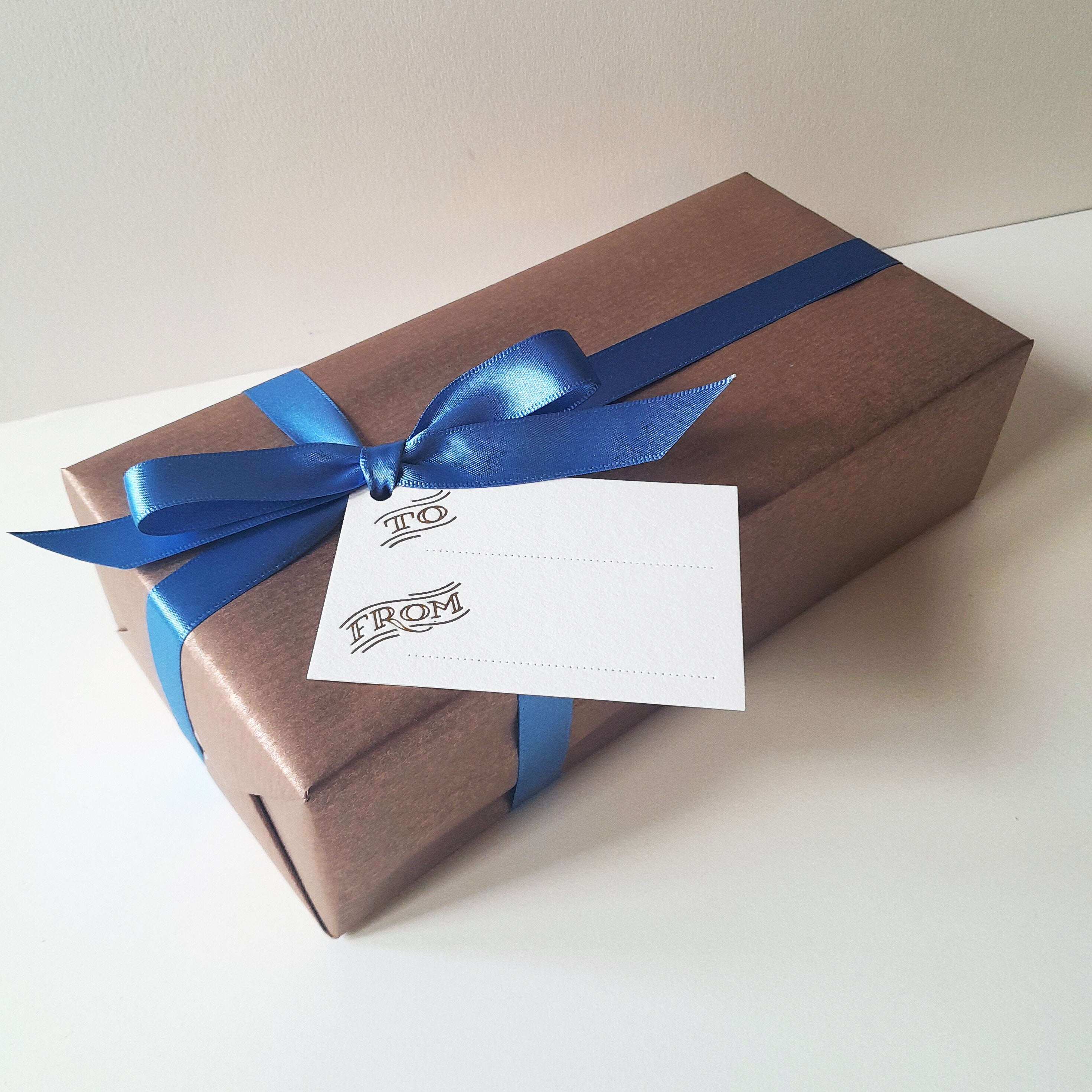 All the items in your order will be meticulously wrapped as one gift in golden kraft paper and finished with a luxurious ribbon and a personalised, hand lettered letterpress tag.