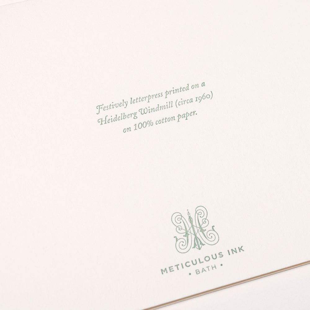 All our cards are illustrated, designed and printed in house at Meticulous Ink, Bath, UK. Each card has been lovingly letterpress and foil printed on a 1960 Heidelberg Windmill.