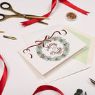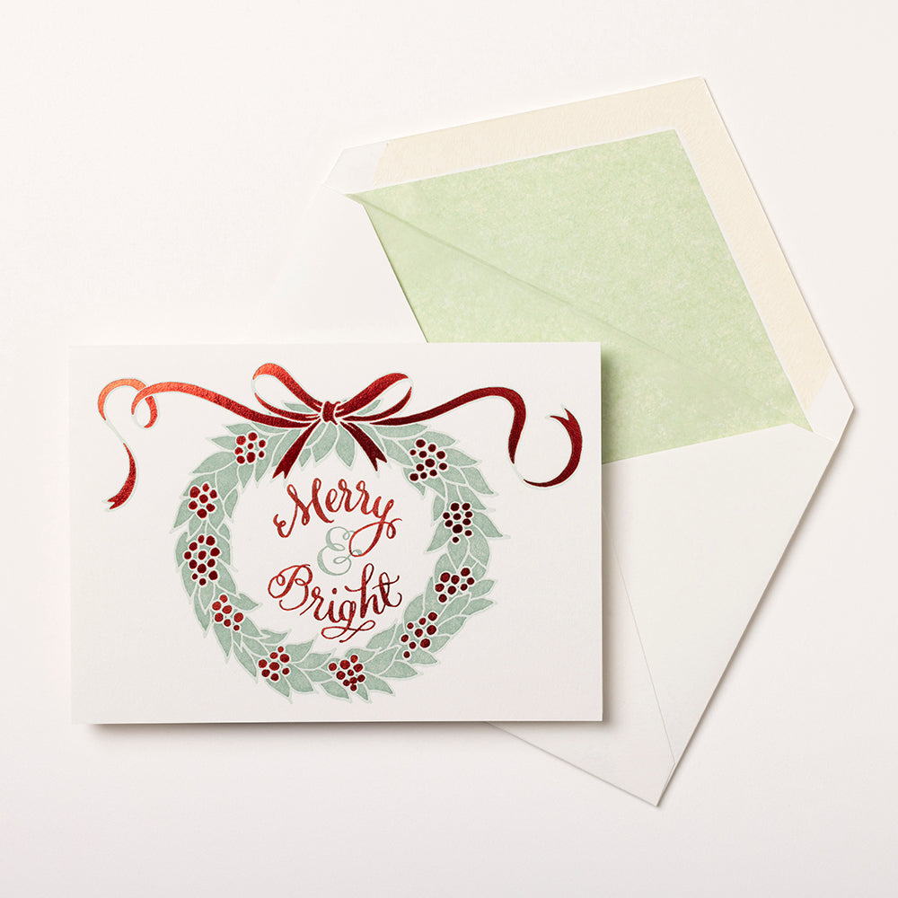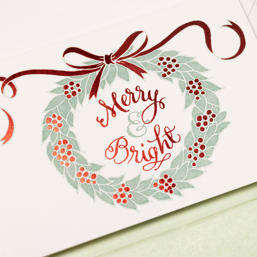 A beautiful illustrated wreath adorned with bright shiny berries and tied with red ribbon, to ensure Merry & Bright Christmas wishes.