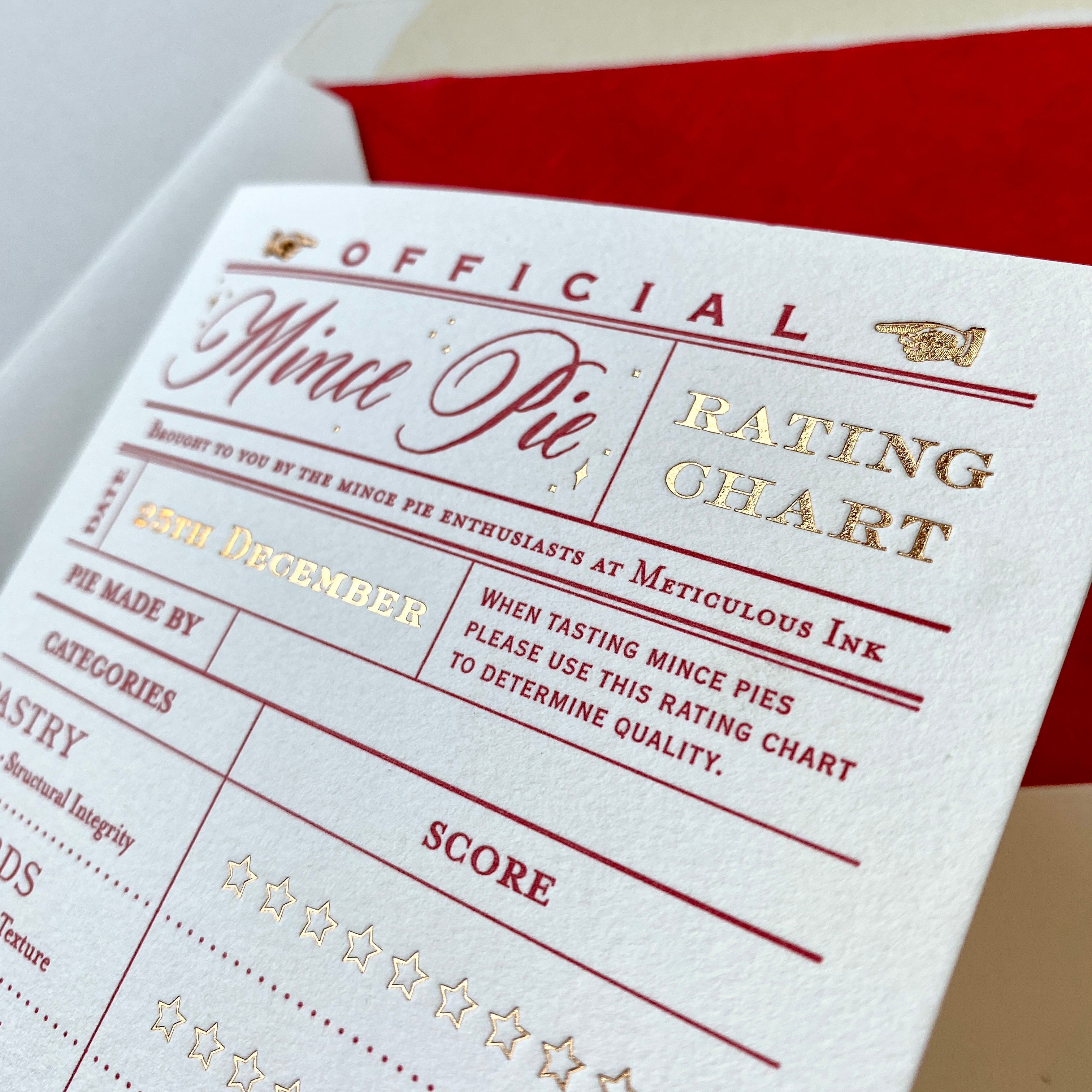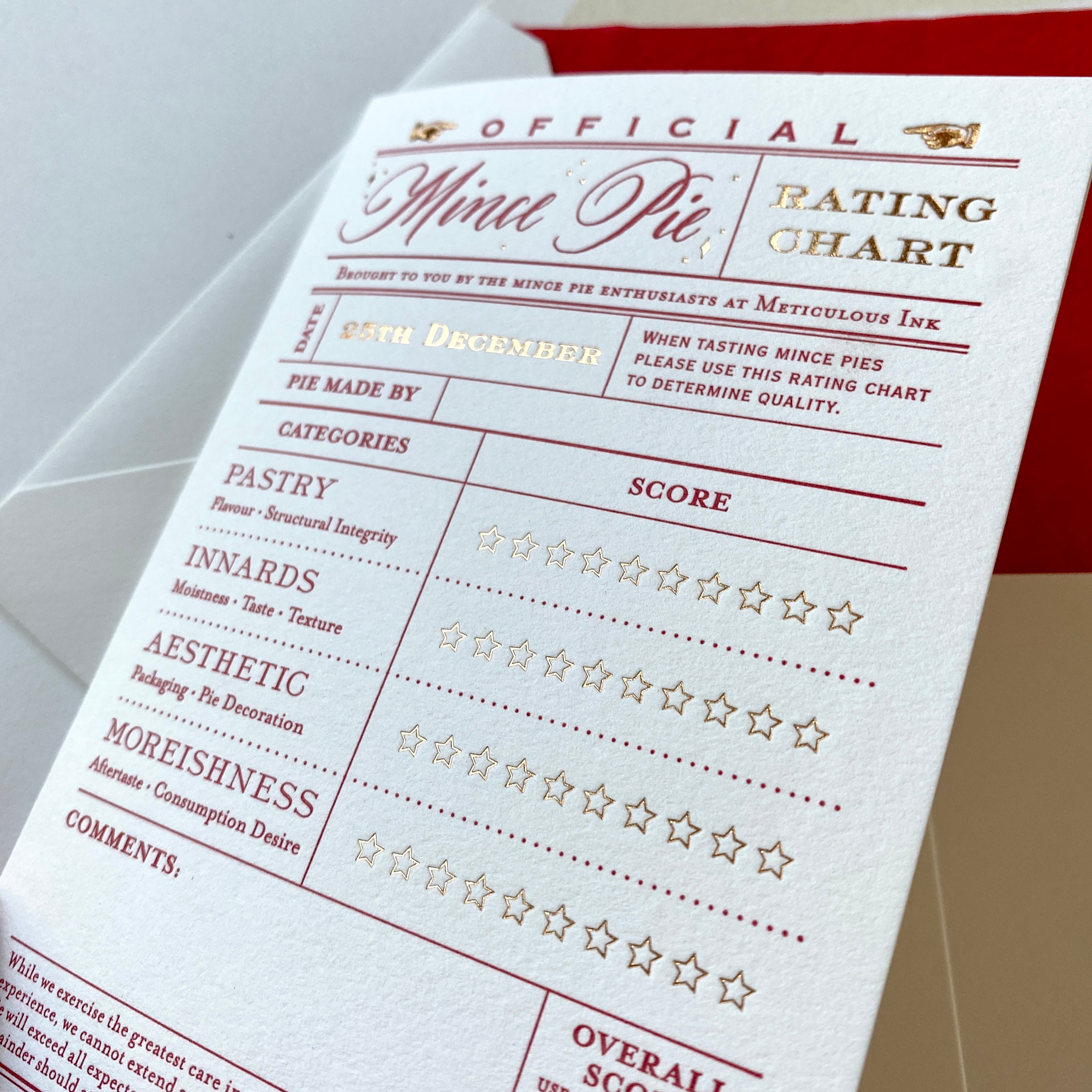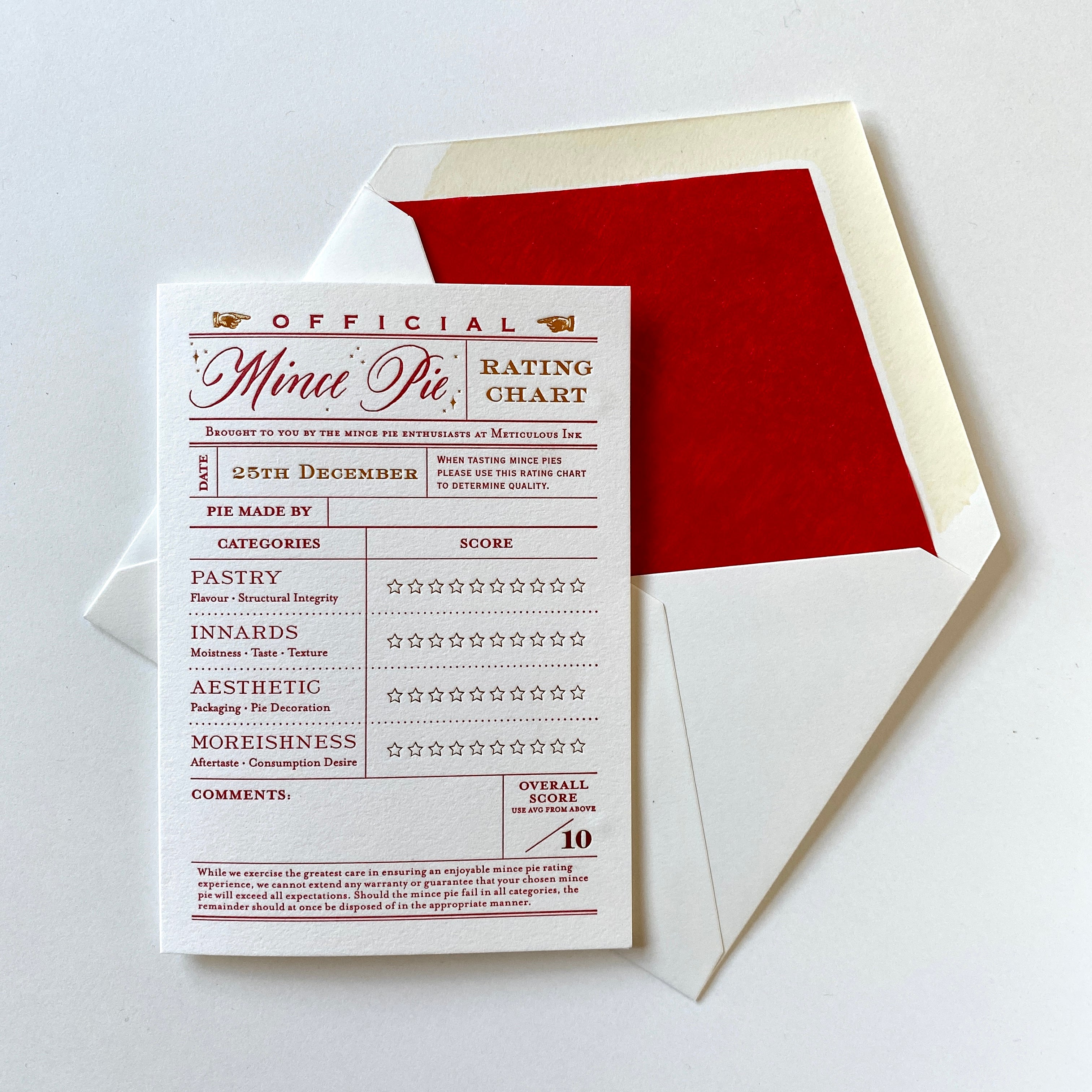 The Official Mince Pie rating system is here. Brought to you by the mince-pie adjudicators at Meticulous Ink. After years of meticulously rating mince pies, we bring you your own rating card to join in the fun. Rate your own mince pie using our very serious star system with a comments section and average score out of ten marked at the bottom.