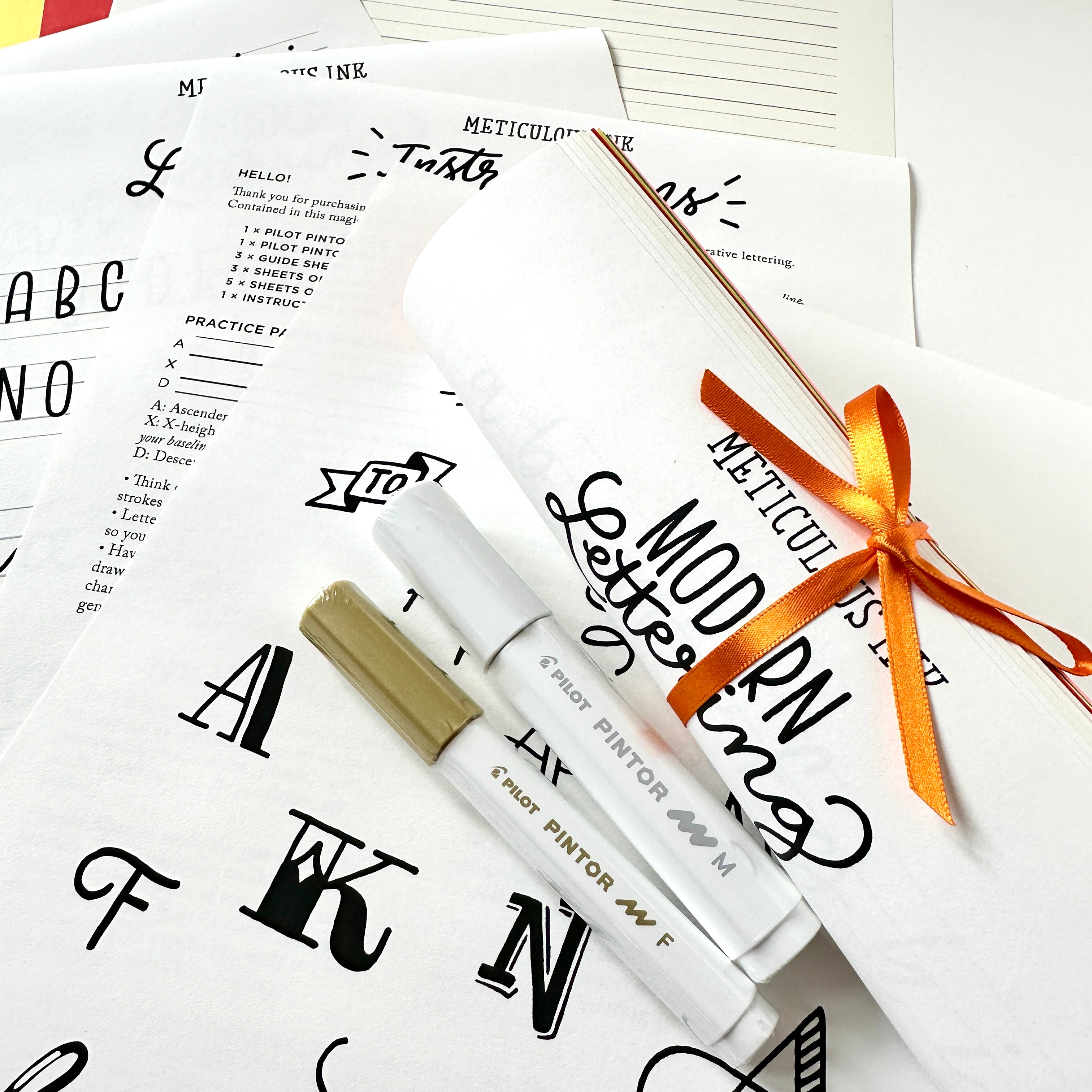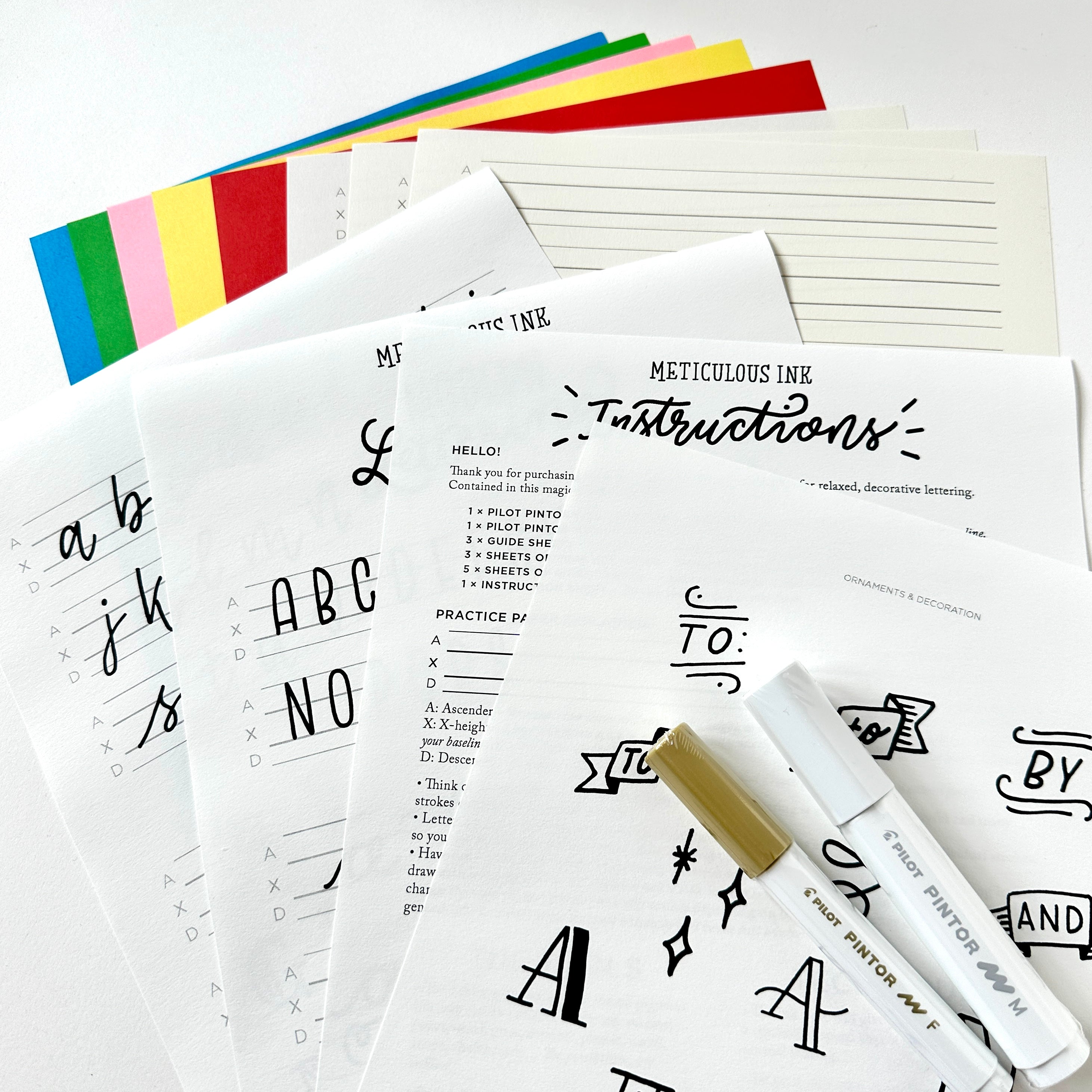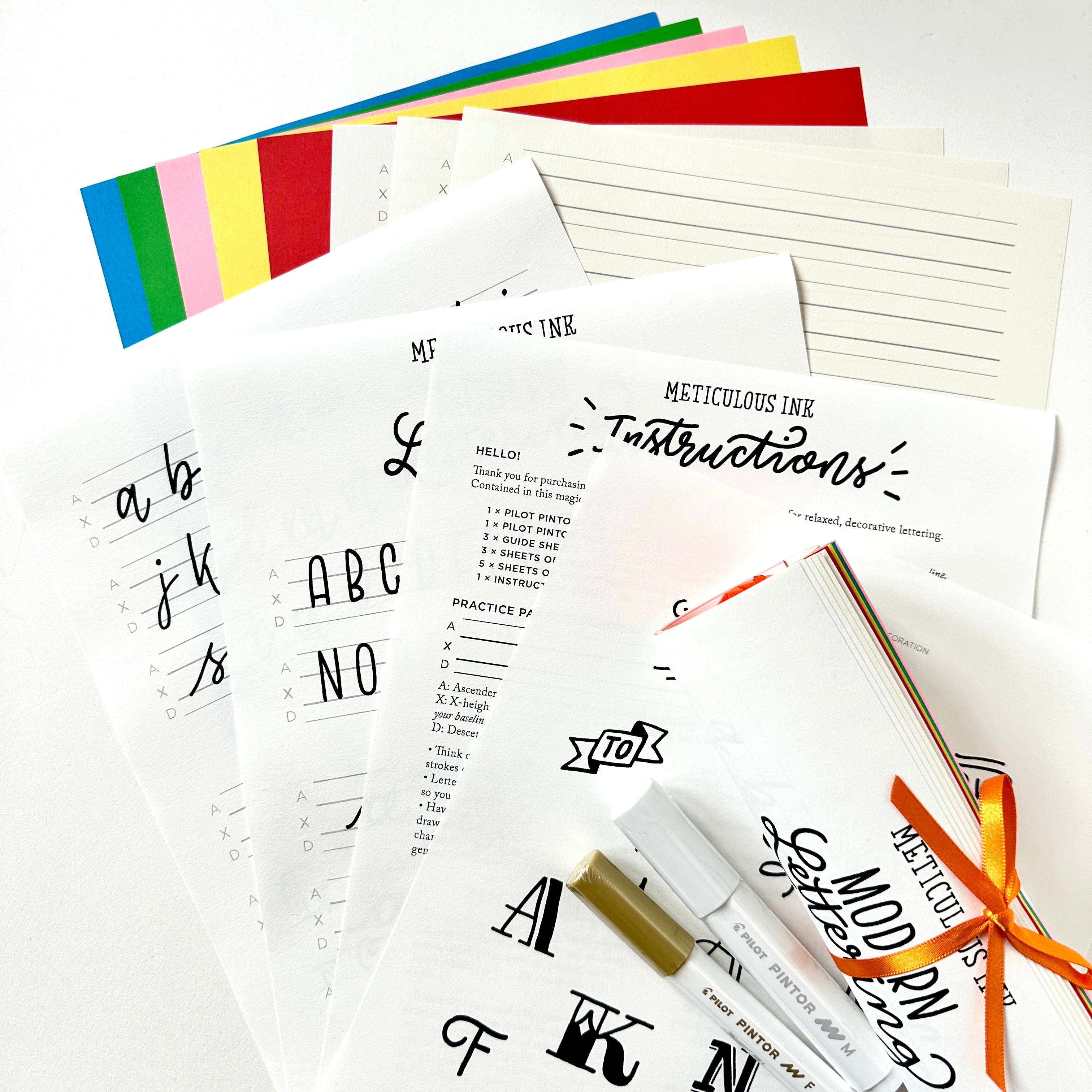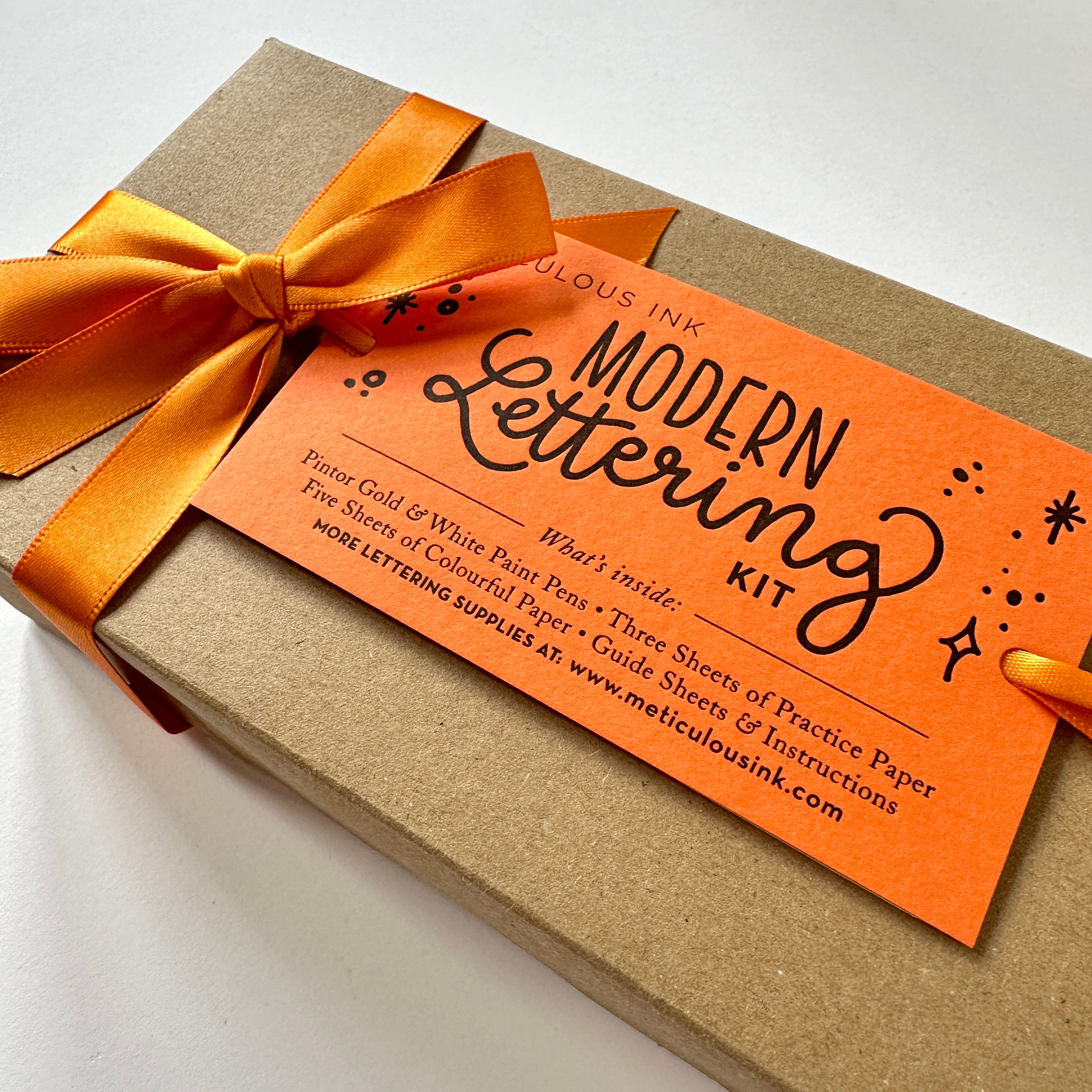 This kit comes packed in a beautifully ribboned box, finished with a colourful tag. It makes the perfect gift both as an accessible introduction to lettering, and as a way to expand your calligraphy or brush lettering tool kit.