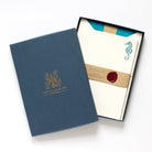 Each box set contains 15 printed A5 sheets, letterpress printed in teal ink onto our very own 160gsm, 100% cotton paper. With 15 teal tissue-lined C6 envelopes, and 5 plain continuation sheets, all presented in a beautiful box and finished with our wax seal.