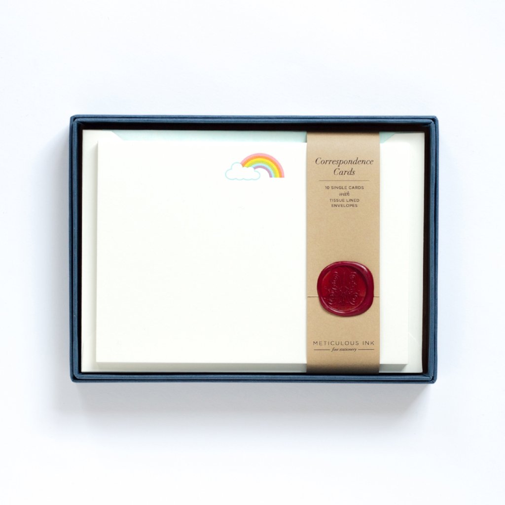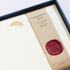 Each box set contains 10 A6 correspondence cards with a rainbow motif, letterpress printed onto 300gsm, 100% cotton card. With 10 matching light blue tissue lined, C6 envelopes. All presented in a beautiful box and finished with our wax seal.