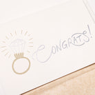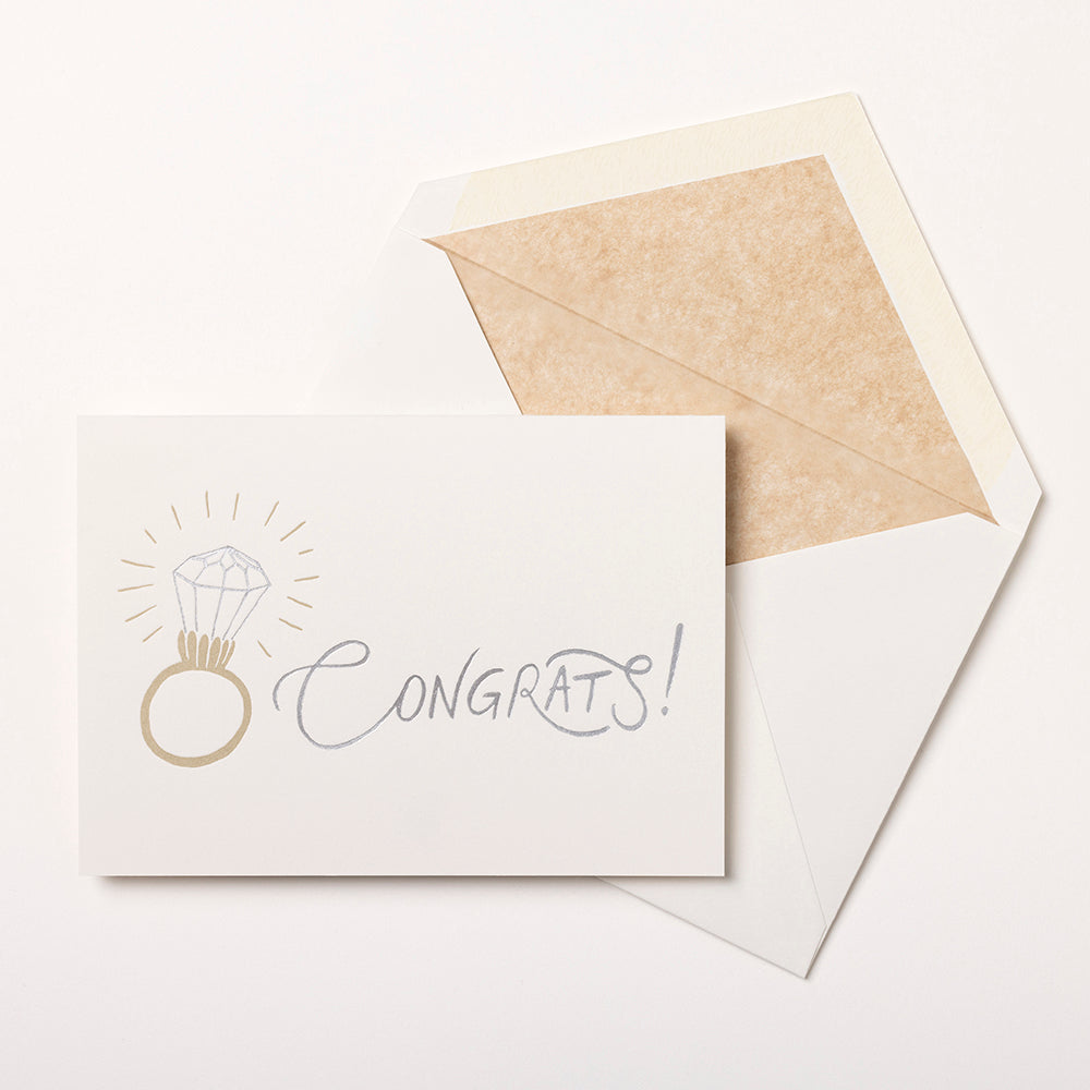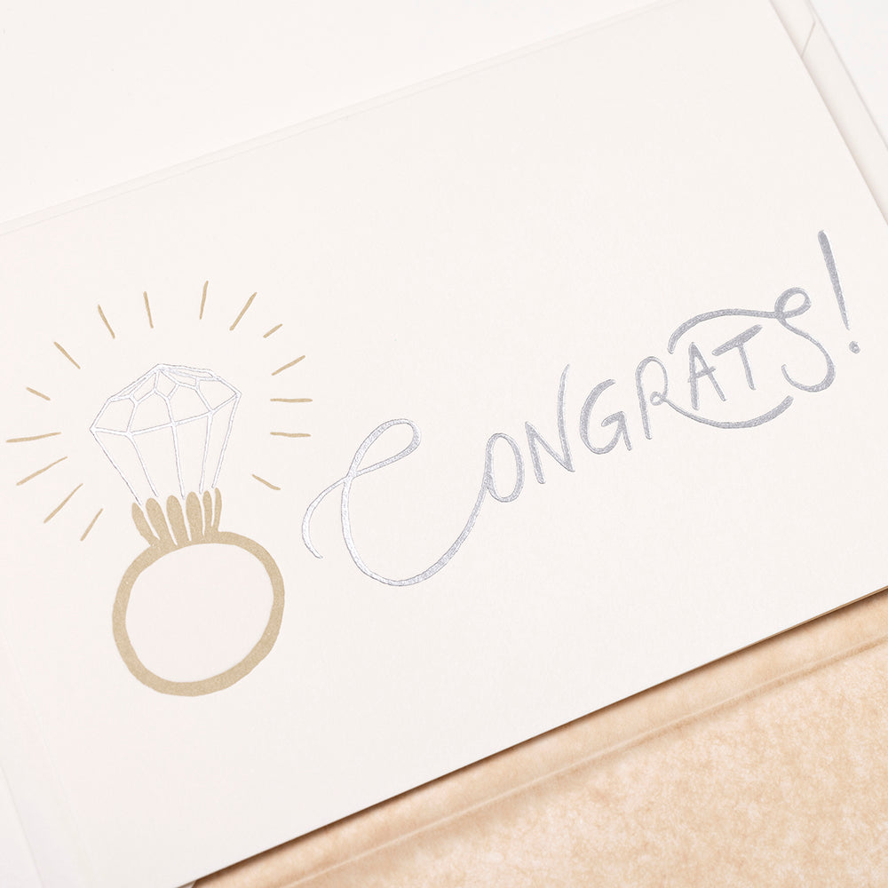 A simple and subtle congrats card perfect for an engagement or wedding day, complete with gigantic silver foiled ring!