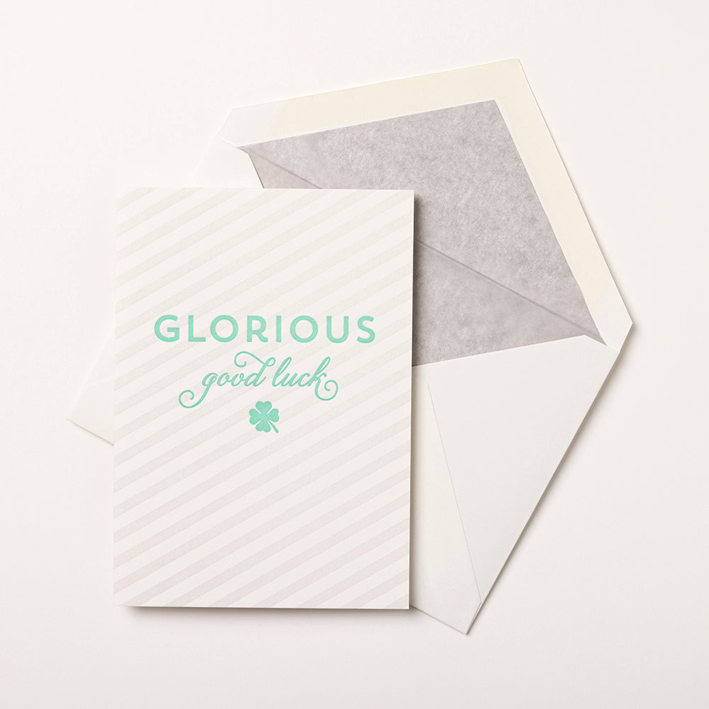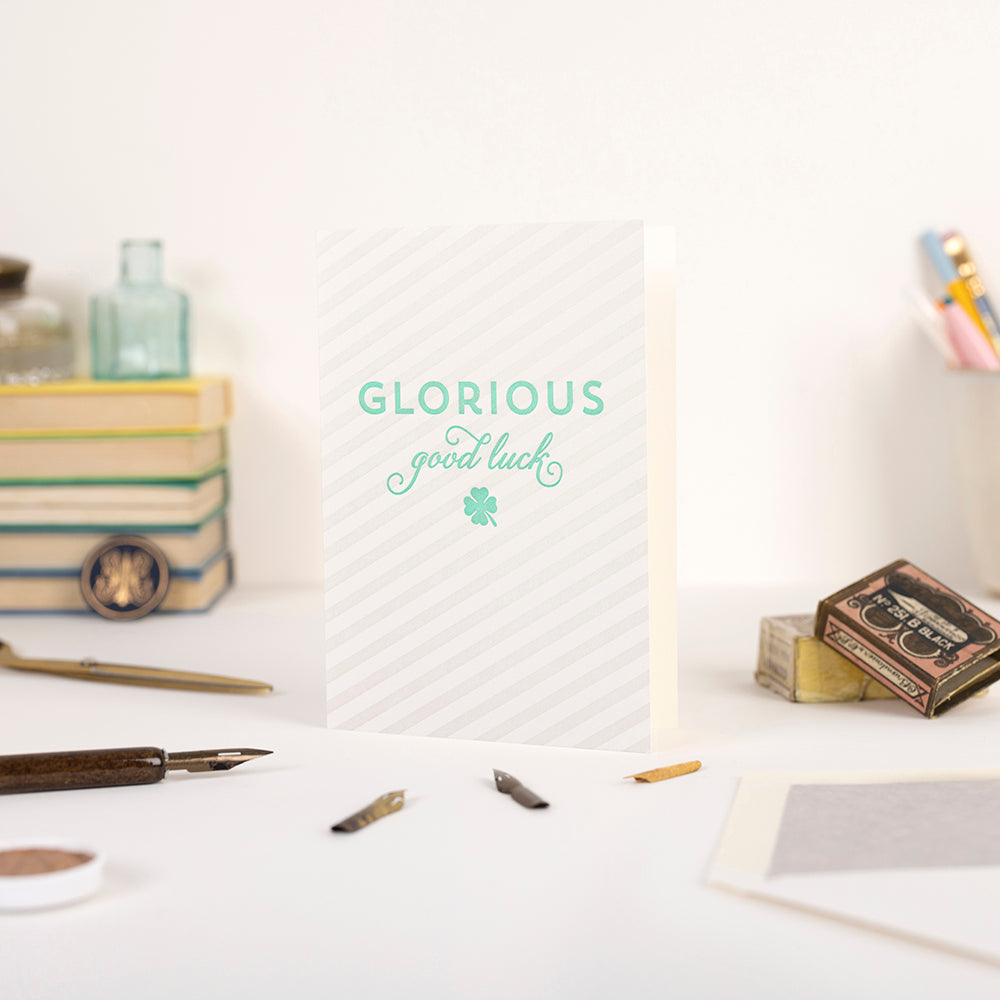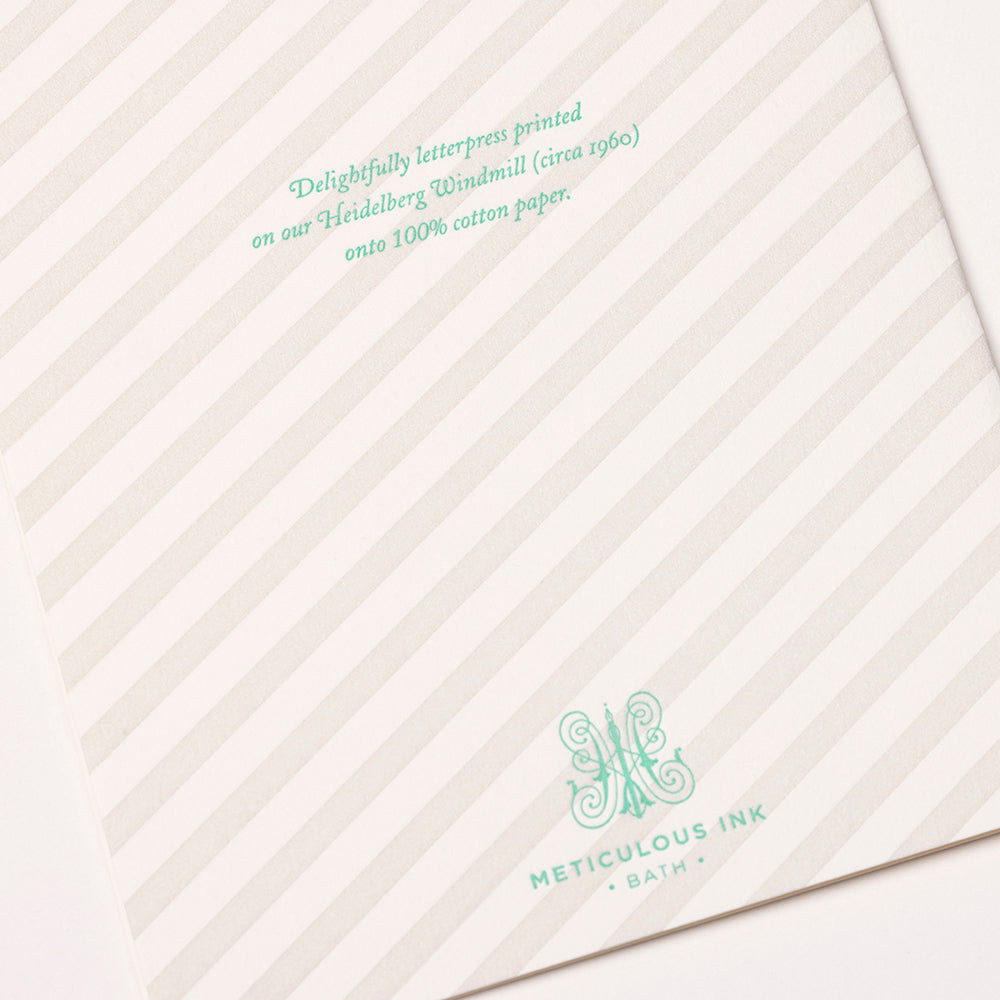 Each single card is letterpress printed with light grey stripes, then with emerald ink onto our very own Walcot Wove 300gsm card with a light grey tissue lined, C6 envelope.