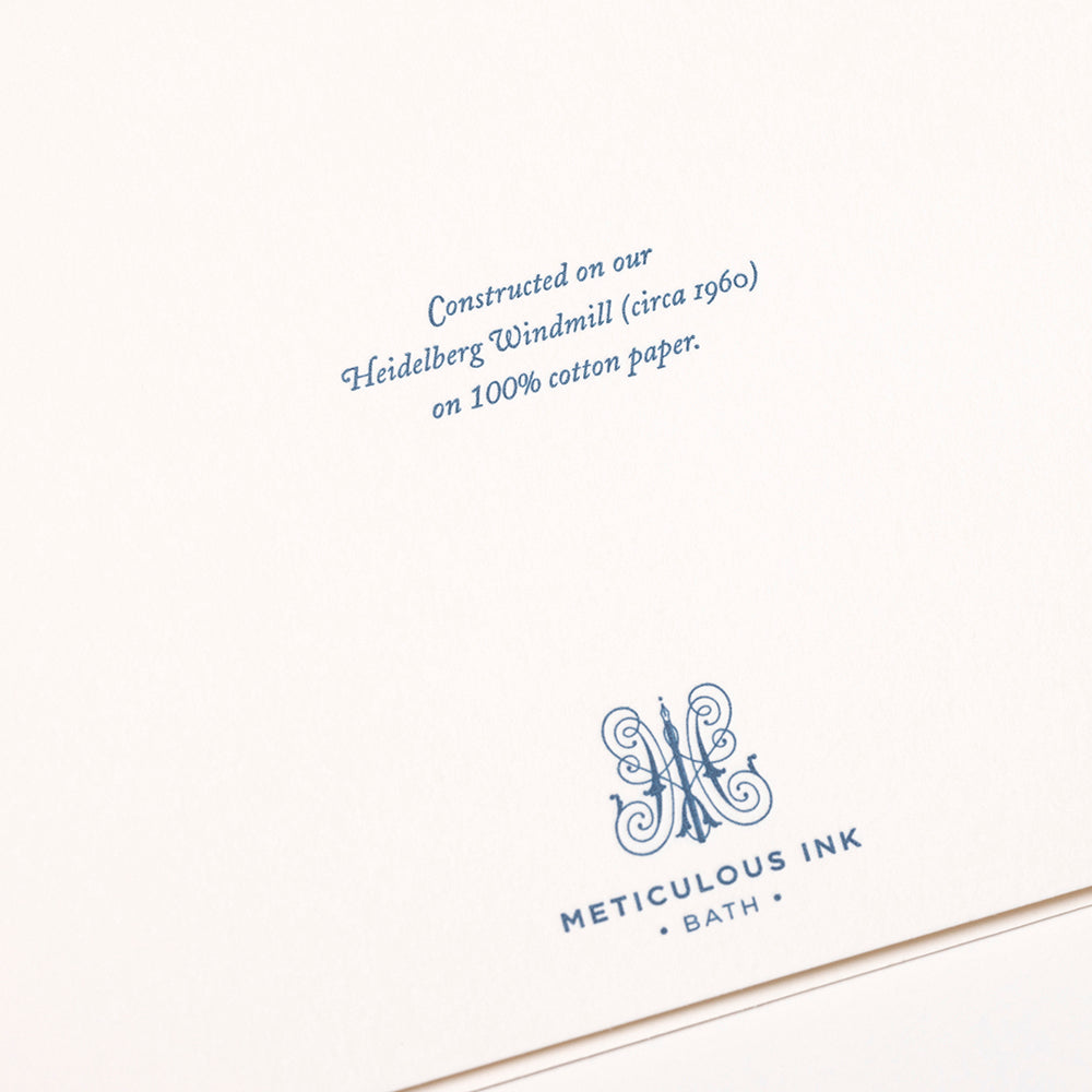 Each single card is letterpress printed in blue ink onto 300gsm, 100% cotton card. With a matching tan tissue lined, C6 envelope.