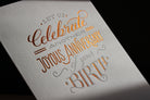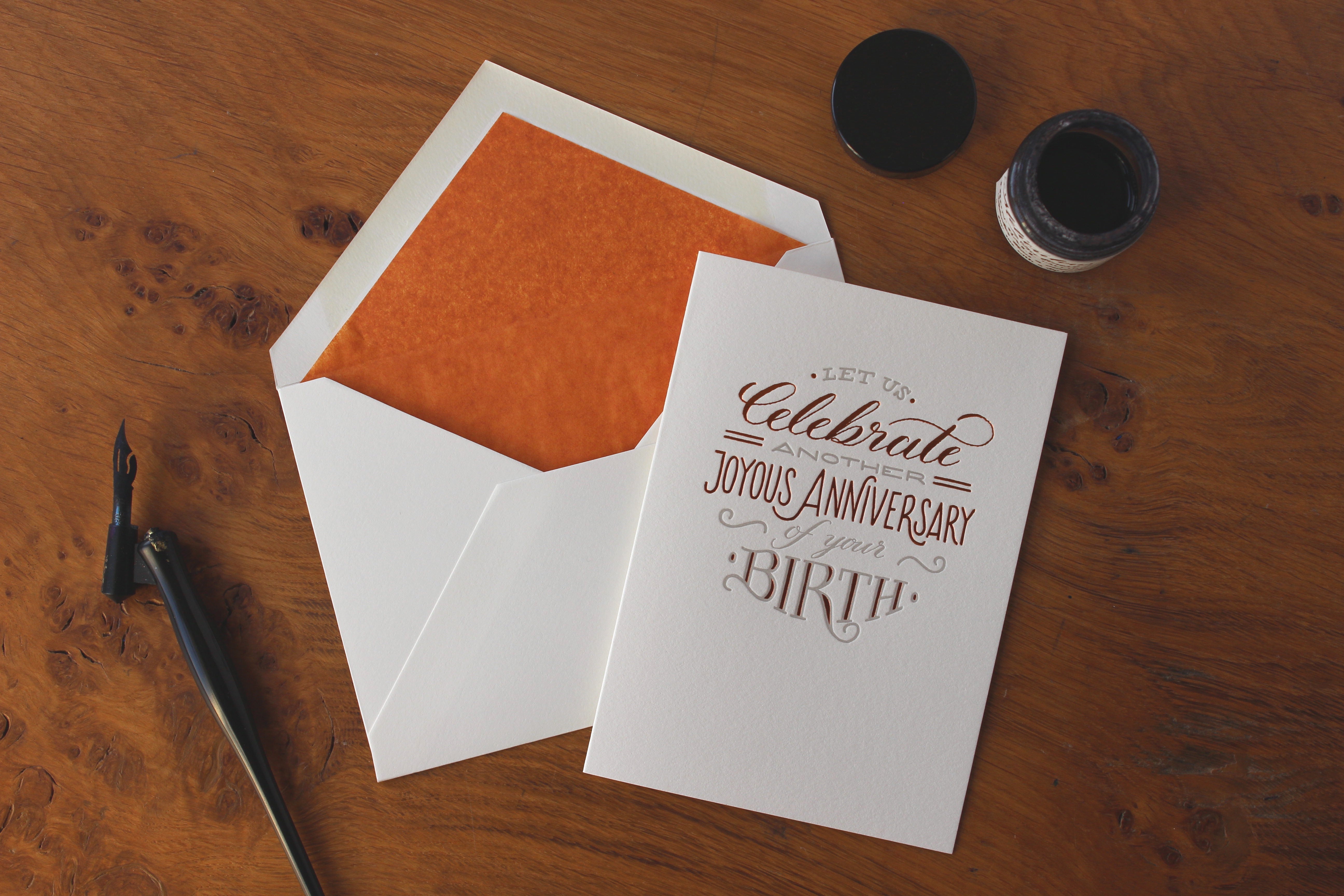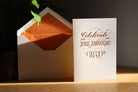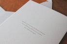 Each single card is letterpress printed in teal and foiled in deep copper onto 300gsm, 100% cotton card. With a burnt orange tissue lined, C6 envelope.