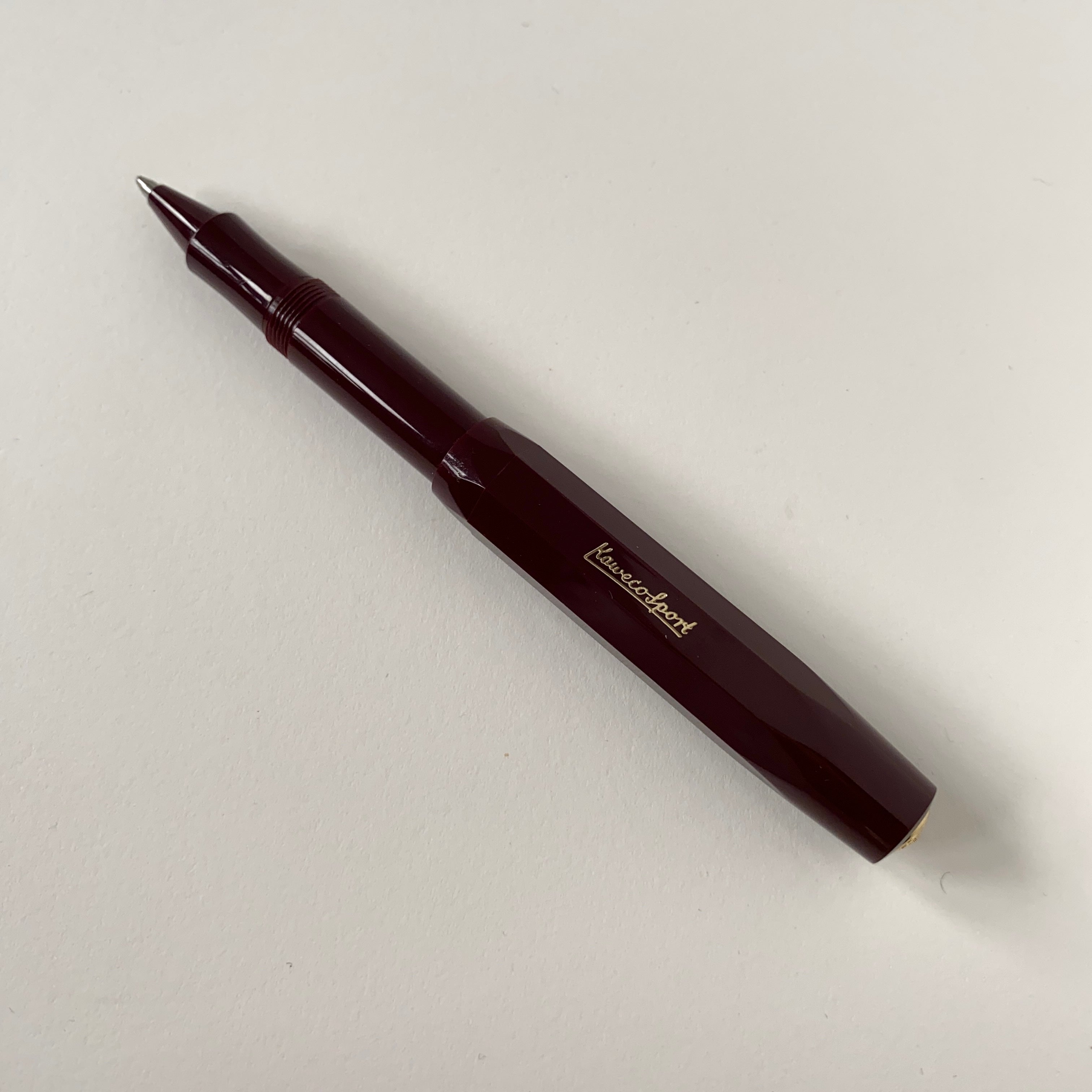 The Kaweco Sport rollerball pen measures only 10.5 cm when closed, but when the cap is mounted on top of the barrel it becomes a 13 cm-long, standard-sized pen, hence them being known as: "small in the pocket, large in the hand".