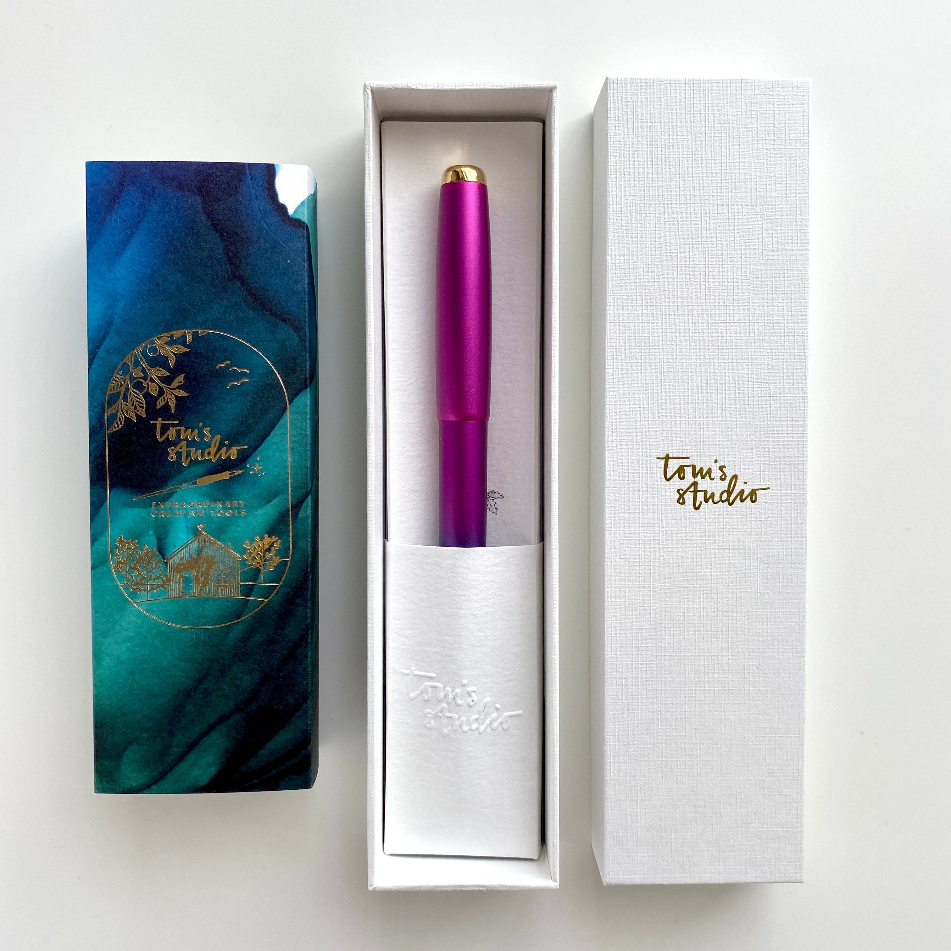A beautiful, UK made fountain pen with a semi flexible 14k gold plated nib - The Studio Fountain Pen by Tom's Studio is a masterpiece and utter delight to use. They've taken all the best bits of a calligraphy dip pen and applied them to this super slick fountain pen.