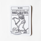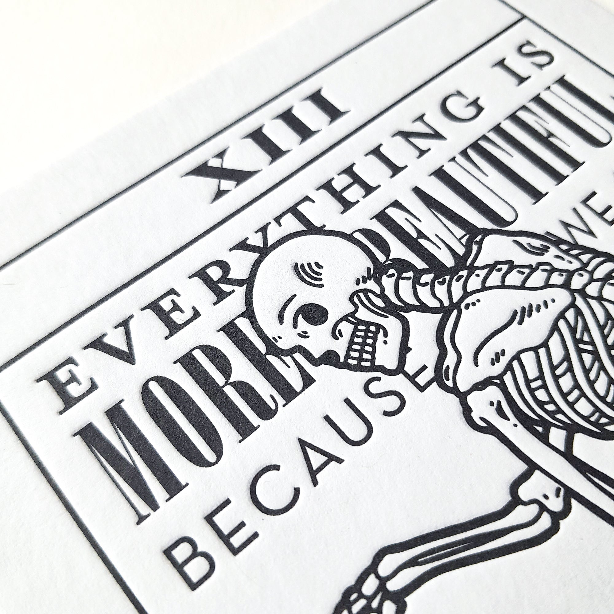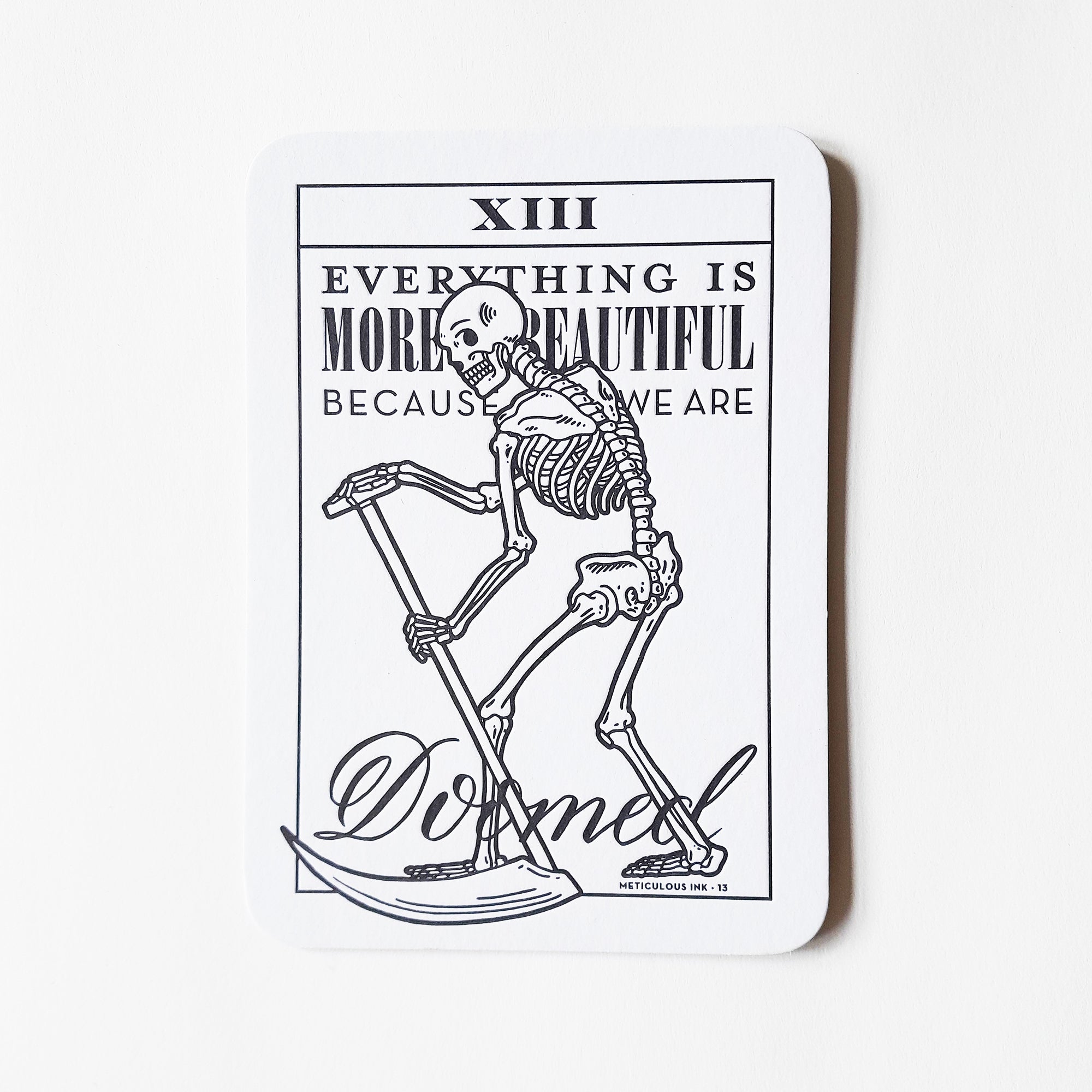 Created to mark Meticulous Ink's 13th Birthday, this postcard takes inspiration from the thirteenth tarot card, Death, combined with a very fitting and much loved quote from Homer's Iliad, "Everything is more beautiful because we are doomed."