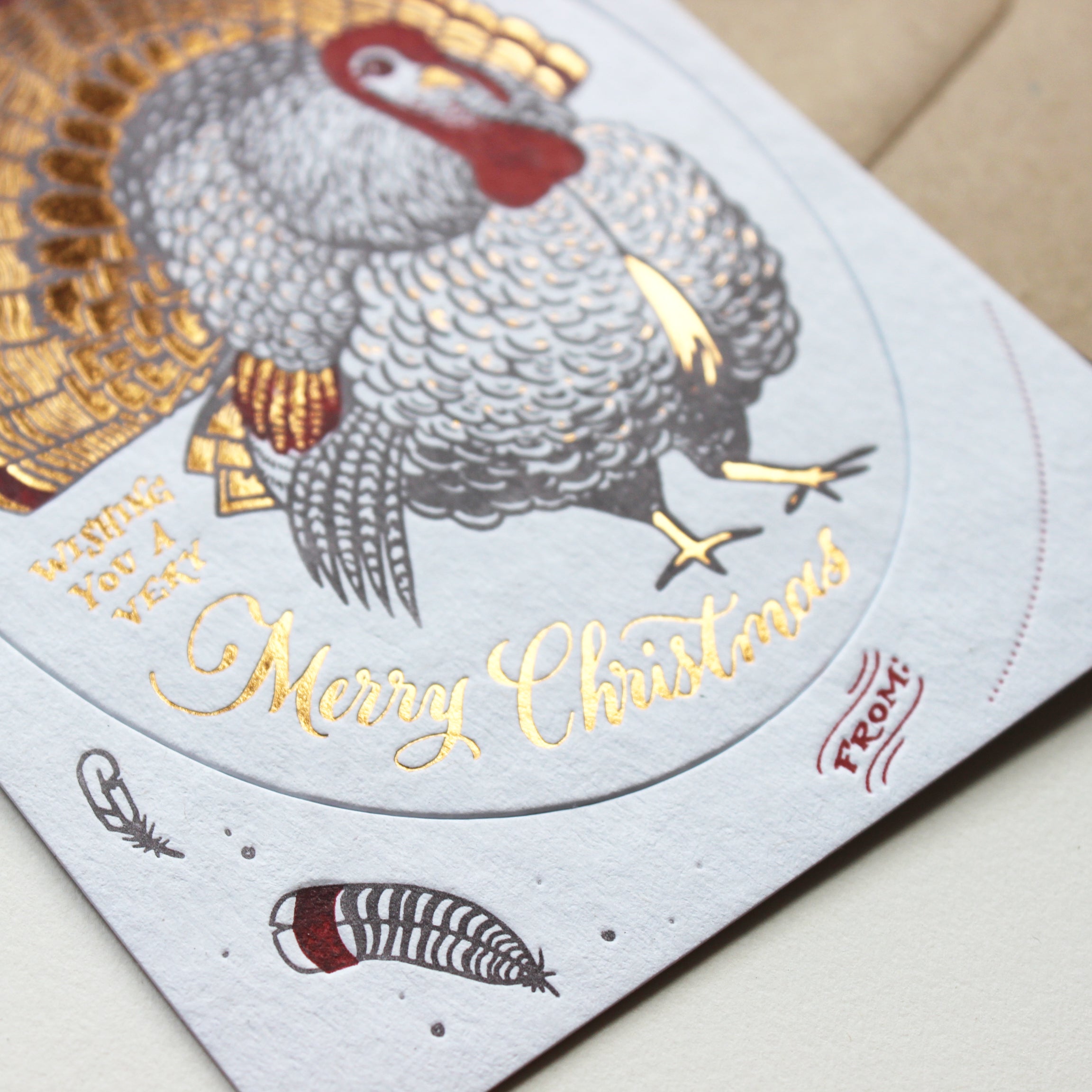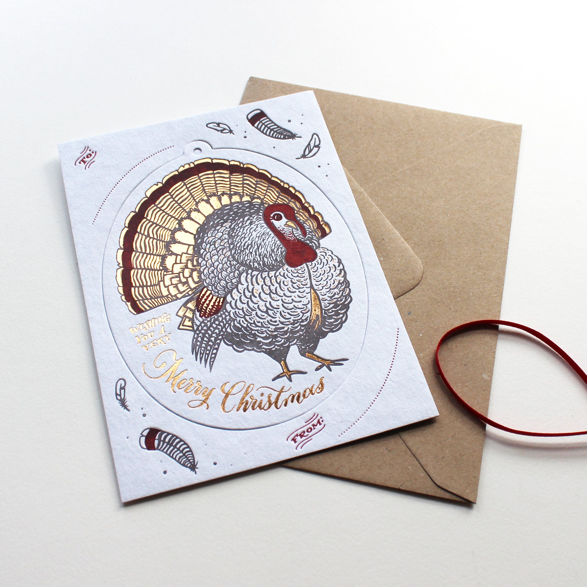 This lovely turkey is displaying its impressive feather plumage just for you! He’s letterpress printed, then foiled, before being die-cut, all at our printworks in Bath.