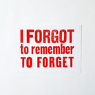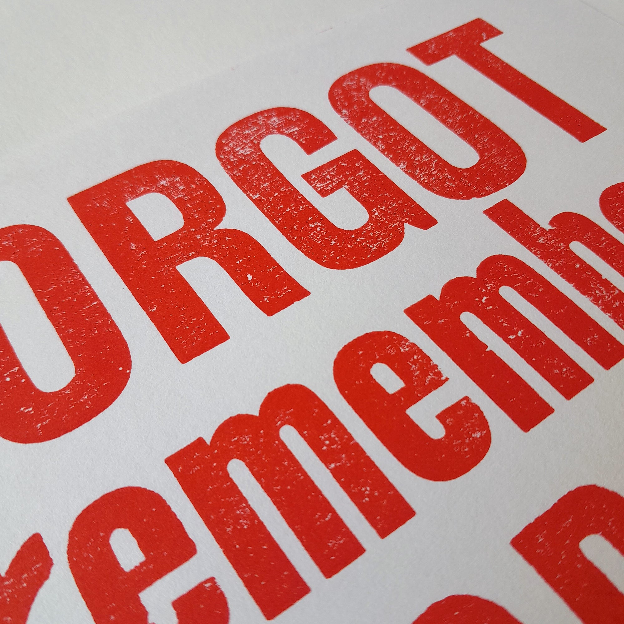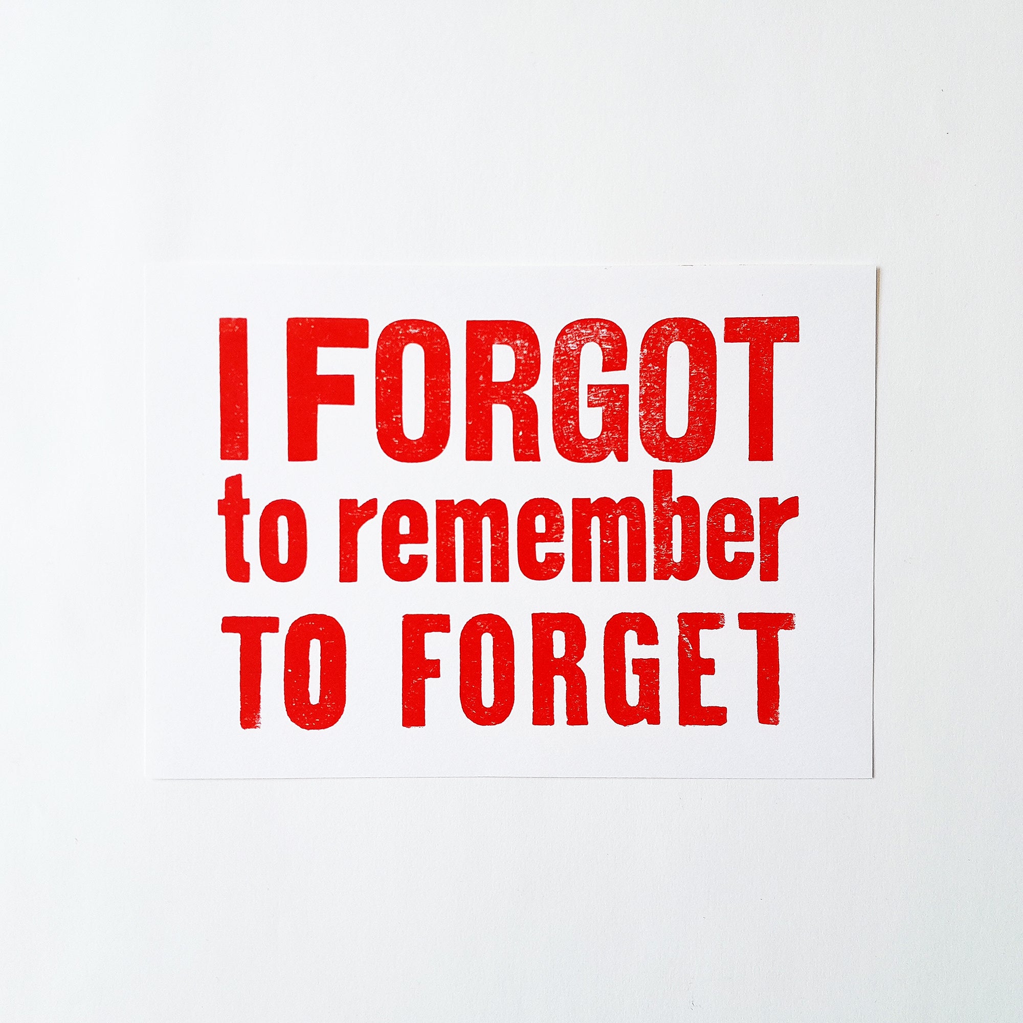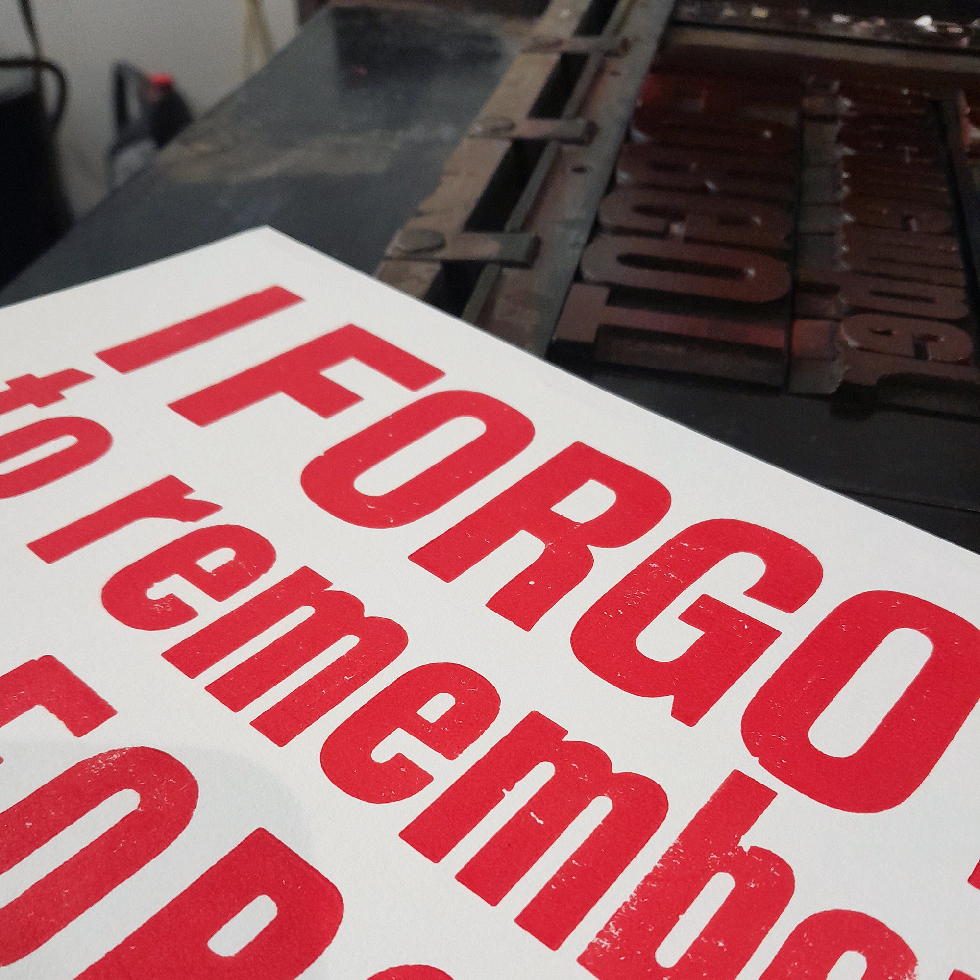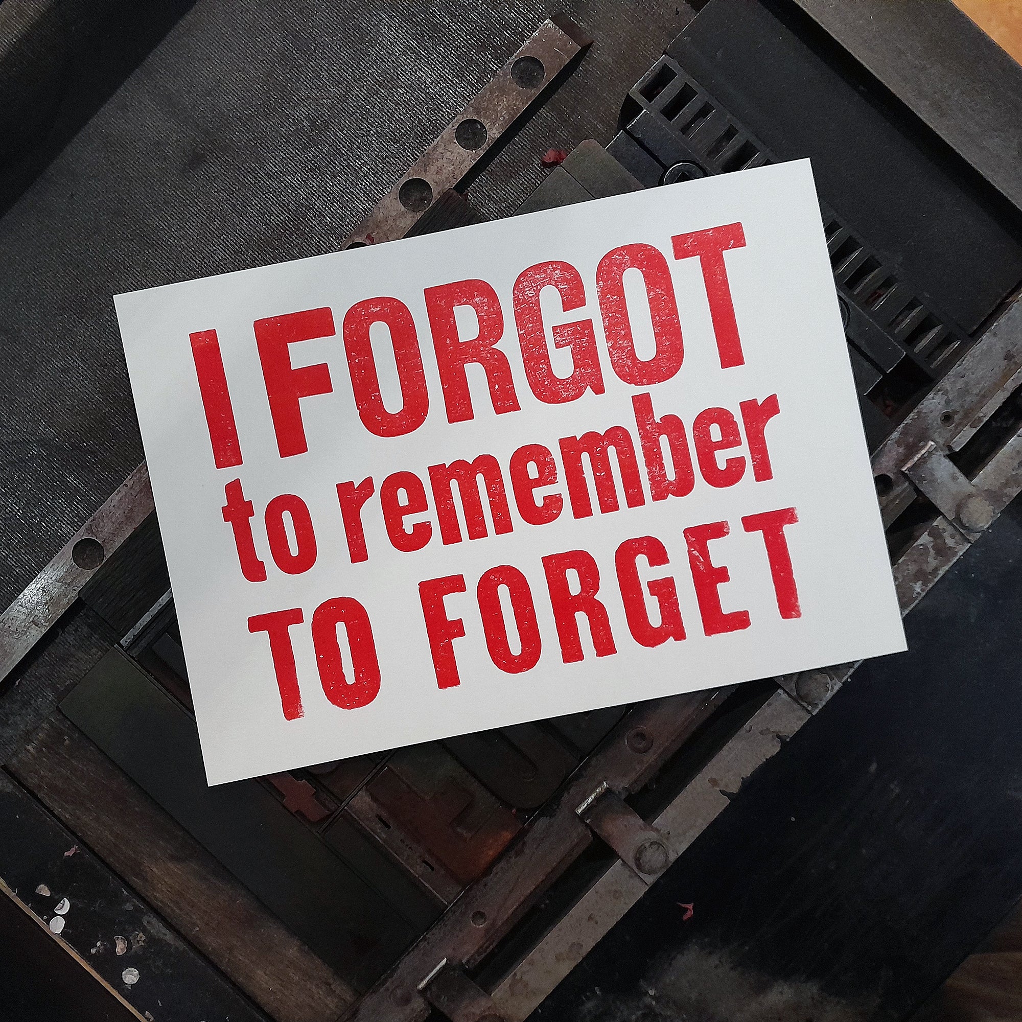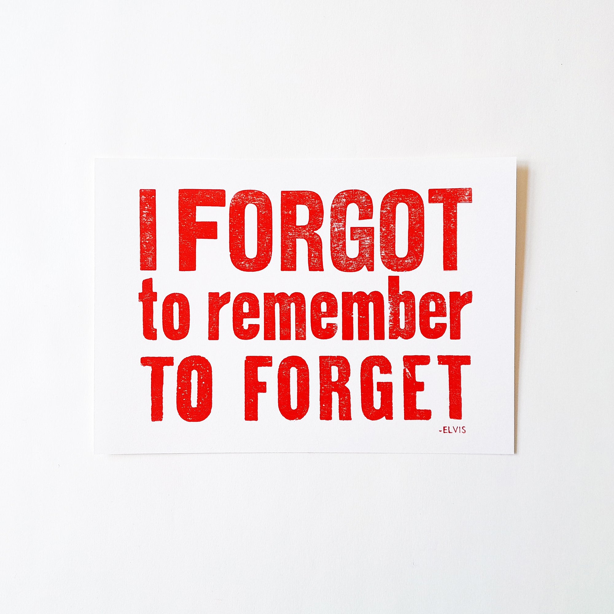 As said by Elvis, "I forgot to remember to forget". This limited edition typographic print is traditionally typeset using chunky sans serif wood type and produced on our Stephenson Blake proofing press.