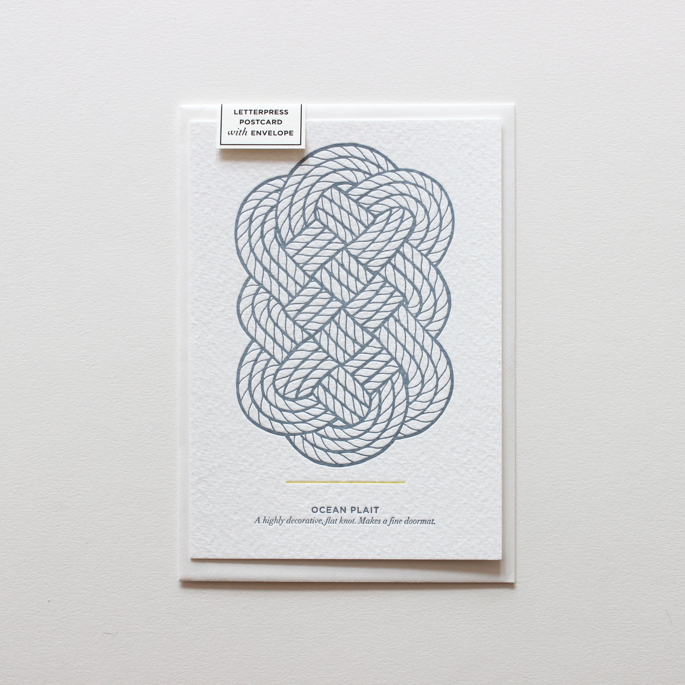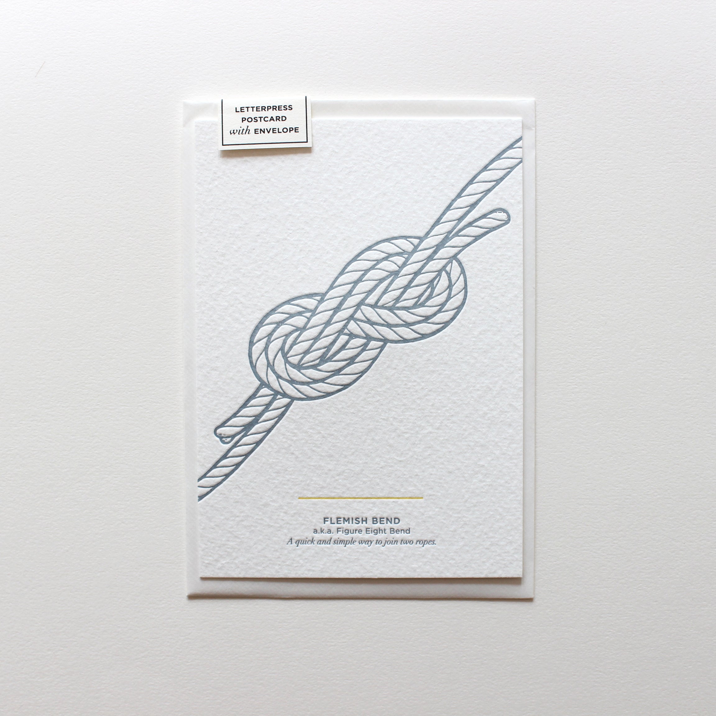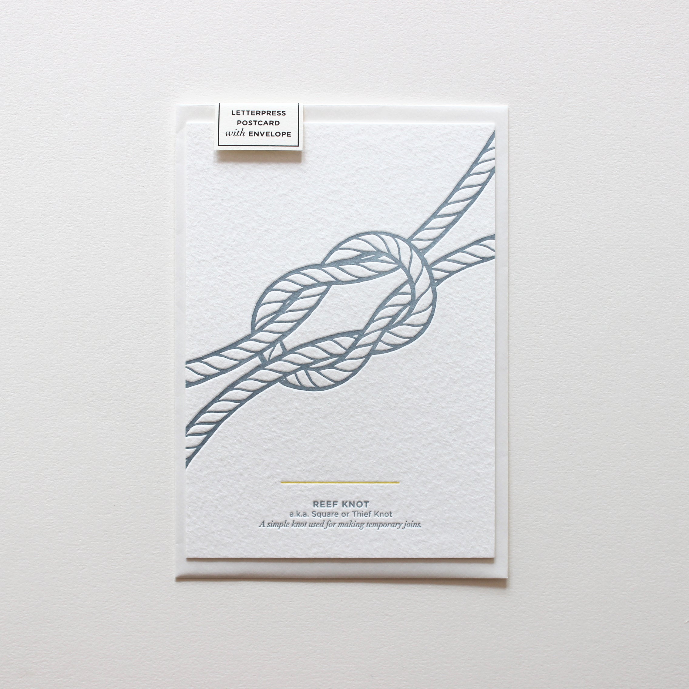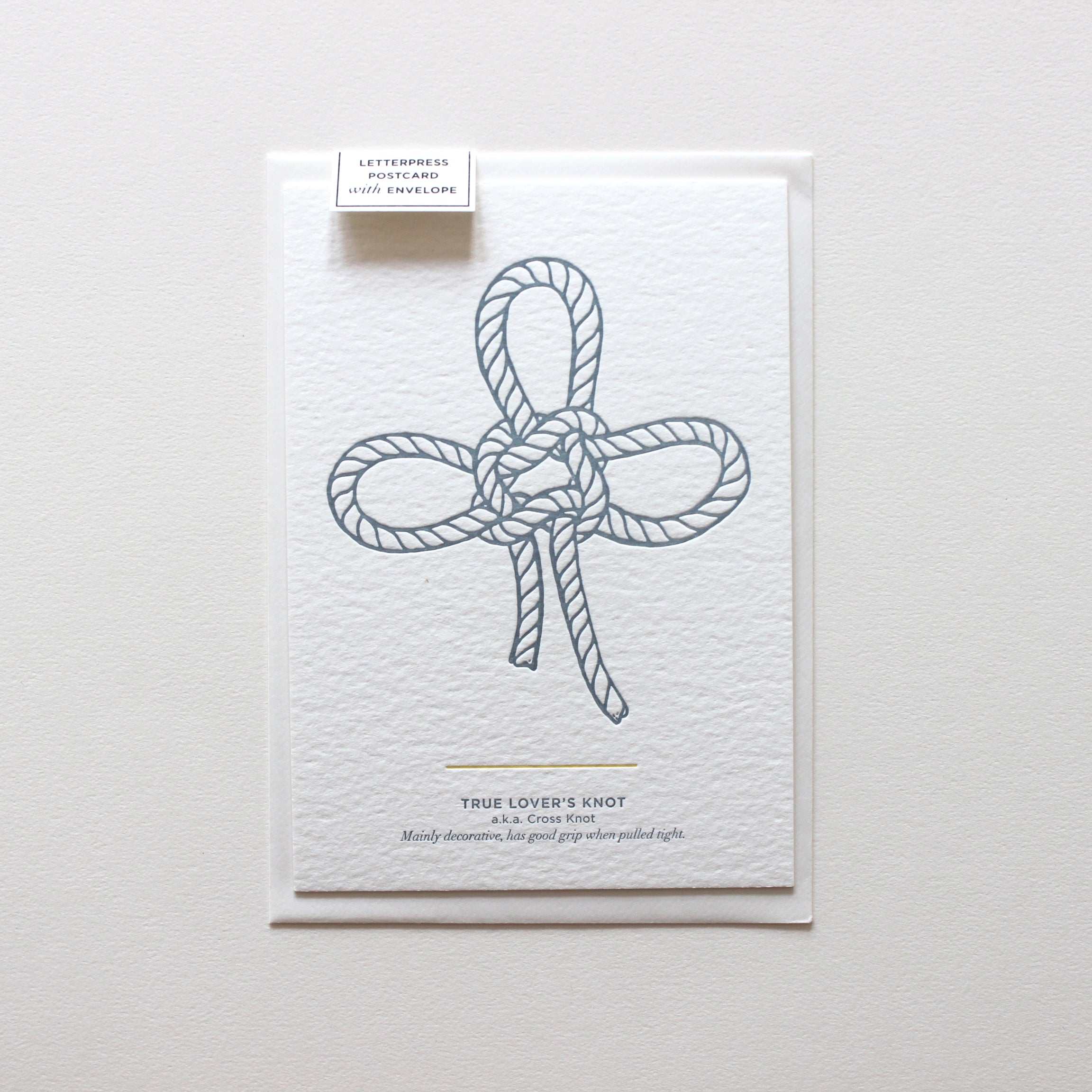 Letterpress postcards featuring a knot illustration along with brief description. The reverse side features a classic postcard layout left blank for your own message.