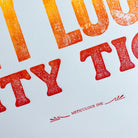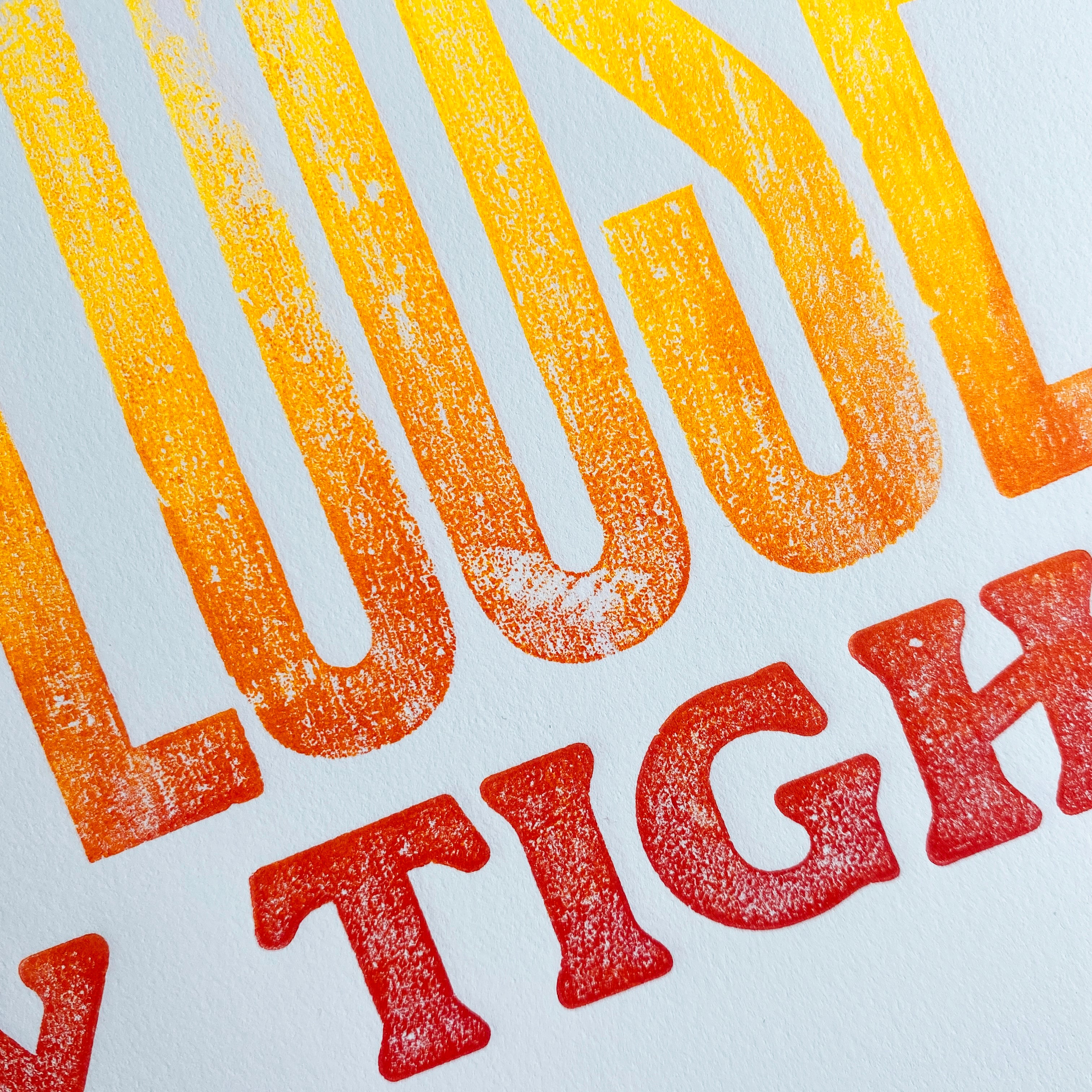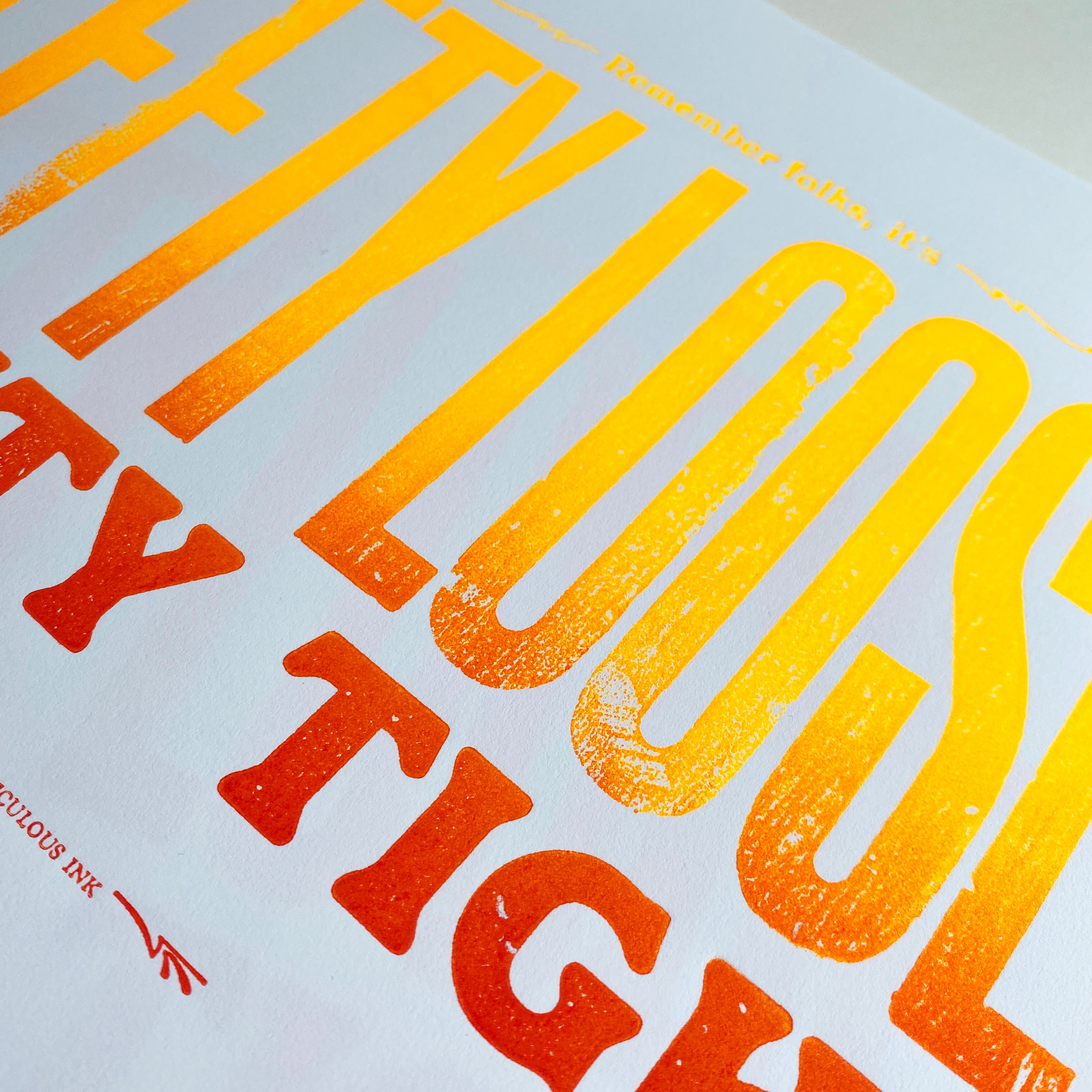 This limited edition run of 30 are individually numbered in pencil and printed on beautiful Original Gmund 100% cotton paper. Each print is re-inked by hand between pressing, meaning none are exactly alike and you'll be receiving an utterly unique art print. Featuring that beautiful salty finish associated with letterpress, in neon yellow 803 and fading into vibrant red 1787.