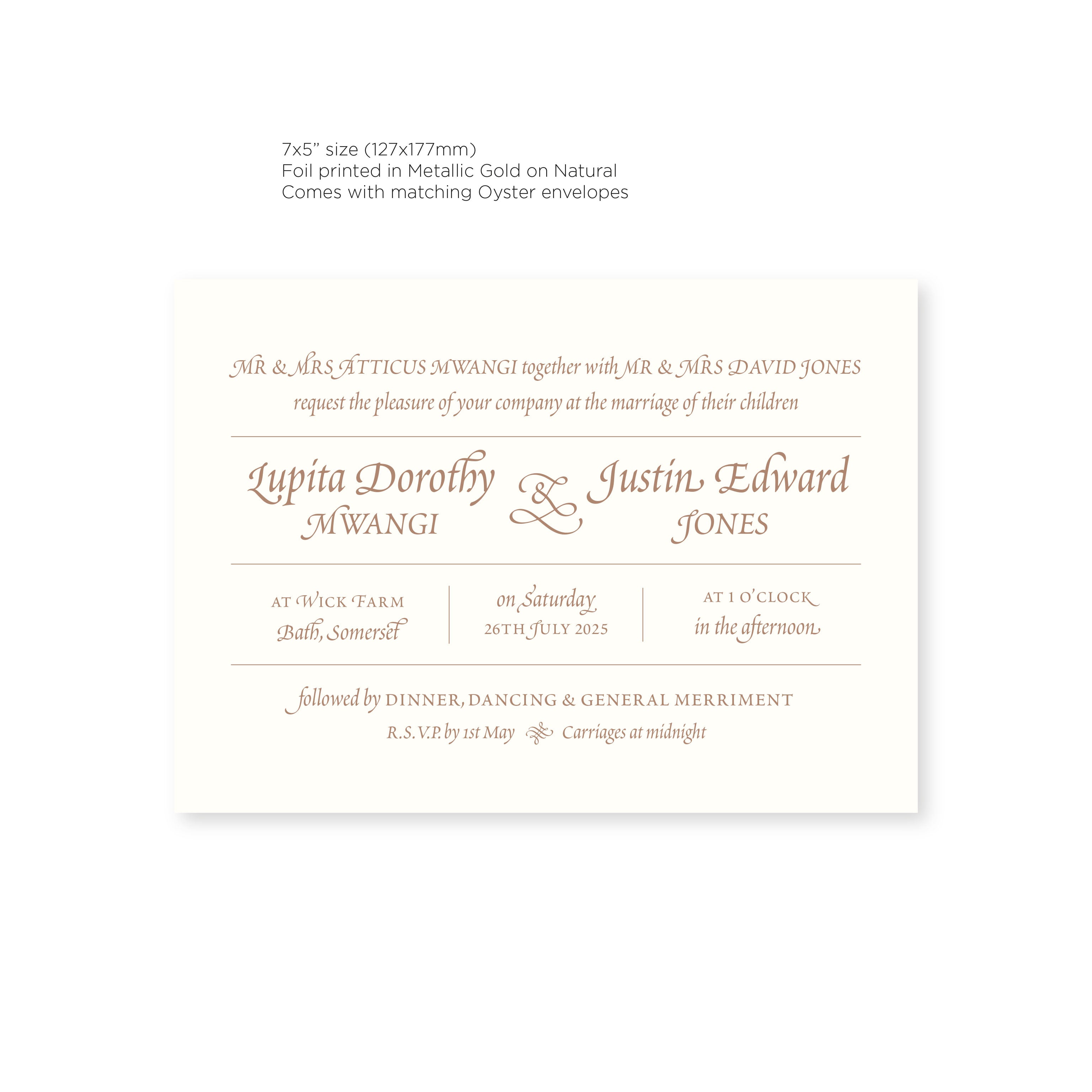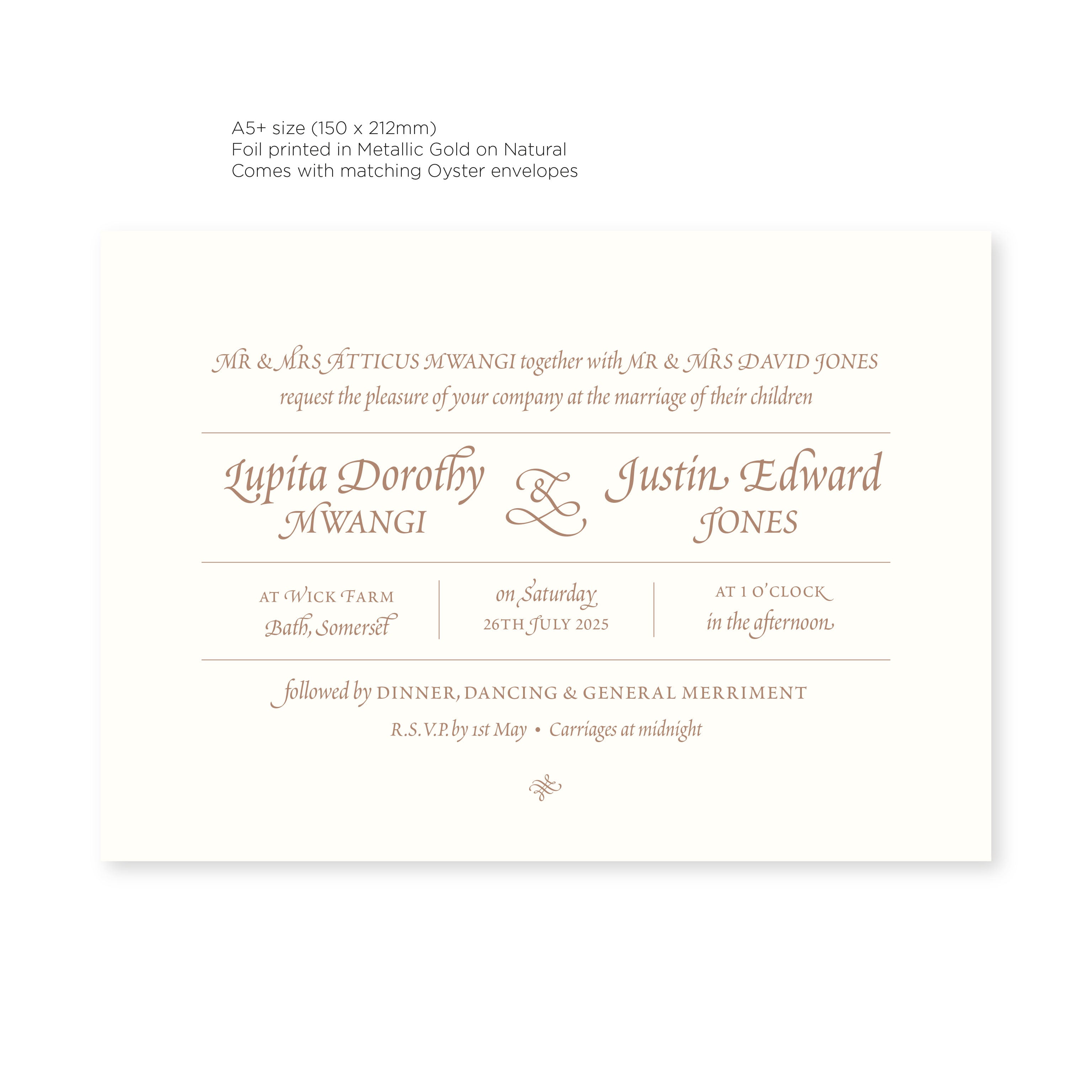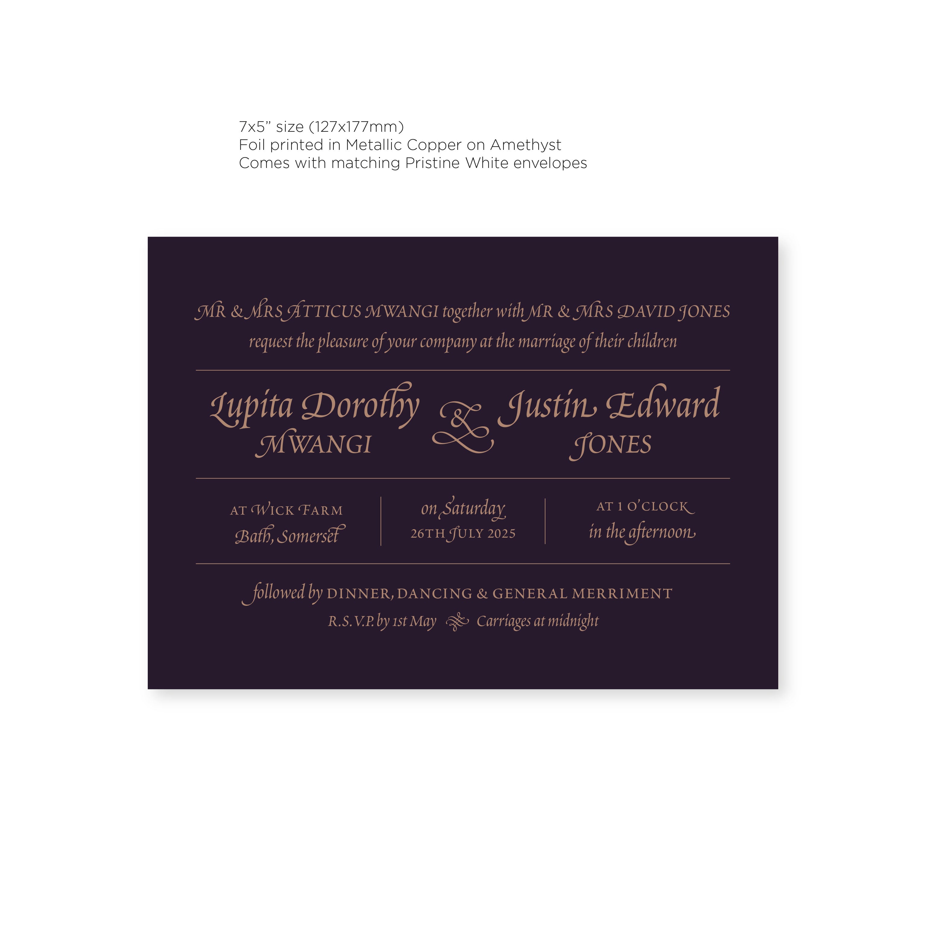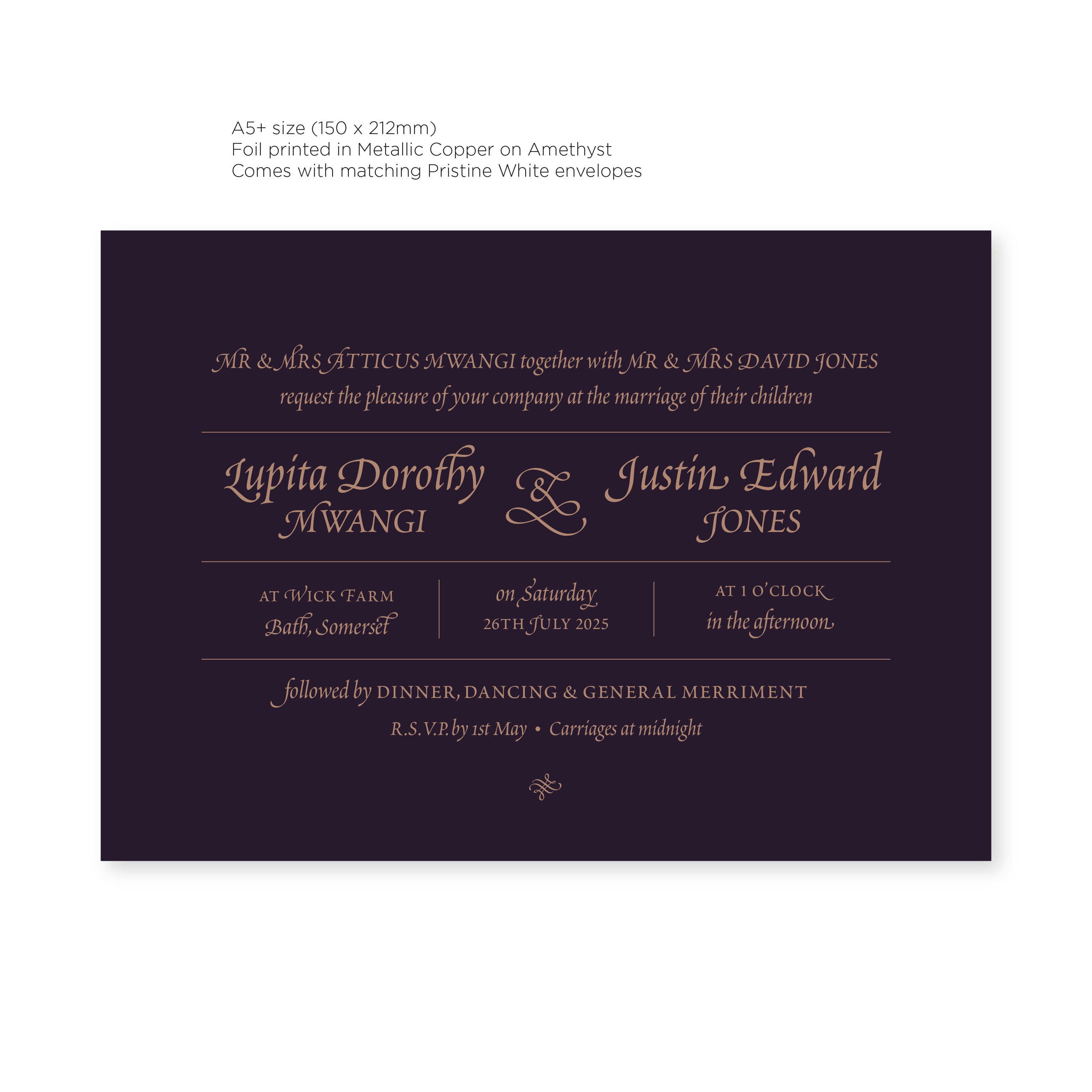 Elevate your special day with our luxurious Ready-to-Order Wedding Invitations. Let the elegance of gold and copper foil reflect the tone of your big day. Our Renaissance styled invitations use classical type in a contemporary fashion, with mixed fonts and elegant embellishments. Choose from two stunning colour options - Gold on Natural or Copper on Amethyst, as well as two sizes.