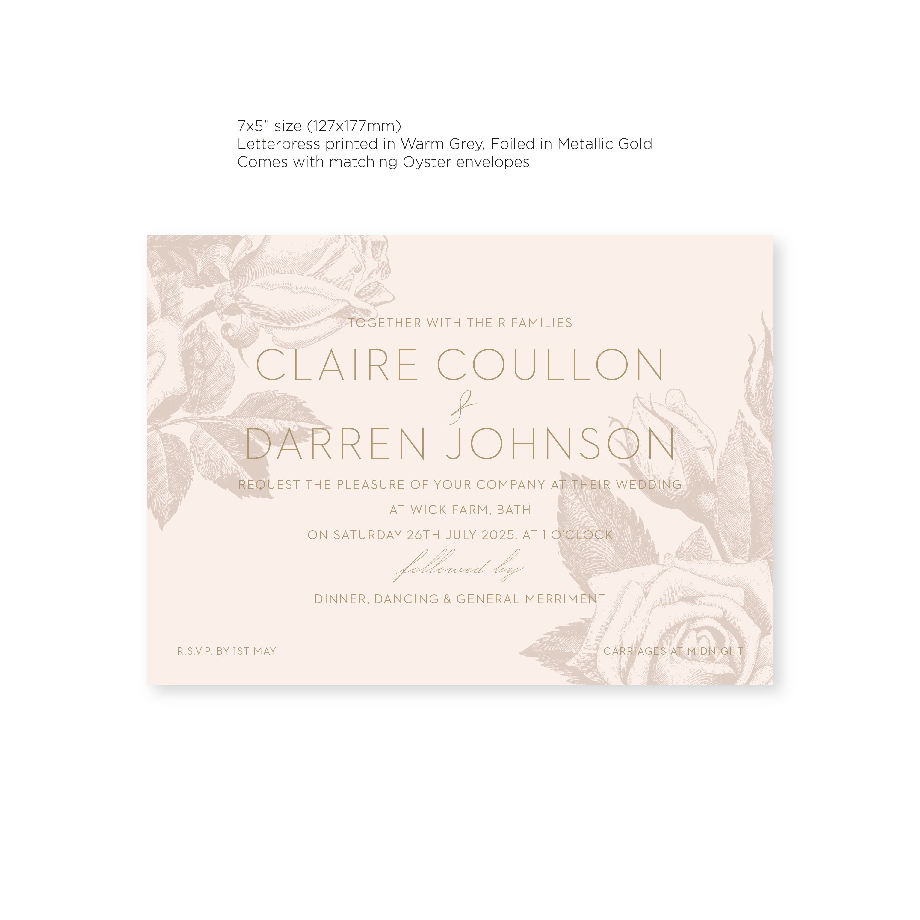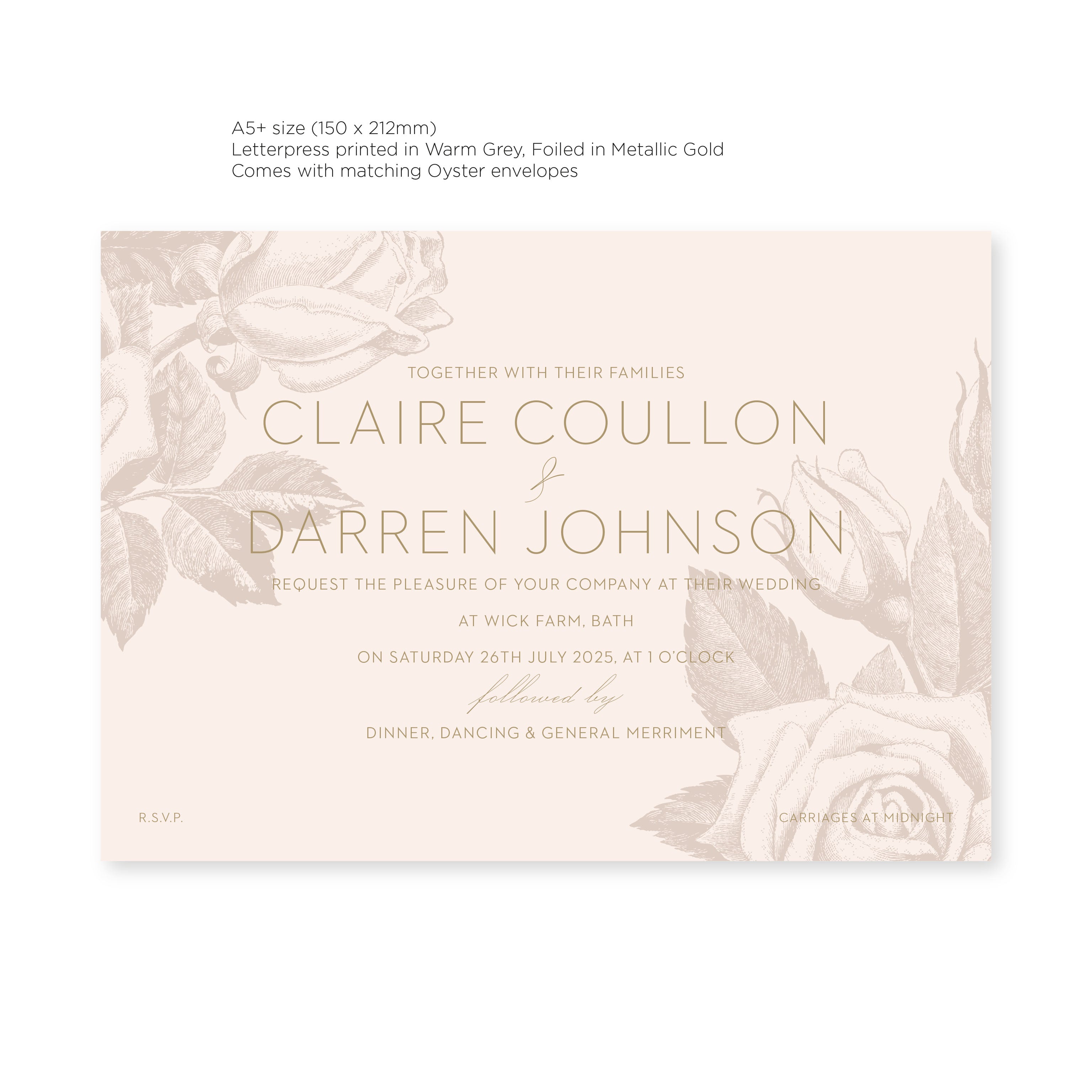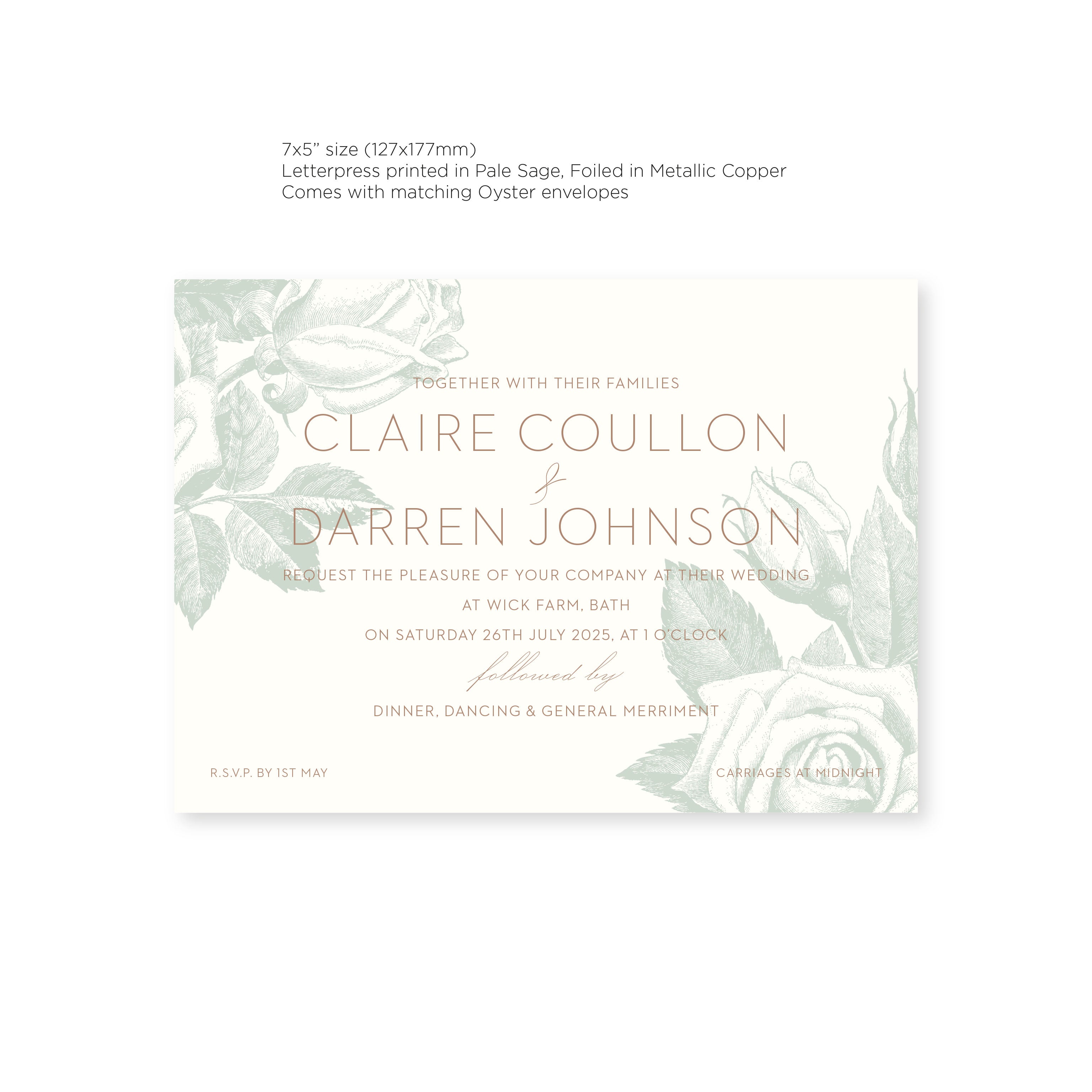 Elevate your special day with our luxurious Ready-to-Order Wedding Invitations. A botanical classic brought up to date with mixed type and foiling, this invitation features a beautiful rose motif printed subtly in the background, with delicate text in front. This invitations combines letterpress and foil printing onto thick 540gsm card. Choose from two stunning colour options - Green and Copper on Oyster or Grey and Gold on Vellum, as well as two sizes.