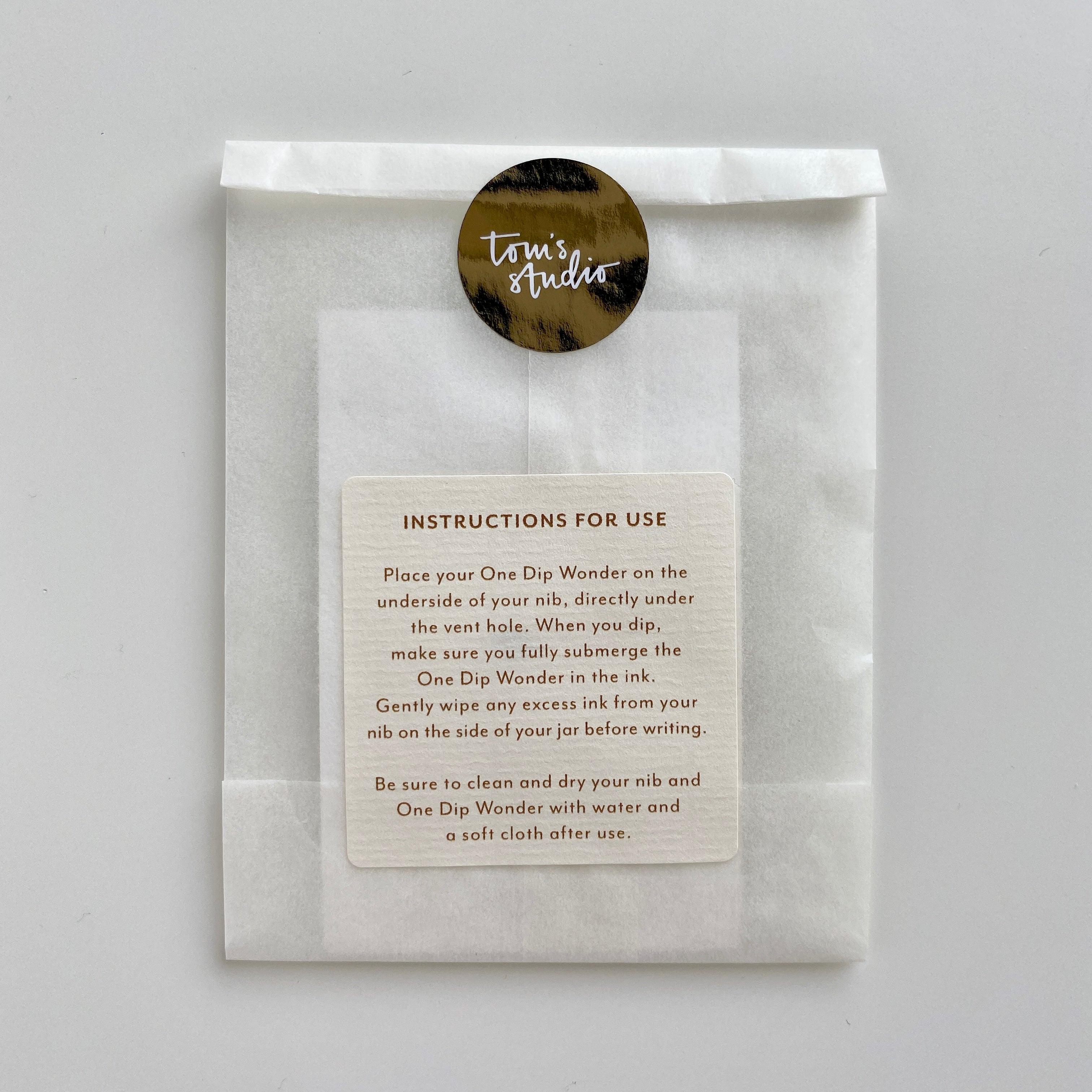 Simply place it on the underside of your nib directly beneath the vent (that's the hole in your nib). Dip into your ink as you normally would, making sure you submerge the One Dip Wonder ink the ink too, then write to your hearts content. This fantastic reservoir will hold 5 to 7 times more ink than your nib alone.