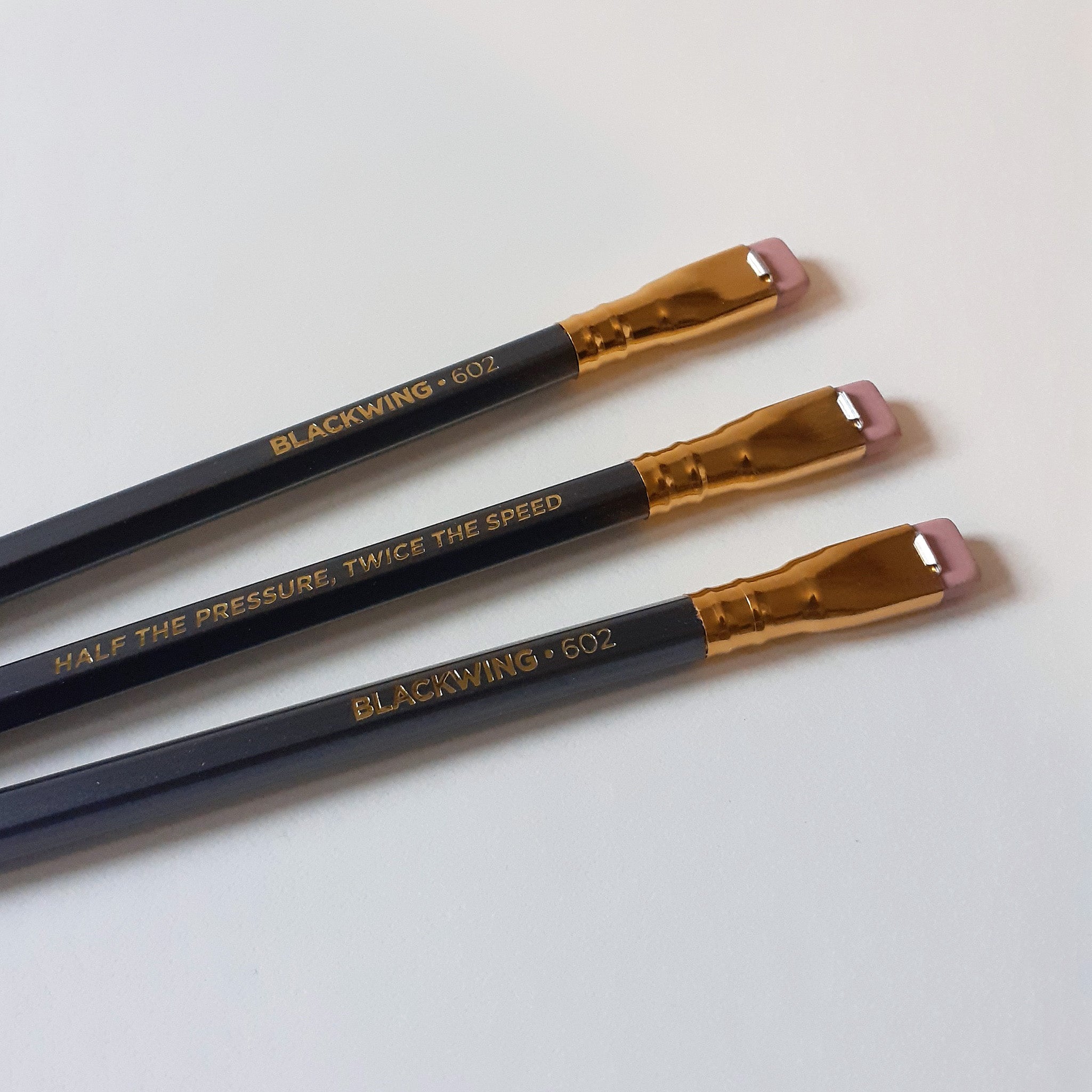 The Blackwing 602 features a firm and smooth graphite core that helps it deliver on its promise of “Half the Pressure, Twice the Speed.” Blackwing 602 pencils feature a gunmetal grey finish and iconic square Blackwing ferrule with a pink rubber.