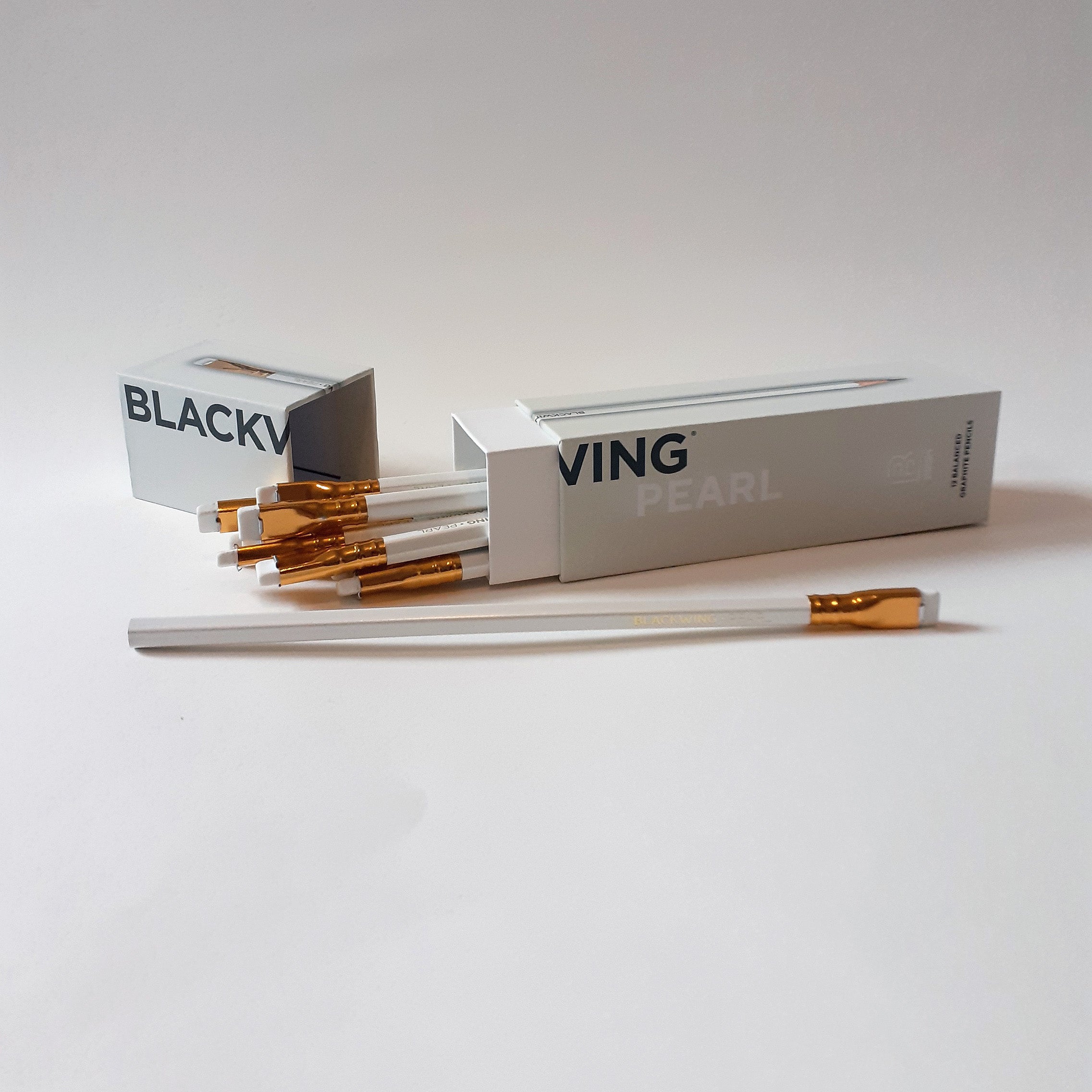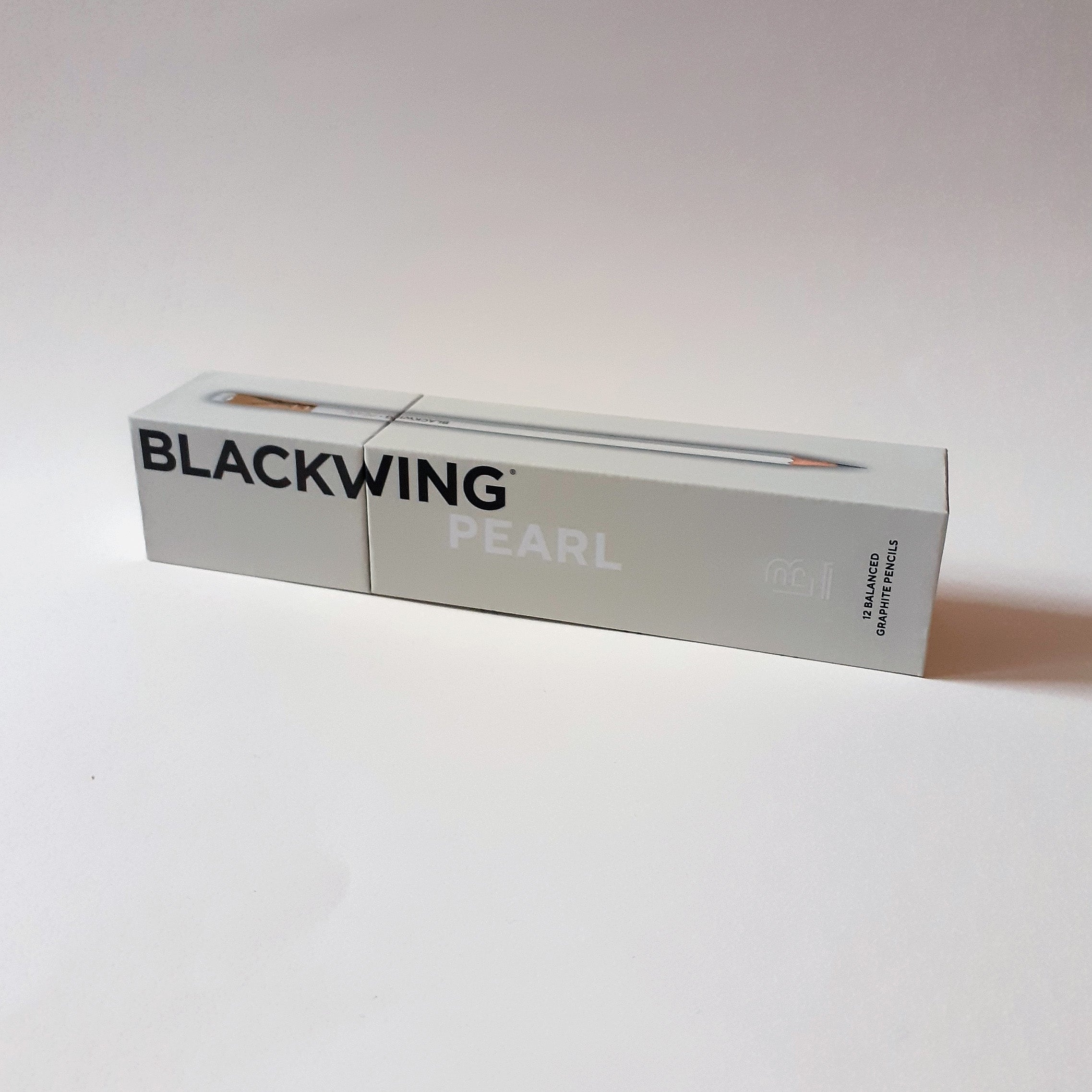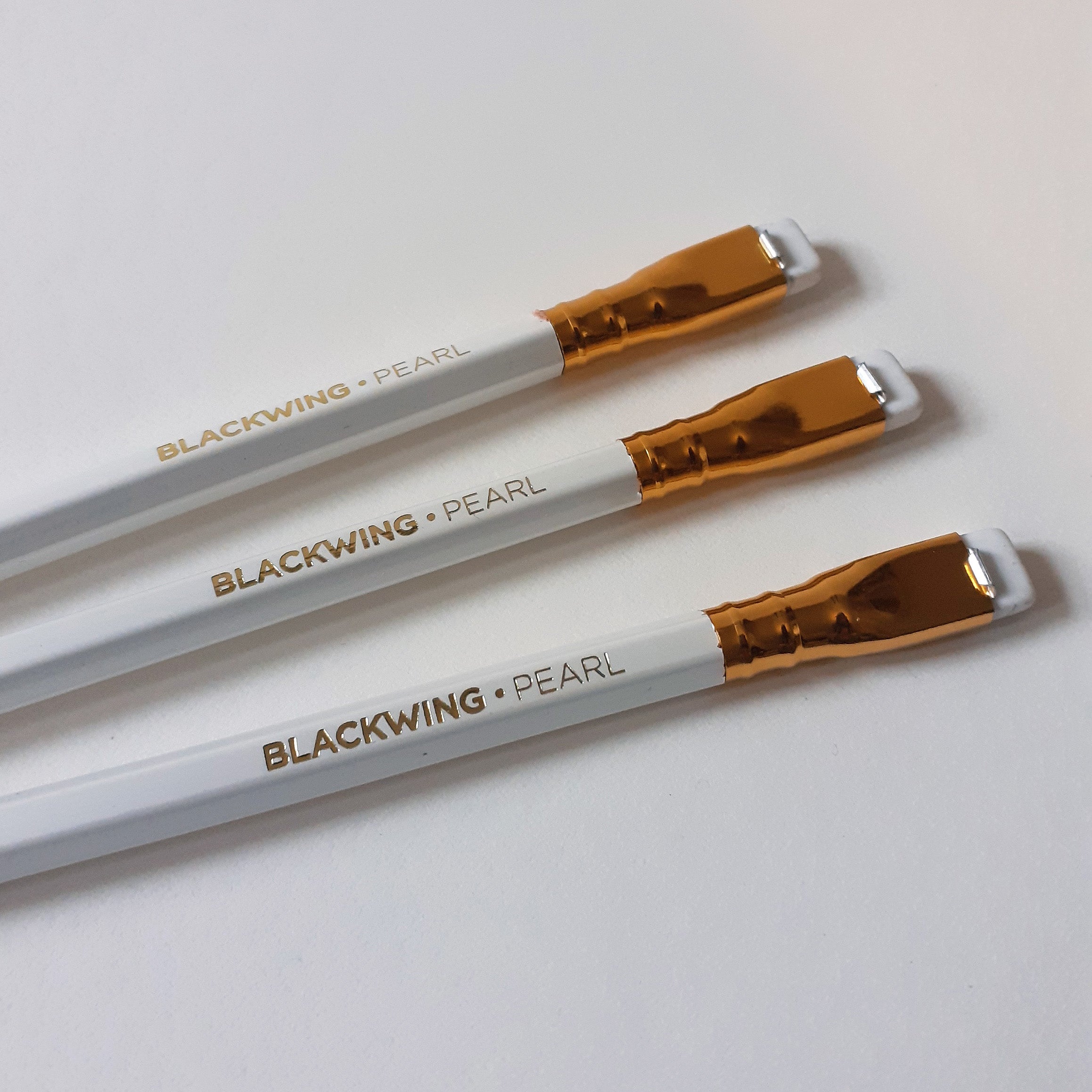 The Blackwing Pearl features a pearl white finish, gold imprint, white rubber and a balanced and smooth graphite core that is softer than the graphite found in the Blackwing 602, but firmer than the graphite found in the Blackwing Matte.