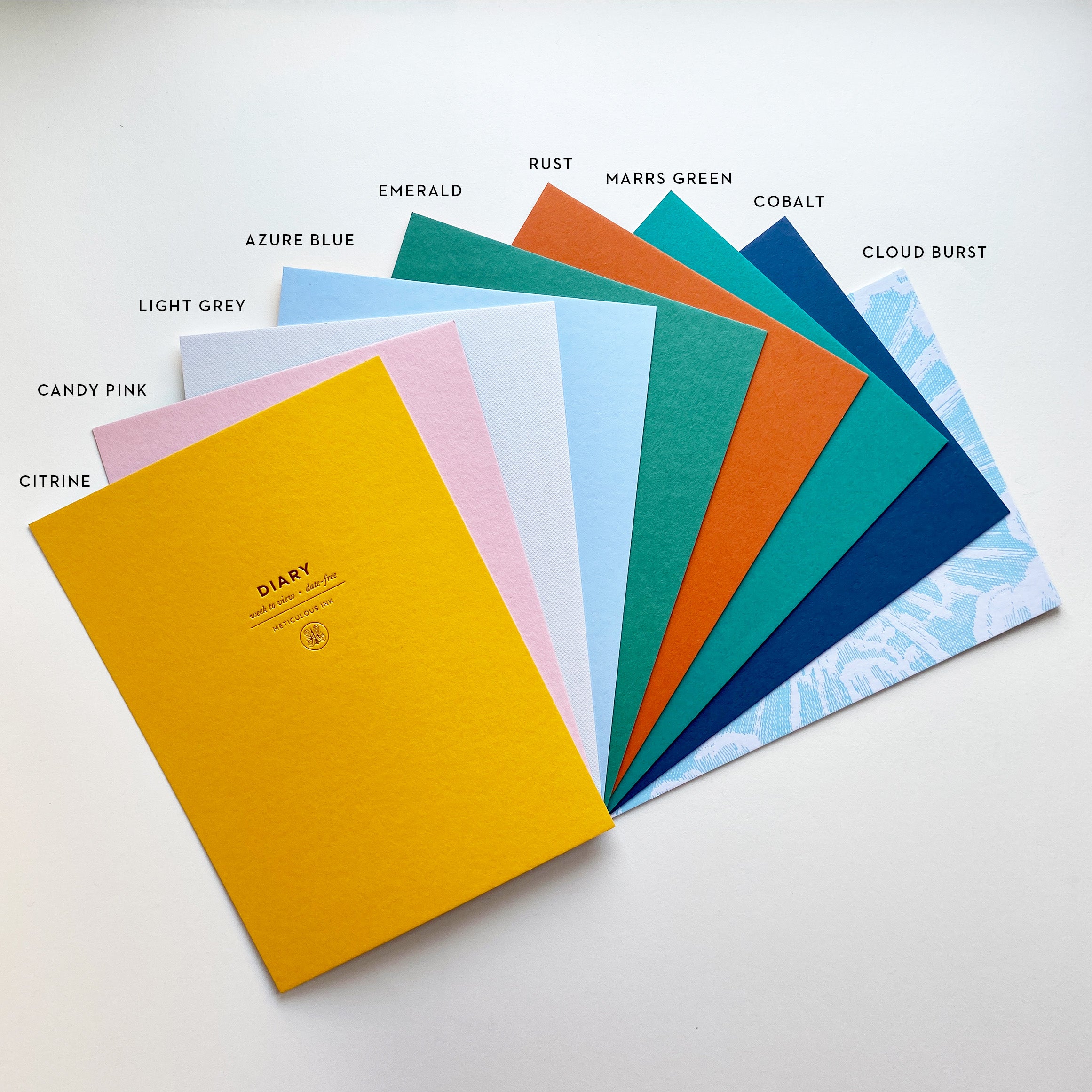 The coloured covers are foil printed on our 1960s Heidelberg Windmill press with the word "Diary" and our Meticulous Ink logo onto sturdy 540gsm board. Each one is duplexed to a second colour on the inside cover.