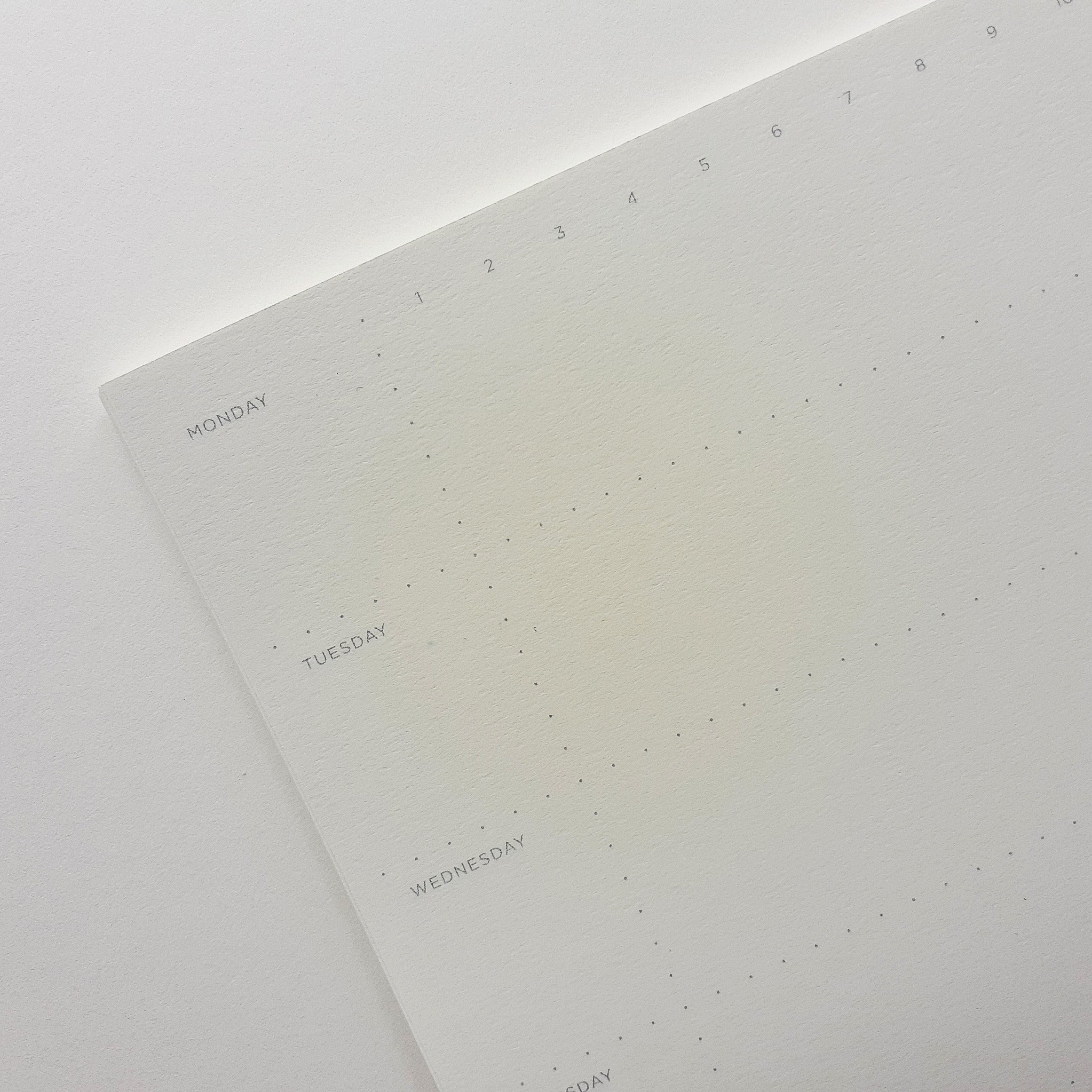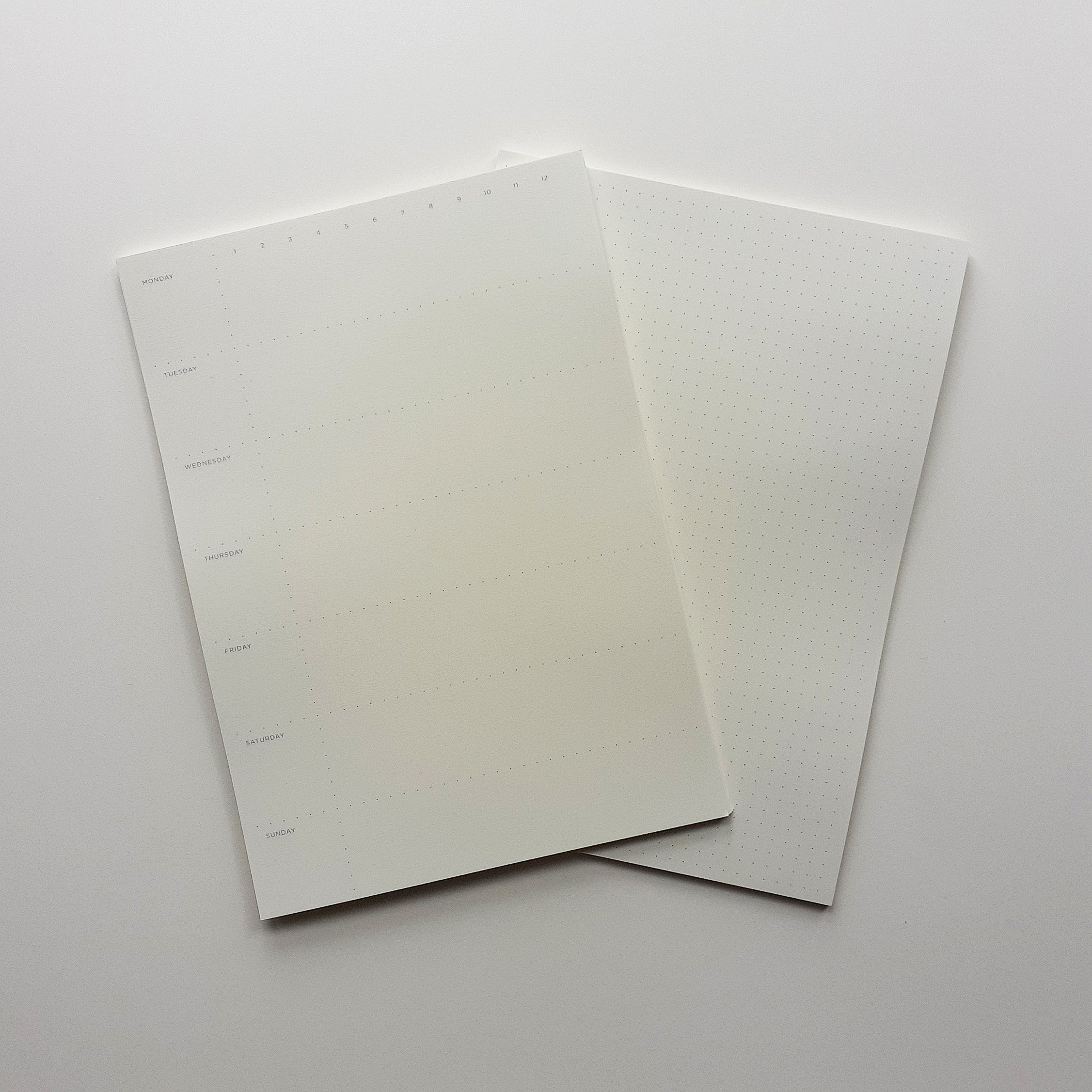 Perfect at any time of year, these feature a page per week, left undated for you to fill in as needed. Simply circle the month along the top and pop in the date under each week day. Each week also has an accompanying plain dotted page on the right for notes, drawings, lettering or anything else.