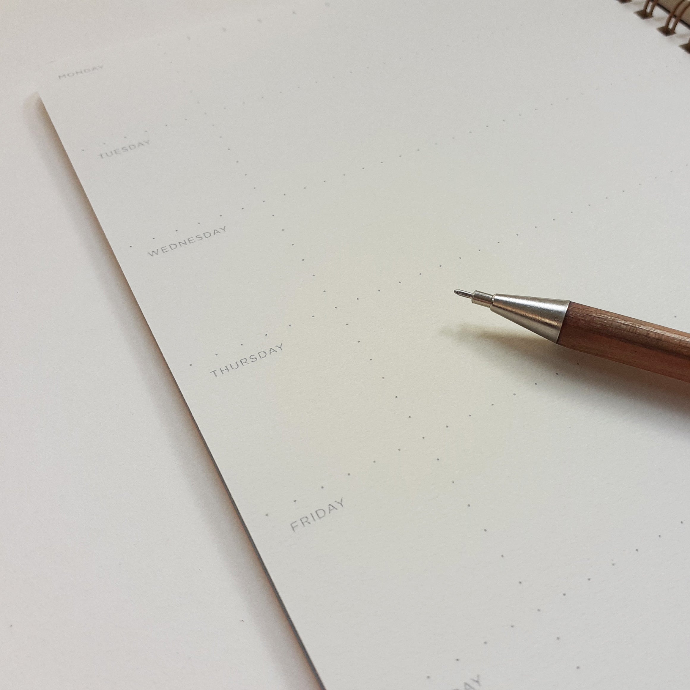 All diaries are A5 size and spiral bound with a sturdy 790gsm greyboard back cover. The stock used is a lovely uncoated 140gsm paper in Natural. It has passed our meticulous standards for suitability with all pens including calligraphy dip pens, brush pens and fountain pens.