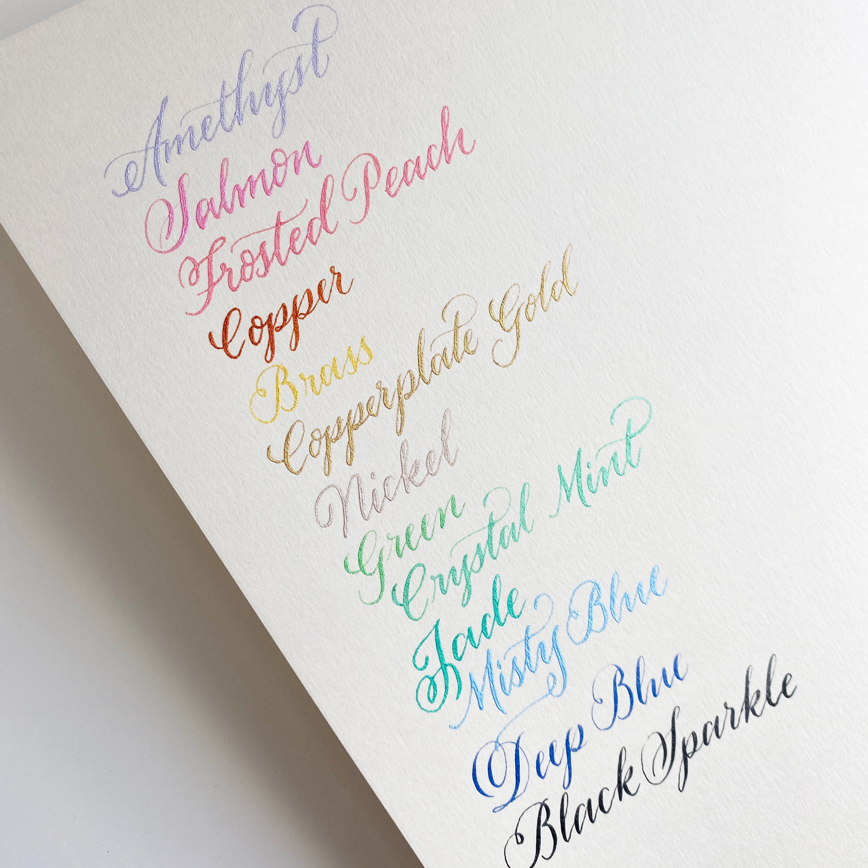 Dr Ph Martin's Iridescent Calligraphy inks are beautiful, shimmering metallic colours that are waterproof, lightfast and permanent when dry. Perfect for covering both light and dark papers, card, metal, wood and even certain plastics. With an even, steady ink flow, these are ready to use straight from the bottle. We've found these do require a good and frequent shake as the pigments will settle at the bottom.