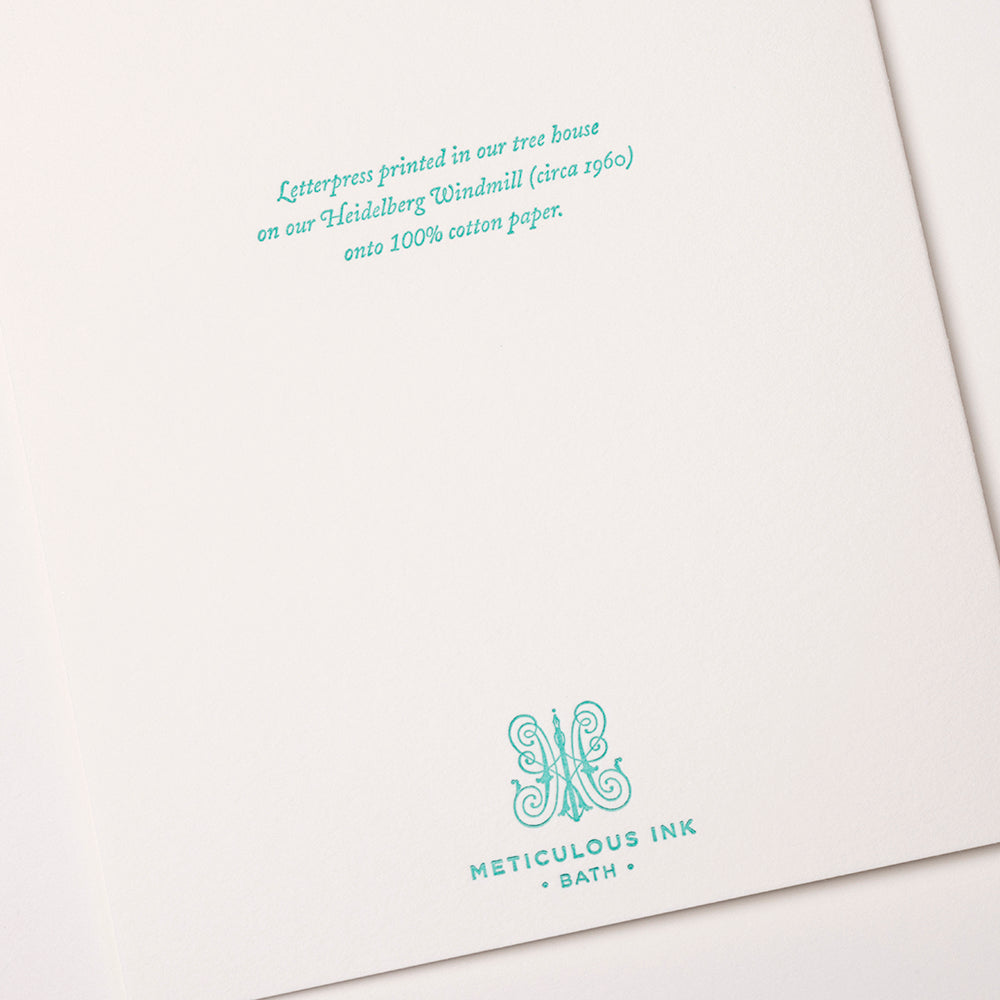 All our cards are illustrated, designed and printed in house at Meticulous Ink, Bath, UK. Each card has been lovingly letterpress printed on a 1960 Original Heidelberg Windmill.