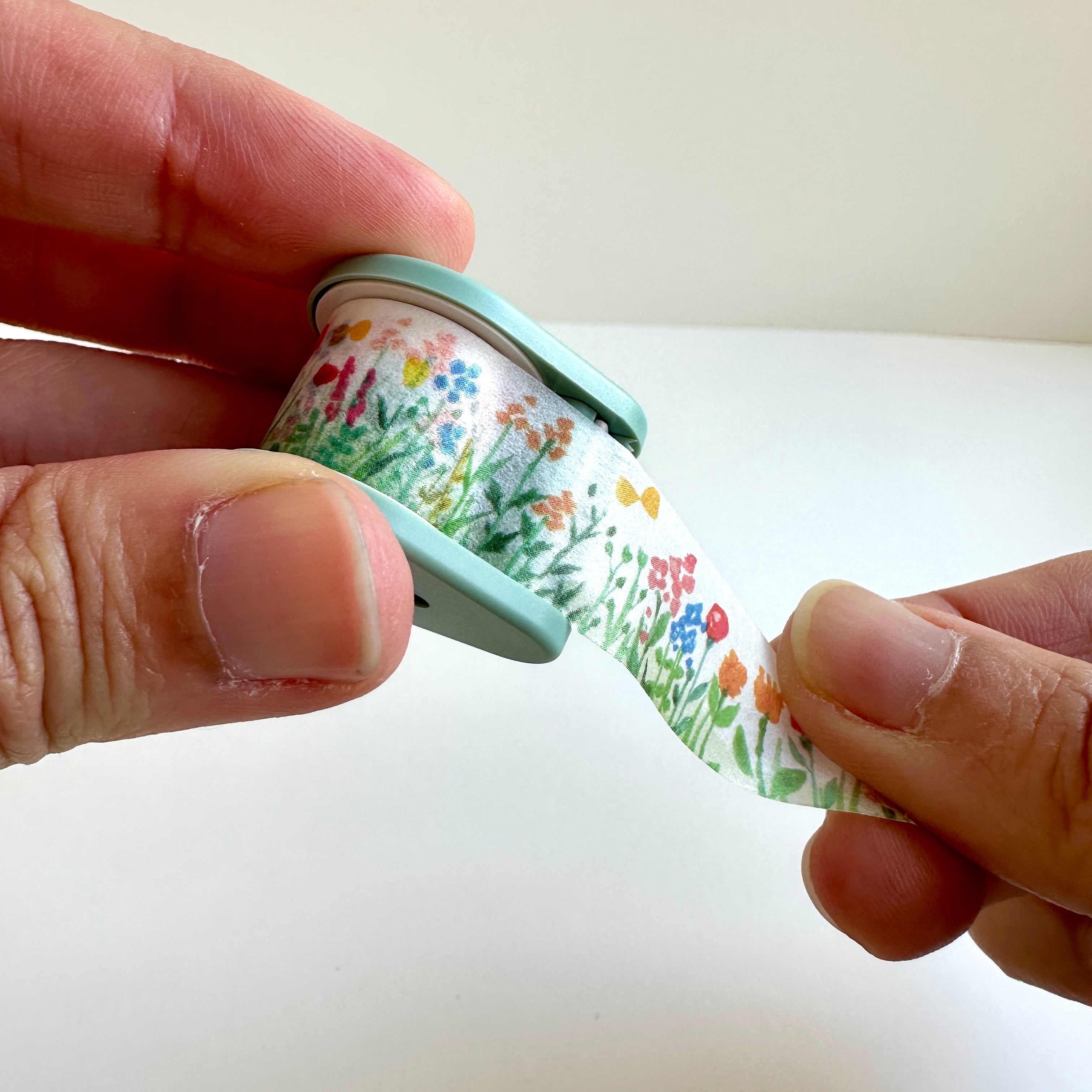 To insert a bobbin, pull the two sides apart, insert the washi tape loaded bobbin, then clip the two sides together. The serrated cutting edge will give you neat washi tape pieces of your desired length.