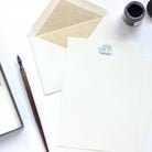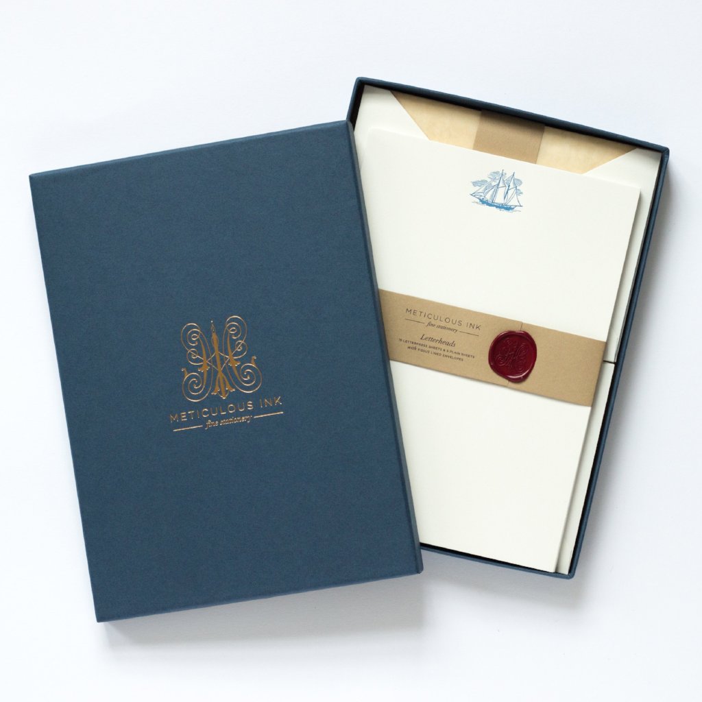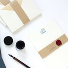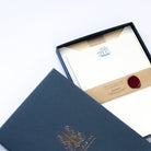 Each box set contains 15 printed A5 sheets, letterpress printed in sea blue ink onto our very own 160gsm, 100% cotton paper. With 15 tan tissue lined C6 envelopes, and 5 plain continuation sheets, all presented in a beautiful box and finished with our wax seal.