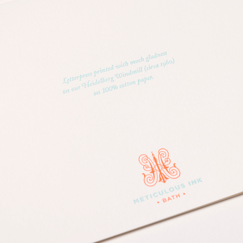 All our cards are illustrated, designed, and printed in house at Meticulous Ink, Bath, UK. Each card has been lovingly letterpress printed on our 1960s Heidelberg Windmill printing presses.