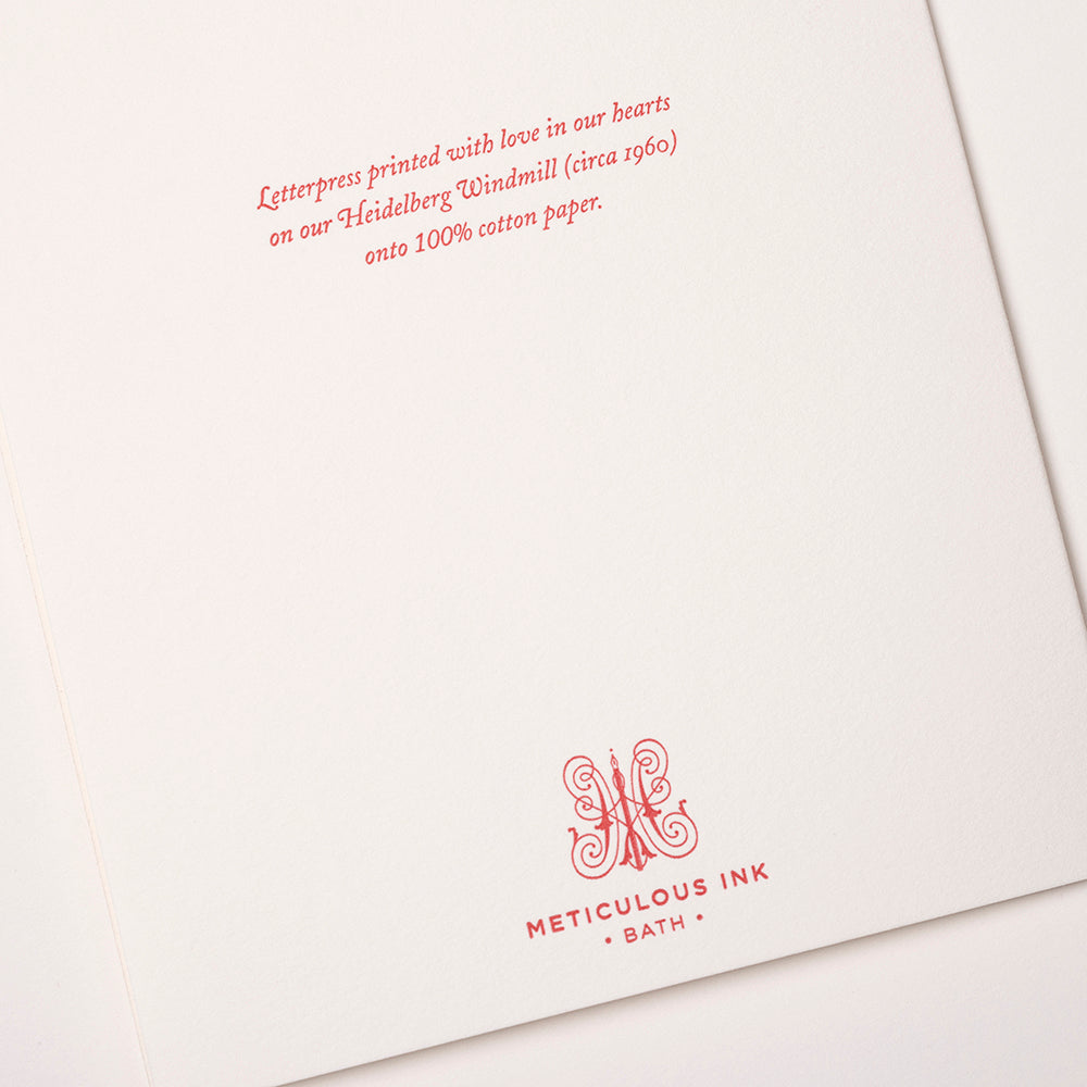 All our cards are illustrated, designed and printed in house at Meticulous Ink, Bath, UK. Each card has been lovingly letterpress printed on a 1960 Heidelberg Windmill using only the finest oil based inks.
