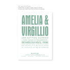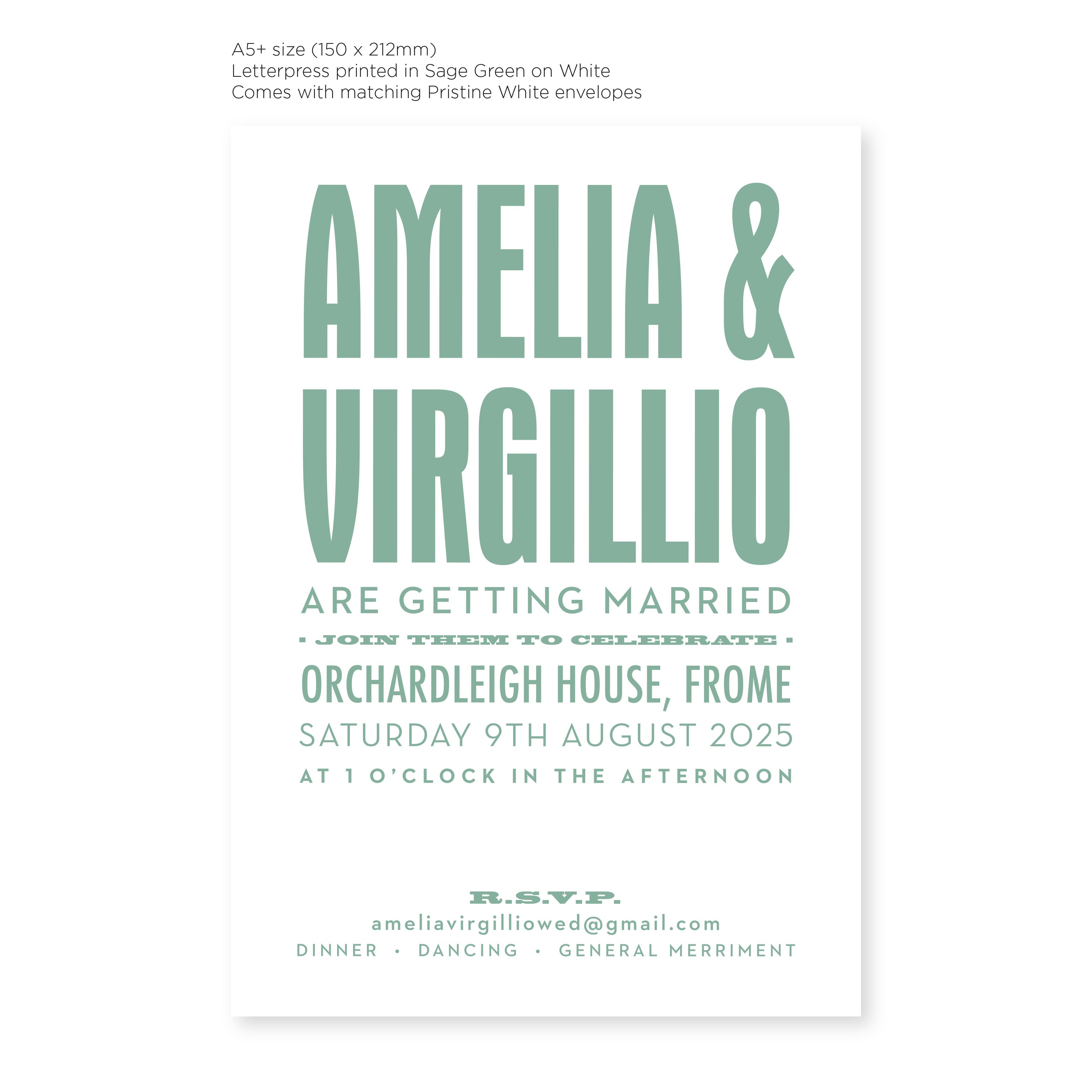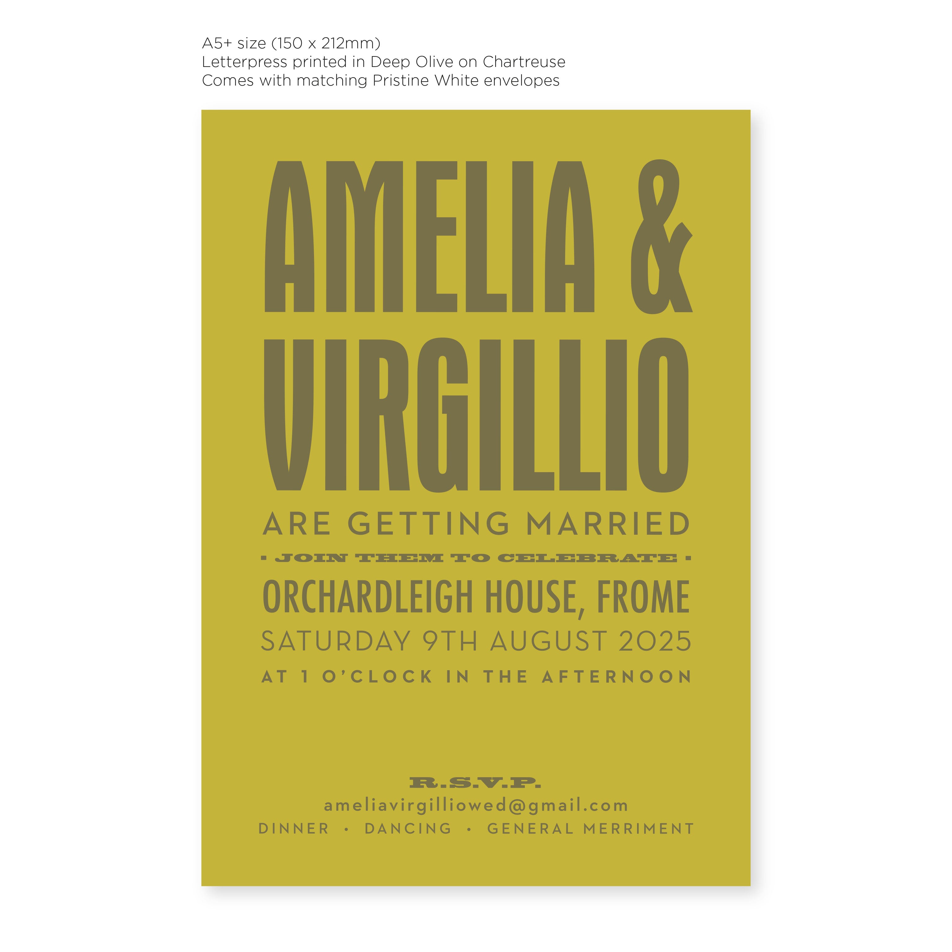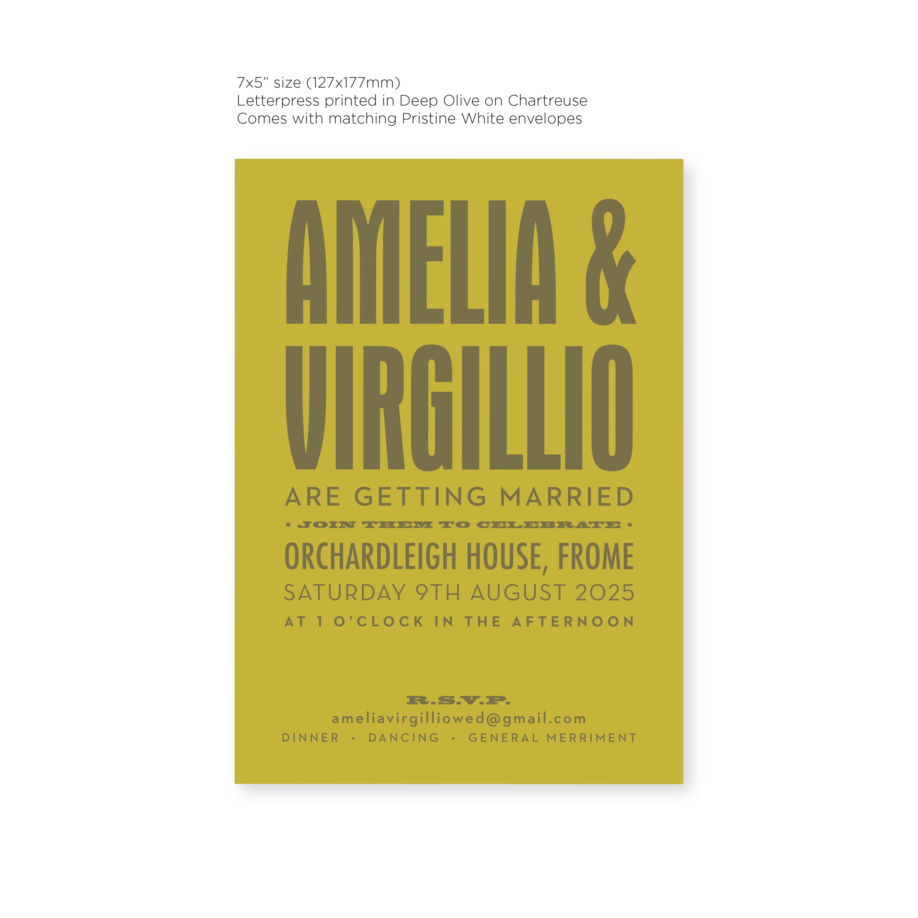Elevate your special day with our luxurious Ready-to-Order Wedding Invitations. A bold, contemporary design with simplified text that lets the layout speak for itself. This design is letterpress printed in one colour onto thick 540gsm card. Choose from two stunning colour options - sage green or chartreuse & olive, as well as two sizes.