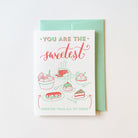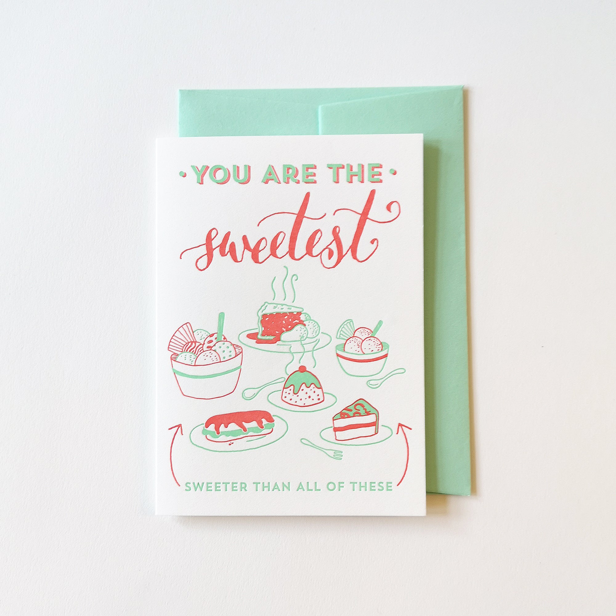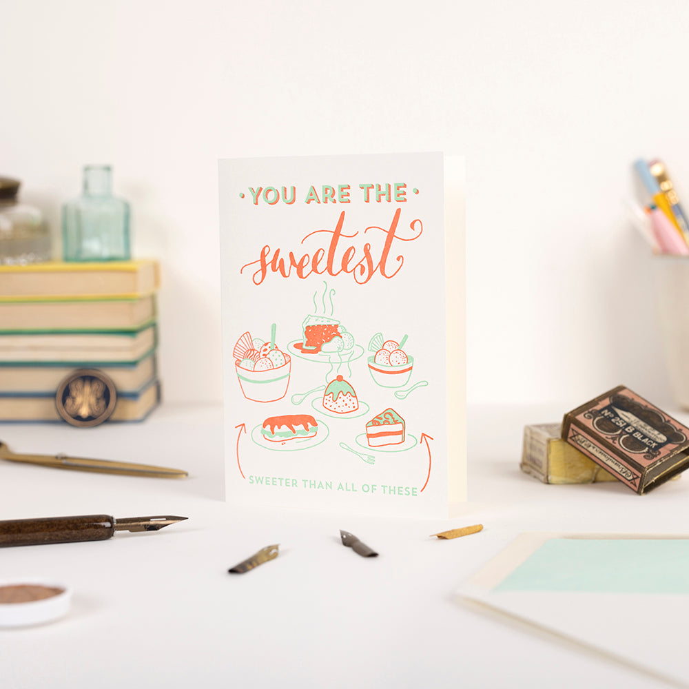Each single card is letterpress printed in mint and warm red ink onto 300gsm oyster. Supplied with a Park Green wallet flap C6 envelope.