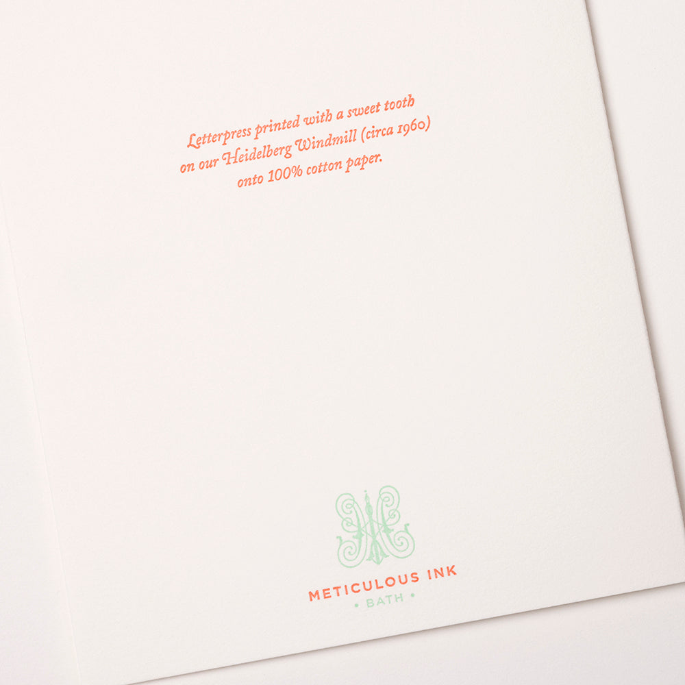 All our cards are illustrated, designed and printed in house at Meticulous Ink, Bath, UK. Each card has been lovingly letterpress printed on our 1960s Heidelberg Windmill printing presses.